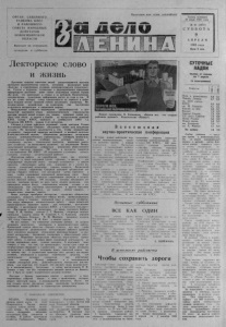 ОРГАН С Е ВЕ Р НОГ О РАЙКОМА КПСС И РАЙОННОГО СОВЕТА НА Р ОДНЫХ ДЕПУТАТ ОВ НОВ ОСИБ ИР С КОЙ ОБЛАСТИ Выходит по вторникам, четвергам и с убботам. Пролетарии всех стран, со единяйтесь! И Лекторское слово и жизнь Д у х о вны е запросы советских людей удовле творяю тся могучим арсеналом идеологических сре дств, которыми рас п о л а г а е т наше о бщ ее !во в современных условиях коммунистического строительств а. Газеты и ж у р н а лы , телевизоры и радиоприемники ежедневно информируют население д а ж е самых о тдаленных уголков страны обо всем, что происходит в с т р а н е и з а р уб еж ом . Политическая, э кономическая , ку л ь т у р н а я и нформация рас тет из го д а в год. И все ж е слово лектора , слово п р о па г ан ди ста не теря ется в небыв ало мощном потоке сведений самоГо разл ичного х а р а к т е р а . Непосредственно воздействуя на аудиторию , они 'за служенно пользуются ав торитетом и ув аж е н и ем нар о д а . Вооруженные глубоким пониманием з акономерностей и особенностей нынешнего э т а п а коммунистического строительств а лекторы щедрой мерой отдаю т эти зн ан ия , помогают лучше осозн а т ь свое место и з а д а ч и в борьбе з а осуществление решений XXVI с ъ е з д а КПСС, майского и ноябрьского (1982 г.) , Пленумов ЦК КПСС, планов 11-й пятилетки. Сегодня в стране дей ству ет огромный о тр яд лекторов. Только Всесоюзное общес тво «Знание» о б ъ е д и н я е т свыше трех миллионов человек. Их призвание зак лю ч а е тс я в том, чтобы осн ов ательно р а с к р ы в а т ь творческий х а р а к т е р внутренней и внешней политики Коммунистической партии, убедительно р а з ъ я с н я т ь ак ту ал ьны е вопросы коммунистического строи тель ств а , у л у чш ать пропаганду экономических проблем, особенно тех, которы е св я з а ны с ускорением научно - технического прогресса, переводом н а р о д ного х о зяй ств а на интенсивное развитие , на реализацию П р о д о вольственной программы, д о би в ать ся повышения общественного созн ания советских г р а ж д а н . Об этом, в частности, говорится в постановлении ЦК КПСС «О дал ьн ейшем улучшении идеологической, политико - воспита тельной работы». Л е к т о р с к а я р аб о та на современном этапе, как отмечает « П р а вд а » в своей передовой с т а т ь е «Л ек то р и жизн ь», — это непрерывный творческий поиск, который углубля ется в живую практи ку, обеспечивает выбор гем, освещение их с учетом интересов конкретной аудитории , данного момента. Прошедший недавно пленум правления Северной районной организации о б щества «Знание» отметил, что лекторский ак тив стремится к тому, чтобы с о д е рж ан и е лекционной пропаганды ста ло более а к туальны м , а формы отв еч али современным зап росам и потреб ностям жителей района. 300 лекторов , которых о б ъ е д и ня е т общество, ежегодно читают до д ву х тысяч лекций, д о к л а д о в , ими проводятс я немало бесед, тем атических вечеров, устных- и р а д ио ж у р н а л о в , они участники кинолекториев и других массовых мероприятий, где треб уется их т а л а н т , умение говорить с людьми ясно, понятно, просто. Наши лекторы приобрели мастерство, научились убедительно ра с к ры в а т ь сущность советского о б р а з а жизн и, п р о па г ан ди р о в ать новинки науки и техники, передовой опыт в сельском хозяйств е . Они в ед ут обширную воспита тельную раб о ту среди родителей, пропагандируют правовые зн ания д л я молодежи, р а з ъ я сн яю т внешнюю и внутр