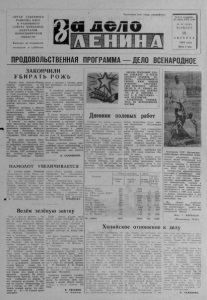 ОРГАН СЕ ВЕ РНОГО РАЙКОМА КПСС И РАЙОННОГО СОВЕТА НАРОДНЫХ ДЕПУТАТОВ НОВОСИБИРСКОЙ ОБЛАСТИ Выходит по вторникам, четвергам и с убботам. Пролетарии всех стран, соединяйтесь! ШЯ j U H S r i l Г аз е та основана 20 июля 1935 года № 99 (5539 ) Ч Е Т В Е Р Г 18 А В Г У С Т А 1983 года Цена 2 коп. ПРОДОВОЛЬСТВЕННАЯ ПРОГРАММА — ДЕЛО ВСЕНАРОДНОЕ ЗАКОНЧИЛИ У Б И Р А Т Ь Р О Ж Ь Р ж а н о е поле колхоза « П ам ять Ленина» разместилось на 650 г е к т а р а х . К середине ав|густй р о ж ь на этом массиве была полностью у л ож ен а в валки . Убирать ее стали раздельно. Хлебный к о лос подобран и обмолочен на последних г е к т а р а х 17 а в гу ста . Из х о зяй ств а на хлебоприемное пред приятие поступает зерно нового у р о ж а я . Провес ти ко совицу и обмолот рж и в лучшие сроки п озволила о р г ан и з а т о р с к а я р а б о т а среди ме ханиза торов, своевременный ремонт техники, хорошее т ех н и ческое обслуживание агре гатов . В колхозе на период ж а т в ы были о б р азо в аны три зв ена . П е р венство в социалистическом с о ревновании полеводов п р и н а д л е жи т зв ену В ладими ра Ильича Смыка. О т его комбайнов на то к о т п р а в л ен о 5024 ц ен т н е р а з е р на. Второе звено в озглавил Алексей Николаевич Сметанин, один из пер ед овых м е х ан из а то р о в к о л хоза . Он с т ов арищам и н ам о л о тил 4039 центнеров ржи . Н ем но го больше, 4167 центнеров, со с т а вил нам о л о т в звене Д м и т р и я П етровича Ничкова . У р о ж а й ность в среднем с г е к т а р а равна 18,9 центнерам, что выше прошлогоднего. В х о зяй ств е действует система р а д и о с в я зи м ежду а г р е г а т а ми, мастерской, сушилкой. На «горячих точках» установлены п я т н а д ц а т ь радиостанций., Эт d д а е т полеводам возможн ость в любое время получить точную информацию о количестве намо лоченного зерна , выяснить, какое зв ен о впереди. В случае поломки агр е г ато в в мастерскую сообщается о д о с т а в ке на поле необходимой детали. И техпомощь в короткий срок юкаж ет нужную услугу . Отл ично сп р а в л я е т с я со своими о б я занностями св арщ ик и шофер Владимир Михайлович Пасько. Он, что н а зы ва ется , мастер на все руки. В бесперебойной р а б о те агр е г ато в больша я з а с л у га Владимира Михайловича. После окончания уб о р ки рж и комбайны будут подтехничены и выйдут на пшеничное поле. Эта з е р н о в а я к у л ь т у р а у ж е поспела д л я ж а т вы . О. САМУШКИНА. Н А М О Л О Т У В Е Л И Ч И В А Е Т С Я В кол х о з е имени Калинина п р о д о л ж а е т с я ж а т в а . П еред н а чалом уборки ржи были ' с о з д а ны д ва механизи рованных звен а. Одно из них в о з гл ав ил комсомолец Владимир Герлиц. Ком байнеры выехали на поля , рас считывая закончить косовицу и обмолот в кратчайшие сроки. И сейчас из бункеров их ком байнов регулярно о т п р а в л я е т с я на ток зерно нового у р о ж а я . £ £ В хозяй ств е предпочтение о т даетс я уборке прямым комбай- нированием. Так уменьшаются потери хлеба, сок ращаю тся ср о ки жатвы . Ч асть ме ханиза торов о б ъ е д и нена в звене Владимира И в ан о вича Сидорова. Механизатор с большим опытом, он, как и его то варищи, стремится убрать р ож ь быстро, с хорошим к а чеством , Общий намолот в колхозе со с та в л я е т 4636 центнеров, 3. ТР УБ ЕНЕВА . Ведём з е л ё н у ю ж атв у Еще и года не прошло с тех пор, к а к вернулся Ни колай К р а с нов из армии. С тал он м е х ан и з атором в Витинской бригаде колхоза «Восход». И вот теперь н а ч а л а с ь его о ч е р е д н а я ж а т в а , а точнее, уб о р к а силос
