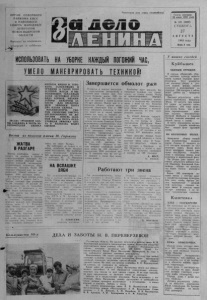 О Р Г А Н С Е В Е Р Н О Г О Р А Й К О М А К П С С И Р А Й О Н Н О Г О С О В Е Т А Н А Р О Д Н Ы Х Д Е П У Т А Т О В Н О В О С И Б И Р С К О Й О Б Л А С Т И Вых о д и т по в т о р н и к а м , . четвергам и с у б б о т а м . Пролетарии всех стран , соеди няйтесь! т п г т 1 А Газе та основана 20 июля 1935 г ода № 102 ( 5 5 4 2 ) С У Б Б О Т А 27 А В Г У С Т А 1983 года Цена 2 коп. ИСПОЛЬЗОВАТЬ НА УБОРКЕ КАЖДЫЙ ПОГОЖИЙ ЧАС, УМЕЛО МАНЕВРИРОВАТЬ ТЕХНИКОЙ! Заверш ается о б м о л о т ржи З В Е З Д А Т РУ Д О ВО Й СЛА ВЫ З А Ж Ж Е Н А В ЧЕСТЬ З А ГОТОВИТЕЛЕЙ СИЛОСА Ж А Т В А В РАЗГАРЕ Восемь комбайнов за н я т о в колхозе на п о д б о р е и прямом комбай ниров ании зерновы х. Р у ководит звеном опытный м е х а низатор, хороший организатор , сплачивающий коллектив, Иван Алексеевич Архипов. Б о л е е 200 гектаров убран ной ржи на счету пол еводов . Общий намолот с о с тавляет 3944 центнера зерна. В хозяйст ве была посеяна рожь сорта Вятка и новог о сорта —- Чулпан, который был размещен на 80 гектарах. И первый ж е год показал, что он у р о ж а й н е е Вятки: но 13 центнеров с гек- Щ р р а б е р у т земледельцы. Поэто- ^ » t y у ж е нынче мы заняли им 170 'гектаров. Три комбайна работ ают на с в а ле зерновых .Ударным трудом отмечает каждый день убо рочной страды зв ен о Г. А. Колпащи- кова. Четкая организация работ на всех участках от поля д о тока п озволя ет вести ж а т в у с л аж ен н о , б е з простоев и неполадок . Одновременно с п ер ев о з кой х л е б а на ток мы засыпали на хранение весь семенной фонд ржи, ос новное внимание -уделив КО Л Х О ЗА ИМЕНИ М. Г О РЬ КОГО, З А Л О Ж И В Ш И Х В ТРАНШЕИ 10 ТЫСЯЧ ТОНН З Е Л Е Н О Й МАССЫ И ВЫ П О ЛН И ВШ И Х ТЕМ САМЫМ ПЛАН ЗА Г О ТО ВКИ ЭТОГО ВИ Д А КОРМОВ. МЕХАНИ - ; ЗАТОРЫ НАМЕРЕНЫ З А - ! ПАСТИ Д Л Я П Р Е Д С Т О Я ЩЕЙ ЗИМ О ВКИ СКОТА Д В А ПЛАНА СИЛОСА. М Е Х А Н И ЗА Т О РЫ , У Б Е РЕМ СИЛОСНЫЕ БЫСТРО, О Р Г А Н И З О В А Н Н О , НЕ Д О ПУСТИМ ПОТЕРЬ З Е Л Е НОЙ МАССЫ. ПУСТЬ П Р Е Д СТОЯЩАЯ ЗИ М О ВКА СКОТА В КОЛХО ЗАХ БУД ЕТ СЫТНОЙ. опять же сорту Чулпан. Но за б о т им ся не только о с е менах, х озя йст в о ведет п р о д а ж у зерн а г о су д а р ст в у . На хл е б о п р и емное предприятие отправлено 8 4 0 центнеров зе рна. На о т г р у з ке р абот аю т И. С. М ед в е д е в и коммунист Н. В. Тараканов. НА ВСПАШКЕ ЗЯБИ Все сельскохозяйств енные р а боты в к ол хозе ве дутся в комплексе. Среди них о т в е д ен о большое место и п одъ ем у зяби. Земля , вспаханная в лучше агротехнические сроки, ответит зем л е д е л ь ц у на его з а б о т у высоким у р ож а ем . Коммунист В. Громов на тр акторе Д Т - 7 5 и М. Агалаков на К -700 выехали на з я б л е в о е поле. Оно немалое: к- весеннему севу н е о б х о д и м о подготовить 1200 гектаров пашни. Первые 128 гектаров у ж е вспаханы. Земледельцы п р одол -1 ж а ю т подъем зя би, придавая о с о б о е внимание качеству вспашки. , Г. А Л Е Н С К И Й , секретарь партбюроОстаются в памяти з е м л е д е л ь ца неизгладимые впечатления о горячей поре уборки. Д л я Геннадия Курцева ж а т в а 1983 г о д а не первая. Не один г о д у б и рает он у р о ж а й с полей к ол хоза «Н . *ая жизнь». Нынче, как и в прошлую уб о р к у , избран м е х а низатор звеньевым. Еще в 1982 г о д у у бедились полеводы в том, что умеет он и людей орг ан и зовать на тр уд , и технику х о рошо зн ает, и д е л о свое любит. А нынешняя ж атва еще р аз п о казала, что зв ен о Геннадия К у р ц е ва отличается сплоченностью, у д а р ной работой. В е д е т с)но косовицу в Чувашинской бригаде. З д е с ь рожь уроди лась лучше, чем в Алешинке. Своевр еменно 