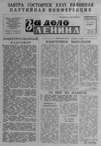 З А В Т Р А С О С Т О И Т С Я X X V I Р А Й О Н Н А Я П А Р Т И Й Н А Я К О Н Ф Е Р Е Н Ц И Я ОРГАН С ЕВЕРНОГО РАЙКОМА КПСС И РАЙОННОГО СОВЕТА НАРОДНЫХ ДЕПУТАТОВ НОВОСИБИРСКОЙ ОБЛАСТИ Выходит по вторникам, четвергам и субботам. Пролетарии всех стран, соединяйтесь! Газета основана 20 июля 1935 года № 144 (5584] ЧЕТВЕ Р Г 1 Д Е К А Б Р Я 1983 года Ц е н а 2 коп. ЗАИНТЕРЕСОВАННЫЙ Р А З Г О В О Р Ф « Б о л ь ш о й р е з е р в партии — д а л ь н е й ш е е р а з в и т и е в н у т р и партийной д ем о кр а тии , п о в ы ш е н и е т в о р ч е с к о й акти вности , инициативы и о т ве т ст ве нно с ти к о м м у н и с т о в . Ч е м с м е л е е и к о н к р е т н е е б у д у т вы с т у п а т ь к о м м у н и с т ы , о б с у ж д а я н а с у щ н ы е в о п р о с ы ж и з н и партии и страны , ч е м а к т и в н е е б у д у т пр ини мать у ч а с т и е в выполн е нии принятых реш ений , т е м у с п е ш н е е с м о ж е т вы п о л н я т ь наша парти я с в о ю и с т о р и ч е с к у ю м и с с и ю » , — о т м е ч а л Ю . В. А н д р о п о в . К о м м у н и с т ы н а с той чи во ищ ут пути п о в ы ш е н и я э ф ф е к тивн ости п р о и з в о д с т в а и и д е о л о г и ч е с к о й р а бо ты , в ы с т у пают проти в б е с х о з я й с т в е н н о с т и , ф о р м а л и з м а и других нега тивных я влений . О б этом с в и д е т е л ь с т в у е т и н ы н е ш н я я о тч е тн о - в ы б о р н а я к а м п а н и я в парти йных организациях . В ц е н тр е вн и м ан и я пр ош едш их с о б ра ний — а к т у а л ь н ы е в о п р о с ы р у к о в о д с т в а э к о н о м и к о й и во спи тани я л юд ей , у к р е п л е н и я го с у д ар с тв е н н ой и т р у д о в о й дисциплины, п о в ы ш е ние о тв е т ст в е н н о с ти к а д р о в з а п о р у ч е н н ы е у ч а с т к и р або ты . М н о г и е вы с т у п л е н и я к о м м у н и с т о в , о ч е м б ы ни шла р е ч ь , п р они к н у ты д у х о м н е у сп о к о е н н о с т и , о т л и ч а ю т с я о строй п о ст ано вко й н а зр е вш их п р о б л е м . К п р и м е р у , в парти йной ор ган и з ации а в то транспортного п р е д п р и я т и я на о т ч е т н о м с о б р а н и и шел з а ин те р е со в ан ны й , в з ы с к а т е л ь н ы й р а з г о в о р . В своих вы с т у п л е н и ях к о м м у н и с т ы в с к р ы в а л и недостатки в ор ганизации пр ои з во д с тва . . Бы л о з а о с т р е н о вним ани е на низкой т р у д о в о й дисциплине, на роли к о м м у н и с т о в по е е у к р е п л е н и ю . П р а в и л ь н о е з а м е ч а н и е б ы л о сд е л ан о по по в о д у р а б о т ы с кадрами , по их у к о м п лектованно ст и . М н о г о е в р а б о т е ав то п ар к а зави сит от с л е с а р е й , их к в ал и ф и кации , о т н ош е н и я к делу. А в с л е сари ча с т о п е р е в о д я т тех, кто не мо г пр а в и л ь н о э к с п л у а тир о ва т ь а в т о м о б и л ь . К р и т и ч е с к и е в ы с т у п л е н и я к о м м у н и с то в по м о гл и партийной ор ганизации , администрации я с н е е у в и д е т ь с вои у п у щ е н и я , с в о е в р е м е н н о п р ин я ть м е р ы по у л у ч ш е н и ю с тил я р у к о в о д с т в а . В р я д е партийных о р г а ни заций к о м м у н и с т ы п р я м о з а я в и л и : « Х в а т и т в од у в ступ е т о л о ч ь , пора от слов п ерейти к делу» . П ор а п о з а б о т и т ь ся, ч т о б ы та к о е ед ин с тво стало п о в се д н е в н о й н о рм о й , и дисциплина о б е с п е ч и в а л а с ь в с е м и м е р а м и парти йного в о з д е й с т в и я . М а т е р и а л ы отчетн ых соб раний д о л ж н ы б ы т ь т щ а т е л ь нейшим о б р а з о м п р о а н а л и з и р о в а н ы , п о л у чи т ь с е р ь е з н ы е о б о б щ е н и я и ш и р о к о и с п о л ь з о в а т ь с я в с о в е р ш е н с т в о в а н и и стиля и м е т о д о в партийной р або ты , в с к о р е й ш е м п р е о д о л е нии инерции, уста р е вш и х п р и в ы ч е к и с 