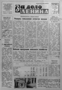 ОРГАН СЕ В ЕР НОГО РАЙКОМА КПСС И РАЙОННОГО СОВЕТА НАРОДНЫХ ДЕПУТАТОВ НОВОСИБИРСКОЙ ОБЛАСТИ Выходит по вторникам, четвергам и субботам. П р олетарии всех с т р а н , соединяйтесь! Г а з е т а о сно ван а 20 июля 1935 года Ns 10 (56061 В ТО РН И К 24 Я Н В А Р Я 1 9 8 4 г о д а Цена 2 коп. ВЫСОКАЯ Н А Г РА Д А З а у с п е х и , д о с т и г н у т ы е в о В с е с о ю з н о м с о ц и а л и с т и ч е с к о м с о р е в н о в а н и и , п р о я в л е н н у ю т р у д о в у ю д о б л е с т ь в в ы п о л н е н и и п л а н о в и п р и н я ты х о б я з а т е л ь с т в п о у в е л и ч е н и ю п р о и з в о д с т в а м я с а , м о л о к а и д р у г и х п р о д у к т о в ж и в о т н о в о д с т в а в з и м н и й п е р и о д 1982— 1983 г о д о в , У к а з о м П р е з и д и у м а В е р х о в н о г о С о в е т а С С С Р о т 21 д е к а б р я 1983 г о д а н а г р а ж д е н ы : М Е Д А Л Ь Ю « З А Т Р У Д О В У Ю Д О Б Л Е С Т Ь » Б О Л Д Ы Р Е В А л е к с е й М и хайлович — г л а в н ы й з о о т е х ник к о л х о з а « П у т ь к к о м м у н и з м у » С е в е р н о г о р а й о н а . В И Н О Г Р А Д О В А В але нтина А р т е м о в н а — д о я р к а к о л х о з а и м е н и М а к с и м а Г о р ь к о г о С е в е р н о г о р а й о н а . Н а вст ре чу вы борам С партийным словом В а ж н а я р о л ь в и з б и р а т е л ь ной к а м п а н и и п р и н а д л е ж и т а г и т п у н к т а м , к л у б а м и з б и р а т е л е й . Ч е м к р а с о ч н е е б у д у т о н и о ф о р м л е н ы , о б е с п е ч е н ы н е о б х о д и м ы м н а б о р о м л и т е р а т у р ы , г а з е т а м и и ж у р н а л а м и , ч е м с о д е р ж а т е л ь н е е с т а н у т п р о в о д и м ы е з д е с ь м е р о п р и я т и я , т е м о х о т н е е п о й д у т с ю д а л ю д и . М н о г о л ю д н о в эти д н и в а г и т п у н к т е с е л а Ф е д о р о в к а . Б о л ь ш а я р а б о т а п о е г о о ф о р м л е н и ю и о р г а н и з а ц и и р а б о т ы п р о в е д е н а п а р т и й н ы м б ю р о и с е л ь с к и м С о в е т о м . П е р е с м о т р е н с о с т а в а г и т а т о р о в . В с е о н и р а с к р е п л е н ы п о о т в е т с т в е н н ы м у ч а с т к а м . П р о в е д е н с е м и н а р - с о в е щ а н и е , гд е о п р е д е л е н ы з а д а ч и а г и т к о л л е к т и в а в п р е д в ы б о р н ы й п е р и о д , д а н ы и н с т р у к т и в н ы е м а т е р и а л ы , о т р а ж а ю щ и е п о л о ж е н и е д е л в о б л а с т и , р а й о н е , к о л х о з е . На с е м и н а р е в ы с т у п и л и с е к р е т а р ь п а р т б ю р о Г. Е. А л е н с - кий, п р е д с е д а т е л ь и с п о л к о м а с е л ь с к о г о С о в е т а П. Ф . Т и м к и н , п р е д с е д а т е л ь к о л х о з а А . Н. С а в ч и ц . В к р а с н ы х у г о л к а х в с е х ж и в о т н о в о д ч е с к и х ф е р м , в у ч р е ж д е н и я х к у л ь т у р ы , по м е с т у ж и т е л ь с т в а з в у ч и т с е г о д н я п а р т и й н о е с л о в о а г и т а т о р о в , п р о в о д я т с я в с т р е ч и с и з б и р а т е л я м и . И д е т б о л ь ш о й , з а и н т е р е с о в а н н ы й р а з г о в о р о д е л а х и планах . На к о н к р е т н ы х п р и м е р а х п о к а з ы в а ю т с я в е л и к и е п р е и м у щ е с т в а с о ц и а л и с т и ч е с к о й д е м о к р а т и и , с д е л а в ш е й х о з я е в а м и н а ш е й с т р а н ы с а м и х т р у д я щ и х с я . П о с т о я н н о к о о р д и н и р у е т р а б о т у а г и т к о л л е к т и в а з а в е д у ю щ а я а г и т п у н к т о м В. Н. Т и м к и н а . Р а б о т а с т р о и т с я в т е с н о м к о н т а к т е с п а р т и й н ой о р г а н и з а ц и е й и и с п о л к о м о м с е л ь с к о г о С о в е т а . К. А Н Т О Н О В . Ж и в от н о в о д ст в о—уд а р ны й фронт Резервы повышения качества молока Б о л ь ш и е и з м е н е н и я п р о и з о ш л и в ж и в о т н о в о д ч е с к о й о т р а с л и к о л х о з а « В о с х о д » з а п о с л е д н и е д в а года. Г л а в н ы й у п о р б ы л с д е л а н на п о в ы ш е н и е к а ч е с т в а м о л о к а . Э т 
