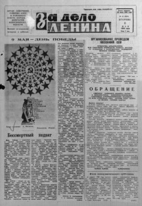 ОРГАН СЕВЕРНОГО РАЙКОМА КПСС И РАЙОННОГО СОВЕТА НАРОДИ ДЕПУТАТОВ НОВОСИБИРСКО ОБЛАСТИ Выходит по' вторникам, четвергам и субботам. Пролетарии все» стран, соединяйтесь! Газета основана 20 июля 1935 года N° 55 (5651) ВТОРНИК 8 л М А Я 1984 го д а Цена 2 хан. 9 М А Я “ Д Е Н Ь * П О Б Е Д Ы ;СДАВА Ш й О Ш Й * а ^ \ е ш £ т с к о г о НАРОДА ВЕЛИКОЙ № т гч т :ш м т Ш НИКОГДА Ж й Ш Е Р Е Н Г ! ОНА щ Б У Д Е Т ’- • ' & В Е К А Х ' . дожн ик а М ас ля ко в а . Издательство «П л а к а т » . Бессмертный подвиг День Победы — радостный и светлый праздник нашей страны В этот весенний день каждый советский человек, каждая семья, весь наш народ живут памятью о незабываемом победном мае 1945 сода. С тех пор, как над истерзанной о г нем и металлом Европой воцарилась мирная тишина , минуло 39 л ет . Созидательный труд со ве тс ких людей обновил нашу з ем лю, Со здан а могучая индустрия, современное сельс ко е хозяйство, выросли и встали в ряды строителей коммунизма новые поколения. - Они не знают тягот и лишений, выпавших на долю советских людей - в грозные годы войны. И с е г о д няшним днем мы обязаны той великой Победе, которую справедливо называют всенародным подвигом. Все дальше i уходят от нас майские дни сорок пятого. Но с каждым годом все ярче предстает величие подвига, с о вершенного советским народом я самой тяжелой из войн, канне знала история. Победа над фашизмом была подготовлена величайшим эн т узи аз мом советских людей. 22 июня 1941 г. фашистская Германия вероломно напала на нашу страну Упоенные своими успехами в Европе, гитлеровцы считали, что они также легко осуществят свои планы в отношении Советского Сою з а . Однако враги просчитались. На защиту своего О т е чества в первые же дни войны поднялся весь советский народ. В невиданно короткое время страна превратилась в единый боевой лагерь, охваченный единым порывом, — р а з бить врага, изгнать его с р о д ной земли. В борьбе против фашизма мы были не одиноки. Мы пом. ним наших бесстрашных соратников • партизан, героев С о п ротивления во многих странах, оккупированных гитлеровцами К а ш народ никогда не забудет подвигов героев Брестской крепости, мужественных защитников О дес сы и Ленинграда, Киева и Севастополя , героев Малой Земли. Разгром фашистских захватчиков под Москвой развеял миф о непобедимости гитлеровской армии и положил начало коренному повороту в ходе б о е вых действий на полях Великой Отечественной войны. О г ромное военно - стратегическое значение имела победа наших войск под Сталинградом Она положила начало решающему перелому в ходе Великой Отечественной и второй мировой войны в целом. Определенный вклад в п о б е ду внесли и трудящиеся нашего района. На фр он т и на р а б о ту в промышленность было направлено около шести тысяч человек. Целыми семьями у х о дили северяне на фронт и с р а жались с беззаветной отвагой. Из с. Чуваши ушли на фронт пять братьев Андреевых, из Гражданцево — четыре брата Агрызковых, из д. Ича — пять братьев Дьячуков, из Потюканово — четыре- брата Жариковых и др угие. Эти и другие люди явилась костяком в формировании сибирских д о б ровольческих дивизий. Мужество, героизм и отвага — вот что отличало воинов - сибиряков. С р ед и участников боевых д е й ствий мы се годня называем имена С . Д. Трофимова, А . С . Григорьева, П. К. Акатьева, М. Г. Тимофеева, П. Н. Ф е д ченко, Ф . А. Назарова, И А. Ф е д о с е е в а , И. П. Лукьянчука