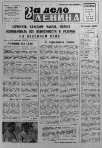 ОРГАН СЕВЕРНОГО РАЙКОМА КПСС И РАЙОННОГО СОВЕТА НАРОДНЫХ ДЕПУТАТОВ НОВОСИБИ РСКОЙ ОБЛАСТИ Выходит по вторникам, четвергам и субботам. Пролетарии всех стран, соединяйтесь! Газета основана 20 июля 1935 года № 66 (5662| СУББОТА 2 и ю н я 1984 год а Цена 2 п н . ДОРОЖИТЬ К А Ж Д Ы М ЧАСОМ. ПОЛНЕЕ ИСПОЛЬЗОВАТЬ ВСЕ ВОЗМОЖНОСТИ И РЕЗЕРВЫ Н А В Е С Е Н Н Е М С Е В Е ! В райкоме ВЛКСМ ЛУЧШИЕ НА СЕВЕ Бюро райкома комсомола рассмотрело итоги социалистического соревнования К о м с о м о л ь с к е - молодежных звеньев на весенне - полевых работах с 20 по 27 мая и постановило: Первое место присудить коллективу комсомольско- молодежного звена колхоза имени X X I I съезда КПСС (звеньево й Ал ексе й Щ ербаков ) , выполнившему задание на севе — на 54,6 процента, весновспашки — на 88, б о роновании — на 29,2, культивации — на 9,7 процента. Второе место присудить коллективу Ком сомольске молодежного звена колхоза «Память Ленина» (звеньево й - наставник Михаил Петрович Ж ур а в л е в ), вы полнившему задание: на севе — на 41,8 процента, весно вспашки — на 83,3, бороновании — на 113,6, культивации — на 124,7 процента. Третье место присудить коллективу К о м с о мо л ьске - молодежного звена колхоза «Новая жизнь» (звеньевой Геннадий Курцев), выполнившему задания: на севе — на 35 процентов, весновспашки — на 180, б о р о новании — на 84,9, культивации — на 38,6 процента. Согласно условиям социалистического соревнования на весейне - полевых работах коллективу звена Алексея Щ е рба кова вручается переходящий Красный вымпел рай кома комсомола. ВРУЧЕН ВЫМПЕЛ С хорошим трудовым настроем ведет весенние работы на полях звено коммуниста Е. М. Диля из кол хоза «Наша Родина». По- ударному работают в кол лективе все механизаторы. Они ведут сев не только высокими темпами, но и качественно 30 мая звено посе яло яровые зерновые Хозяйство разработало на посевную четкий план, хорошо организовало все р а боты, неплохо подготовило технику. В звенья подобраны добросовестные механизаторы. Поэтому сев идет без срывов. Зв е ну Е М. Диля, как застрельщику социалистического соревнования, был вручен переходящий красный вымпел колхоза, в честь него поднят флаг Трудовой Славы, выпущен « Б о евой листок» Н. И ВАНО В , секретарь партбюро Д ела ид ут успешно Алексей Винальевич Подрядчиков во зглавляет звено, занятое на весенне - по левых работах этого года. К о л хоз имени К Маркса закрепил за ним 1700 гектаров пашни Большая часть з е м ли — 1400 гектаров — б у дет занята зерновыми, на остальной площади р а зм е с тя т ся посевы многолетних трав. Четыре агрегата из з в е на ведут сев, в среднем засевая по 100 гектаров в день. Такой выработки они добиваются потому, что Владимир Осипов успешно в е дет культивацию. готовя землю под посев Итоги работы подводятся регулярно З а это отвечает учетчик В Г Девятников. Колхоз обеспечил трактористов и всех. работающих в эти дни на поле, горячим питанием Повар Нина М о локова готовит вкусные обеды и ужины. А. Д Е Р К А Ч . В п е р е д о в о м з в е н е Счастливое совпадение: совет Р А П О и президиум райкома профсоюза работников се л ь с ко го хозяйства, подведя итоги с о ревнования звеньев, работающих по безнарядной оплате труда, вывели звено Владимира Пименовича Ганича на пер вое место, а именно с ним, с его коллективом в один из майских дней повстречаласв агитбригада Останинского Дома культуры. В колхозе « V I I съезд Сове- ов», 