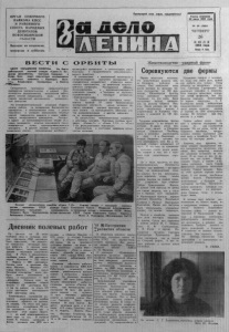ОРГАН СЕВЕРНОГО РАЙКОМА КПСС И РАЙОННОГО СОВЕТА НАРОДНЫХ ДЕПУТАТОВ НОВОСИБИ РСКОЙ ОБЛАСТИ Выходит по вторникам, четвергам и субботам. П р о л е т а р и й в с е х с т р а н , с о е д и н я й т е с ь ! Г а з е т а о с н о в а н а 20 и ю л я 1935 г о д а № 39 156851 ЧЕТВЕРГ 26 И Ю Л Я 1984 года Ц е н а f в а н . В Е С Т И С О Р Б И Т Ы Ж и в о т н о в о д с т в о—у д а р н ы й фронт ЦЕНТР У П Р А ВЛ Е Н И Я П О Л Е Т О М . На б о р т у о р б и т а л ь н о й н а у ч н о й с т а н ц и и « С а л ю т - 7 » В л а д и м и р Д ж а н и б е к о в , С в е т л а н а С а в и ц к а я и И г о р ь В о л к в е д у т с о в м е с т н ы е и с с л е д о в а н и я с о с н о в н ы м э к и п а ж е м — Л е о н и д о м К и з и - м ' - м , В л а д и м и р о м С о л о в ь е в ы м и О л е г о м ^ “ ? й ъ к о в ы м . С е г о д н я ш н я я п р о г р а м м а п р е д у с м а т р и в а е т п р о в е д е н и е т е х н о л о г и ч е с к и х и м е д и к о - б и о л о г и ч е с к и х э к с п е р и м е н т о в , в и з у а л ь н ы е н а б л ю д е н и я з е м н о й п о в е р х н о с т и , к и н о - и Ф о т о с ъ е м к у с о в м е с т н о й д е я т е л ь н о с т и , т е л е в и з и о н н ы й р е п о р т а ж . Н а у с о в е р ш е н с т в о в а н н о й у с т а н о в к е « Т а в р и я » н а ч а т ы р а б о т ы п о р а з д е л е н и ю б и о л о г и ч е ' к и х п р е п а р а т о в в э л е к т р и ч е с к о м п о л е с ц е л ь ю п о л у ч е н и я в у с л о в и я х н е в е с о м о с т и о п ы т н ы х п а р т и й с в е р х ч и с т ы х в е щ е с т в и н о в ы х э ф ф е к т и в н ы х л е к а р с т в е н н ы х п р е п а р а т о в . С е г о д н г в о д н о й и з э л е к т р о ф о р е т и ч е с к и х к а м е р у с т а н о в к и п р о в о д и т с я о ч и с т к а п о л у ч е н н о г о г е н н о - и н ж е н е р н ы м п у т е м п р о т и в о и н ф е к ц и о н н о г о п р е п а р а т а . В д р у г о й к а м е р е о с у щ е с т в л я е т с я р а з д е л е н и е к л е т о к , п р о и з в о д я щ и х а н т и б и о т и к я в л я ю щ и й с я л е к а р с т в о м и с т и м у л я т о р о м р о с т а б и о м а с с ы и п р о д у к т и в н о с т и с е л ь с к о х о з я й с г . в е н н ы х ж и в о т н ы х . В с о о т в е т с т в и и с п р о г р а м м о й к о с м и ч е с к о г о м а т е р и а л о в е д е н и я в ы п о л н е н э к с п е р и м е н т п о о п р е д е л е н и ю в о з д е й с т в и я о т к р ы т о г о к о с м и ч е с к о г о п р о с т р а н с т в а н а р а з л и ч н ы е к о н с т р у к ц и о н н ы е м а т е р и а л ы . И с с л е д у е м ы е о б р а з ц ы э к с п о н и р о в а л и с ь в р а з г е р м е т и з и р о в а н и е й ш л ю з о в о й к а м е р е , а к о н т р о л ь их с о с т о я н и е о с у щ е с т в л я е т с я с п о м о щ ь ю а п п а р а т у р ы « Э л е к т р о т о п о г р а ф » . Н а б о р т у о р б и т а л ь н о г о к о м п л е к с а п о о л г - ж а е т с я н а ч а т ы й 19 и ю л я б и о л о г и ч е с х и й э к с п е р и м е н т « Ц и т о з - 3 » , ц е л ь ю к о т о р о г о я в л я е т с я и з у ч е н и е в л и я н и я ф а к т о р о в к о с м ю к о г о п о л е т а н а п р о н и ц а е м о с т ь о б о л о ч е к к т о т о к м и к р о о р г а н и з м о в и д р у г и е х а р а к т е р и к и и х ж и з н е д е я т е л ь н о с т и . П о р е з у л ь т а т а м т е л е м е т р и ч е с к и х и з м е р е н и й и д о к л а д а м э к и п а ж а , б о р т о в ы е с и с т е м ы к о м г л е к с а « С а л ю т - 7 » — « С о ю з Т - 1 1 » — « С о ю з Т -1 2 » ф у н к ц и о н и р у ю т н о р м а л ь н о . С а м о ч у в с т в и е и с о с т о я н и е з д о р о в ь я ^ к о с м о н а в т о в х о р о ш е е . Э к и п а ж к о с м и ч е с к о г о к о р а б л я « С о ю з Т -1 2». С п р а в а н а л е в о — к о м а н д и р э к и п а ж а л е т ч и к - к о с м о н а в т С ССР д в а ж д ы Г е р о й С о в е т с к о г о С о ю з а ■ В л а д и м и р А л е к с а н д р о в и ч Д ж а н и б е к о в , к о с м о н а в т - и с с л е д о в а т е л ь з а с л у ж е н н ы й л е т ч и к , и с п ы т а т е л ь С С С Р И г о р ь П е 
