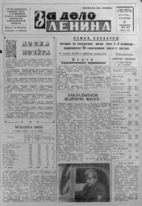ОРГАН С Е В Е РН О Г О РАЙКОМ А КПСС И РАЙ О Н Н О ГО СОВЕТА Н А РО Д Н Ы Х Д Е П У Т А Т О В Н О В О С И Б И Р С К О Й ОБЛАСТИ Выходит по вторникам, четвергам и с у б б о т а м . П р о л е т а р и и в с е х с т р а н , с о е д и н я й т е с ь ! Г а з е т а о с н о в а н а 20 и ю л я 1935 г о д а № 112 (5 7 0 8 ) ВТОРНИК 1 8 СЕНТЯБРЯ 1984 г о д а Ц е н а 2 ко п . <. Й W iff л - 4 0 Совет РАПО п президиум р ай к о м а профсоюза р аб о тн и ков сельск ого х о з я й с т в а рас смотре ли итоги со ц и ал и сти ческого с оре вн ов ан ия ко л х о зо в , молочнотов арных ферм, зв еньев, тел я тни ц по п р о и з в о д с т в у и п р о д а ж е госу д ар с тву п р о ду к то в ж и в о т н о в о д с т в а з а 8 месяцев 1984 года и постан овили: В соревновании молочнотоварных ферм первенство присудить коллективу Михеевской фермы колхоза «Заветы Ильича» (зав. производств енным участк ом С. Д . З у б к о в ) , надоившему от ф у р а ж н о й коровы по 2108 килограмм ов молока . Второе место присудить коллективу Ударницкой фермы колхоза им. Калинина (з а в. производств енным участком Е. Ф. Ф е д о р о в а ) , н ад о ивш ем у от коровы по 2108 к и л о г р а м мов молока. Третье место присудить коллективу Гражданцевской фермы колхоза имени XXII съезда КПСС (з а в. производственным участком Е. Е. В е д е р н ик о в ) , н а до ивш ем у от ф у р а ж н о й коровы по 1913 ки лограмм ов молока. В социалистическом соревновании безнарядных звеньев первенство присудить звену 3. К. Черновой из к о л х о з а им. М. Горького, н ад о ивш ем у от ф у р аж н о й коровы по 2185 к и л о гр амм о в молока . В. Д . Акилиной н ад о ивш ем у по 2007 Второе место присудить звену из к о л х о з а им. XXII с ъ е з д а КПСС , килограмм ов молока . Третье место присудить звену Л. Н. Антипиной из к о л х о з а «Восход», н ад о ивш ем у по 1947 килограмм ов мо л о к а от ф у р а ж н о й коровы. В социалистическом соревновании телятниц первенство присудить Е. А. Сав ицкой из к о л х о з а им. К алинина, доби вш ей ся среднесуто чного привеса от одной головы з а к репленных з а нею т е л я т с н а ч а л а года по 800 граммов. И , ш ВСПАШКА ЗЯБИ в колхозах района на 17 сентября К о л х о зы План О с в о б о - в сп аш к и л и в ш а я с я В сп а х а - % к зяби п л о щ а д ь но ( г а ) п л а н у ( г а ) ( г а ) П а м я т ь Лен и на им. X X I1 с ъ е з д а КПСС Восход Н о в а я ж и зн ь З а в е т ы И л ьич а им. М, Г орького П у ть к к оммуни зму Б о р ь б а з а мир V I I съ езд Советов им. К. М а р к с а Н аш а Р о д и н а им. К алинина По району П е р в а я з е р н о в а я культура^ с которой колхозы начали у б о р ку, — рожь . И следом з а о б м о лотом на освободившиеся поля вышла со л ом о у б о р о ч на я т ех н и ка. Н а п о л я х появились св еж ие скирды. А теперь перед м е х а н из а то р ам и ст оит не мене е о т в етств ен н ая з а д а ч а : в лучшие а гр о т е х н и ч е с к и е . сроки п р о и з вести в сп аш к у зяби. Бо л ьш о е внимание п о д ъ ем у з я б и у д е л я е т с я в к о л х о з е «Восход». Зем л ед ел ьцы это го х о з яй с т в а одними из п с о вых вывели т р а к т о р а на оп у стевшие п оля . И к а к р е з у л ь т а т их орг ан и зованн ости : из 1078 г е к т а р о в осво б о ди вш ей ся пло2000 1809 60 3 1300 1076 286 22 1800 1079 941 52 1300 987 112 8,6 1800 1445 50 2,7 1250 1106 58 4,6 2000 1515 573 28 1300 753 ПО 8,4 1200 920 194 16 1300 1202 41 3,1 1200 1120 70 5,8 1400 926 180 13 .17850 13938 2675 15 П О М Н И , Х Л Е Б О Р О Б ! Оставил на квадратном метре поля 4 - 5 колосьев недополучил 50 килограммов зерна с гек тара . В с о в е т е Р А П О и р а й к о м е п р о ф с о ю з а и г и социалистического соревнования Совет РАПО и рай ком п р о ф союза работник ов сельского х о зяй ств а по
