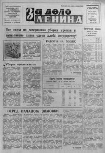ОРГАН С Е ВЕ РН О Г О РАЙКОМ А КПСС И Р АЙО ННО ГО СОВЕТА Н А РО ДНЫ Х ДЕ П У ТА Т О В Н О В О С И Б И РС К О Й ОБЛАСТИ Выходит по вторникам, четвергам и субботам . Газета основана 20 июля 1935 года № 117 (5713) СУББОТА 29 СЕНТЯБ РЯ 1984 г о д а Цена 2 коп. Все силы на завершение уборки урожая и выполнение плана сдачи хлеба государству! V W ' ^ y y \ A A / V \ / W W \ A / W W V \ A A A A / W \ A A A A A A A A A A A A A A A / W \ A A A A A / V V ' \ / W \ A A A - ' \ ^ j ЗВЕЗДА ТРУДОВОЙ СЛАВЫ ЗАЖЖЕНА В ЧЕСТЬ? УБОРОЧНО - ТРАНСПОРТНОГО ЗВЕНА Д. П. НИЧ- КОВА ИЗ КОЛХОЗА «ПА-< МЯТЬ ЛЕНИНА», НАМО-< ЛОТИВШЕГО С НАЧАЛА' УБОРКИ 12252 ЦЕНТНЕРА' ЗЕРНА, ПО 2450 ЦЕНТНЕР РОВ НА КОМБАЙН. МЕХАНИЗАТОРЫ! РАВЛ НЯЙТЕСЬ НА ПЕРЕДОВИ-? i f КОВ ЖАТВЫ-84! y V W V W v y ' y \ . / V \ A A /\ A /\ A ^ V V \ A A /\ A / \A /\ A A A / V V N A A /V \A A A A A A A A A /\ /V V V \A A A A A /V \ A A A /\ / \, » ^ У б о р к а п р о д о л ж а е т с я На полях колхоза имени Калинина продолжается уборка зерновых и кормовых культур. Дв е недели назад комбайнеры закончили обмолот ози мой ря^и, которая была р а з мещена на 532 гектарах и дала урожайность по 16 центнеров с гектара. Наше хозяйство полностью убрало пшеницу — 155 гектаров и ячмень — 165. Успешно ведем и поставку хлеба государству. На приемные пункты поступило 7140 центнеров зерна из восьми с половиной тысяч по плану. Большую помощь нам о к а зывают механизаторы и шоферы, привлеченные на уборку из предприятий райцентра. Звено Владимира Ив ановича Сидорова, механика из «Сельхозхимии», на четырех комбайнах «Нива» обязалось за уборочную страду намолотить 14 тысяч центнеров зерна. Сейчас на их счету 11 тысяч. В звене трудится Виктор Ратников, наш комбайнер Иван Николаевич Кузьминых и Петр Иванович Васильев из межколхозного лесхоза, который почти еж е годно приезжает в наш колхоз на уборку. От комбайнов на ток бесперебойно доставляют зерно Анатолий Васильевич Друзе - левич, Николай Васильевич Смык, Михаил Александрович Кармачов. С хорошей отдачей р аботают и два комбайна СКД-6, управляемые братьями И в а ном и Владимиром Слобод- чиковыми. Комбайнеры намолотили 3800 центнеров зерна. Отвозит зерно от ком байнов на автомобиле ЗИЛ-130 Николай Васильевич Друзелевич. На приемный пункт д оставляют зерно водители КамАЗов Виктор Григорьевич Тарасенко и Николай Савельевич Руденков из «Транссельхозтехники». Сейчас все силы комбайнеров и шоферов направлены на уборку овса. М. СОРОКИН, председатель колхоза. РАБОТЫ НА ПОЛЯХ Суточные надои молока от коровы на 27 сентября (в килограммах) В колхозе «Новая жизнь», как и в других хозяйствах района, продолжаются полевые» работы. Д л я уборки силосных культур было создано механизированное звено, руководит ко торым В. И. Шеруков. Оно ведет скашивание кукурузы и подсолнечника, которые были посеяны не раздельно, и в смеси. На полях работают два комбайна, но часто случаются простои из - за поломок. Например, вот уже два дня они стоят без действия. А техпомощь оказать нелегко, так как не хватает запчастей. Хотелось бы, чтобы «Сельхозтехника» оказывала более действенную помощь механизаторам колхоза. Это позволит сократить простои. А пока кормозаготовители убрали в Чувашинской бригаде 270 гектаров силосных. Урожайность на этих полях составил 150 центнеров с гектара. Доставляют зеленую массу к \,буртам в основном на трех тракторах «Беларусь» и двух автомашинах. Одновременно с уборкой силосных идет жатва. В Чувашинской бригаде её ведет звено Г. Г. Курцева, а в Алешинской — Н. А. Ерем