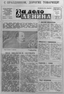 С ПРАЗДНИКОМ, ДОРОГИЕ ТОВАРИЩИ! О Р ГА Н С Е В Е Р Н О Г О РАЙК ОМ А КПСС И РА Й О Н Н О Г О СОВЕТА Н А Р О Д Н Ы Х Д Е П У Т А Т О В Н О В О С И Б И Р С К О Й О БЛА С ТИ Выходит по вторникам, четвергам и с у б б о т а м . Пролетарии все» стран, соединяйтесь ! Газета основана 20 июля 1935 го д а № 134 (5730) С Р Е Д А 7 Н О Я Б Р Я 1984 г о д а Цена 2 коп. £ A / W \ A A A / N A A A A A A A A / W W \ A A A A A A A A A A A / W V > A A A A A A A / W V W 4 A A A A A A A A A A / N A A A A / \ / V V V V V V \ V N A A A A A A A / V V W W ' ^ СЧЕТ ОКТЯБРЬ ОТКРЫЛ НОВУЮ ЭПОХУ В ИСТОРИИ ЧЕЛОВЕЧЕСТВА, НАЧАВ ОТ, ПГ КОММУНИСТИЧЕСКОЙ ЦИВИЛИЗАЦИИ. ЗА ГОДЫ, МИНУВШИЕ С ТЕХ ДНЕЙ, СОВЕТСКАЯ СТРАНА ПРОШЛА НЕЛЕГКИЙ ПУТЬ БОРЬБЫ И СОЗИДА-? НИЯ, ГЛАВНЫМ ИТОГОМ КОТОРОГО СТАЛО ПОСТРОЕНИЕ РАЗВИТОГО СО-5 ЦИАЛИЗМА. МОЩНЫЙ ЭКОНОМИЧЕСКИЙ ПОТЕНЦИАЛ, КОТОРЫМ РАСПОЛАГАЕТ? :НЫНЕ НАША СТРАНА, СЛУЖИТ ПРОЧНОЙ ОСНОВОЙ РЕШЕНИЯ СОЦИАЛЬНЫХ? ЗАДАЧ, УКРЕПЛЕНИЯ ОБОРОНОСПОСОБНОСТИ СТРАНЫ, ПРОВЕДЕНИЯ АКТИВНОГО ВНЕШНЕПОЛИТИЧЕСКОГО КУРСА. • o ' V N A A A A A A A A A A A A A / V A A A A A A / W \ A A A A A A A A A / \ A A A A A / V V \ A A A A A A A A / W V A A A / ' . Плакат художника А. Арсентьева. Издательство «Плакат». Фотохроника ТАСС ПОД ЗНАМ ЕНЕМ О К Т Я Б Р Я В жизни каждой страны, каждого народа есть даты, которые дороги всем. Но совершен но особое место среди них занимает наш сегодняшний лучезарный праздник — очередная годовщина Великой Октябрьской социалистической революции, уж е шестьдесят седьмая по счету в историческом календаре. Праздник этот — в сердце каждого из нас, советских людей. Больше того, он принадлежит всему прогрессивному человечеству, его свято чтут трудящиеся всех стран, всех континентов. Ведь свет великого Октября озарил всю нашу планету, принес с собой величайшую надежду на лучшее будущее. По всей стране в предпраздничные дни люди несут трудовую вахту. С хорошими показателями встречают 67-ю годовщину Великого Октября труженики и нашего района. Так, план реализации за 10 месяцев выполнили райсельхозтехника, лесхоз, леспромхоз, маслозавод. Перевыполнен объем грузоперевозок в «Транссельхозтехнике». Откликаясь на призыв ЦК КПСС к 67-й годовщине Великой Октябрьской социалистической революции «Труженики сельского хозяйства! Укрепляйте кормовую базу животноводства, повышайте его продуктивность^! Увеличивайте производство животноводческой продукции!», животноводы колхоза имени Максима Горького получили на фуражную корову по 2301 килограмму молока, выполнили план по воспроизводству стада крупного рогатого скота, план сдачи молока государству выполнили на 103,3 процента. Досрочно справились с продажей мяса. За всеми этими цифрами стоят люди, которые настойчиво борются за выполнение социалистических обязательств по сверхплановому росту производительности труда, снижению себестоимости продукции. В животноводстве безнарядное звено Зои Константиновны Черновой — депутата районного Совета — получило по 2508 килограммов молока на фуражную корову. Звено Валентины Донатовны Акилиной из колхоза имени XXII съезда КПСС — по 2339 килограммов на фуражную корову. у телятницы Елены Семеновны Ломской из колхоза «Память Ленина» среднесуточный привес составил 832 грамма. Это лучший результат в районе. Высоких показателей на уборке урожая добились1 звенья комбайнеров В. И. Сидорова из колхоза имени Калинина, Д. П. Ничкова — из колхоза «Память Ленина», А. Г. Тукаева — из колхоза «Наша Родина». Образцы коммунистического отношения к труду показал