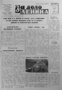 ОР ГАН СЕ В Е Р НОГ О Р АЙКОМА КПСС И РАЙОННОГ О СОВЕТА НА Р О Д НЫХ ДЕПУТАТ ОВ НОВ ОС ИБ И Р С К О Й ОБЛАСТИ Выходит по вторникам, четвергам и с убботам. П ролетарии всех с т ран , соединяйтесь ! Г а з е т а основ ана 20 июля 1935 года № 70 (5 8 2 6 ) Р Е Д А 12 и ю н я 1985 года Ц ена 3 коп. 9 МАЯ ЗВЕНО И. Ф . М И Х Е Е В А ИЗ КОЛХОЗА „ П У Т Ь К К О М М У Н И З М У '1 НА С Е В Е З Е Р Н О В Ы Х ВЫПОЛНИЛО НОРМУ НА 173 ПРОЦЕНТА. РАВНЕНИЕ НА П Р А В О Ф Л А Н Г О В Ы Х ПОСЕВНОЙ! Д Н Е В Н И К ПОЛЕВЫХ РАБОТ Н а с т а л а пора , к огда сев зер- •в^ых с та л главным в проведе- н и весенне - полевой кампании. П огожие дни, установившиеся в последнее время , позволили вести его почти во всех к о л х о з а х района. Н а 10 июня яровы е зерновые размещены на 4558 гект а р а х . Наиболее успешно сев идет в колхозе «П а м я т ь Ленина», где посеяно у ж е 590 г е к т а р о в пшеницы, 330 — овса, 169 — г о р о ха. К стати , это единственное п о ка в районе хозяйство , где по. сеяна э т а ку л ь т у р а , б о г а т а я б е л ками. Пшеница и овес — основные куль туры в нашем р а й оне. Ими еж его д но зан имаю тс я большие площ ади пахотных з е мель. Сейчас под пшеницей — 1878, а под овсом — 1866 г е к таров. Посев этих к у л ь ту р п р о дол ж а ется . Около 650 гек таров з а с е ян о си" лосными. И опять ж е наиболее успешно идет сев этих к у ль тур в кол х о з е «П а м я т ь Ленина», где п од ко рмовыми у ж е з а н я т о 250 гек таров . Приступили к их севу колхозы «Борьба за мир», имени Мак сима Горького, «Н ов ая жизнь». В большинстве кол х о зо в сев яровых идет с одноврем енным внесением минеральных у д о б р е ний. Ими у добрено у ж е 510 г е к тар о в посевов. П р о д о л ж а е т с я в сп аш к а ' зем ел ь Веснов спашки поднято почти 4800 гек таров. З а д а ч а первостепенной важности Кол х о з «Н аша Р о ди н а» п е р вый выезд в поле с д ел ал 27 м а я . Нам пред стоит провести 1766 г ек таров веснов спашки. З а с е я т ь пшеницей 400 г е к т а р о в , овсом — 665, горохом — 100, силосными к у л ь ту р ам и — к ук урузой и подсолнечником — 505 г е к т аров . Чтобы м а к сим ал ь н о ускорить темпы посевной, п р а в ление к о л х я з а и м е х ан из а то ры решили ор г ан и зо в а ть д ву х см ен ную р а б о т у на весновспашке г бороновании. С таршими смен в звен е п ахарей назначены Н и к о лай Алексеевич Кулик ов и Алексей Григорь евич Тука ев . Зв ено д о б и в а е т с я высокой е ж е дневной выработки. В честь него на центральной у с а д ь б е к о л хоза подн ят фл аг тру д о во й славы. На 10 нюня по к о л х о зу в спахано 850 г ек тар о в пашни. В настоящ ее время часть r v сеничных т р а к т о р о в с пах о ты пер евед ен а на боронование, ч т о бы и з б е ж а т ь большого р а з р ы ва м е ж д у первичной и в то р ич ной о б р аб о тк о й почвы. Н а подр а бо тк е земли з а н я то зв ено Н. А. Чи кун ов а . В его со с тав е два м е х ан и з а т о р а из шефствующей орг ан и зац ии — межко л х о зн о й ПМК. Т р у д о лю бие и добоосовестность в деле п о к а зы в а е т Н. С. Трофимов. Сев зе рновых о сущ ествл яе т зв ен о М и хаи ла Филимоновича Хлопото ва. Вместе с ним т р у д я т с я отец и сын Лушовы . б р а т ь я А б д р ахм ан о вы , , В. В. Тучков, С. И. Попов, В. И. Афанасьев . З в ен о з а с е я л о 300 г ек таров пшеницей и 320 овсом. Н а и высшей выра ботки оно добилось 9 июня , когда з а смену было посеяно двести г ек тар о в овса. С л ож н о с п одвозкой семян. Н а зато п л ен ных ме стах мы вынуждены д е р ж а т ь гусеничные тр а к т о ры д л я буксировки ав томобилей с зерном. Бесперебойно з а г р у ж а е т с е мена