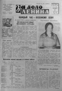 П р о л е т а рии всех стран, со един я йтесь! Г а з е т а основана 20 июля 1935 года № 71 (5827 ) ЧЕТВЕРГ И Ю Н Я 1985 года Цена 3 ко1 ОР ГАН СЕ В Е Р НОГ О Р АЙКОМА КПСС И Р АЙОННОГ О СОВЕТА НА Р ОД НЫХ Д Е ПУТАТ ОВ НОВ ОСИБ ИР С КОЙ ОБЛАСТИ Выходит по вторникам, четвергам и с у бботам . З В Е З Д А ТРУДОВОЙ СЛА- Ы З А Ж Ж Е Н А В ЧЕСТЬ _ З Е Н А Ф ЕД О РА ИВАНОВИЧА ОСИПОВА ИЗ КОЛХОЗА «ПАМЯТЬ Л Е Н И Н А » , В Ы П О Л Н И В Ш Е Г О С ЕЗОН - HOU% ЗА Д А Н И Е НА СЕВЕ НА 81 П Р О Ц Е Н Т . МЕХАН И ЗА ТО РЫ , К А Ж ДЫЙ РА БО Ч И Й ЧАС — Д ЕЛУ ! Д О Б И В А Й Т Е С Ь НА И ВЫСШЕЙ П Р О И З В О Д И Т Е Л Ь Н О С Т И ТРУДА! Сеют яровые З в ен о известного м е х ан н i з а т о р а из кол х о з а имени XXI I съ е зд а КПСС, м о л о д о го коммуниста А. Г, Щ е р б а к о в а в прошлом году з а нималось выращиванием с и лосных культур. Нынче, в трудную з а т я ж н у ю весну, зем ледельцам поручен не м е нее ответственный участок. Они ведут сев яровых к у л ь тур. З в ен о д о лж н о вспахать 640 г ек тар о в почвы, п р о к у л ь ти ви ров ать ее и зас е я ть . Стр емясь справитьс я с з а д а нием. ме хан иза торы в ы е з ж а ют на поле при малейшей возможности . Они вспаха ш 170 г ек тар о в , п р о к у л ь т и в и р о вали 150 и за с еяли 141 г е к т ар . О. УХОВА. КАЖДЫЙ НАС — ВЕСЕННЕМУ СЕВУ! В с о в е т е РАПО и райкоме п р о ф с о ю з а ПРАВОФЛАНГОВЫЕ ВЕСЕННЕЙ СТРАДЫ Совет Р А П О и президиум те ль п роф ком а М. Г. Кобец, р айком а профсоюза работников сельского х о з яй с т в а рас смотр ели итоги социалистического с о р е в нования колхозов рай он а , з в е н ь ев на весенне - полевых р а б о тах по со стоянию на 10 июня 1985 го д а и постановили: П ризнать победителем в с о ревновании коллек тив к о л х о з а «П а м я т ь Ленина» (п редсе да тель М. В. Л у к а ш о в , се крета рь п а р т к о м а Я. Д . Д ь я ч у к , п р е д с е да т е л ь сельского С овета И, А. Грин, п р е д с е д а т е л ь п роф ком а В. М. П аеько , с е к р ета р ь к о м сомольской орган и зац ии Т. Т у р о в ск а я , главны й агроном В. М. Ш р ей де р ), выполнивший план се ва всех яровых на 49,5 про пента, яровых зерновых — на 59.7 процента . Второе место присудить кол - яективу кол х о з а имени Калинина (п р ед се да тел ь М. С. Сорокин, се крета рь п ар то р г ан и з ац ии И. И З а к а м с к и й , п р ед сед ате л ь с е л ь сов ета С. Д. Мизев, предеедас е к р е т а р ь комсомольской орга низацин Г. С ороки на , главный агроном А. Н. П а н а р и н ) , в ы полнившему план сева всех яр о вы х на 42 п роцента , яровых з ер н о вых — на 68,4 п р о цен та . Третье место присудить к о л л екти ву к о л х о з а «П уть к к о м мунизму» (п р ед се да тел ь Н. А. Ипать ев , с е к р ета р ь пар тком а Н. Ф. Останин, п ред сед ате ль сель совета А. М. Болдырев, п р ед сед ате л ь п р оф к ом а Л. Ф. Сидорова, се крета рь ком сомоль ской о рганизации А. Литвинов, главный агроном М. Д . Ковш а р ) , выполнившему план сева всех яровых на 31,7 п роцента , яровых зерновых — па 61,9 процента. В соревновании звеньев п е р венство присудить коллек тиву зв ена И. Ф. Б а р а н о в а из ко л х о з а имени Калинина, посеявш ему 757 г ек тар о в из плана- 1803 г е к т а р а . В КОМПЛЕКСЕ В колхозе «Путь к к о м м у низму» все полевые работы в е дутся в комплек се и звеньями . Так , наприм ер , на в еснов спаш ке р аб о таю т д в а зв ена — Л. Т. П е т р о в а и 3 . М. В я т к и на. С н а ч а л а полевых р абот эти коллек тивы в общей сложности в спахали око ло пятисот г е к т а ров. Но Л. Т. П етров и его то в ар ищ и значите льно о п е р е ж а ют п а х а р е й из в торого зв ена. На их счету более тр ехсот г