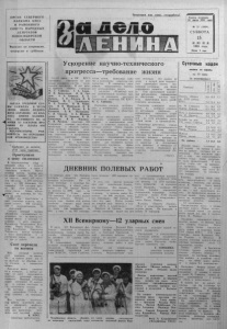 ОРГАН С ЕВ Е РН ОГ О РАЙКОМА КПСС И Р АЙОННОГО СОВЕТА НАРОДНЫХ ДЕПУТАТОВ НОВОС ИБ ИР С КО Й ОБЛАСТИ Выходит по вторникам, четвергам и с уб б о т ам. Пролетарии асах стран, соединяйтесь! Газета основана 20 июля 1935 года № 72 ( 5828) СУББОТА 15 и ю н я 1985 года Цена 3 коп. З В Е ЗД А ТРУДОВОЙ СЛА-| ВЫ ЗАЖЖЕНА В ЧЕСТЬ| ЗВЕНА ИВАНА ФЕДОРО- f ВИЧА БАРАНОВА ИЗ КОЛ-1 ХОЗА ИМЕНИ КАЛ ИНИ-! А, ЗАСЕЯВШЕГО НА 1 0 | ИЮНЯ 757 ГЕКТАРОВ ЯРО-1 ВЫМИ ИЗ ПЛАНА 18031 ГЕКТАРА. МЕХАНИЗАТОРЫ, PAB-Sj НЯЙТЕСЬ НА ПЕРЕДОВИ-1 КОВ ПРОИЗВОДСТВА! Сообщают_из колхоза «VII съезд Советов» Приступили к с е в у сил о сны х В б ла гоприятны е годы с весенним севом в колхозе были осл ожнения в св я з и с т я ж е л ы м и почвами. Нынче полевые работы вообще вести очень сложно. Н а 14 июня посеяно всего ПО г е к т а ров пшеницы и 278 г ек тар о в овса из 588 плановых. О с тавш и ес я 310 г ек таров п а ш ни все - таки намерены з а сеять овсом. Зе р н а , ес тест- ^ в е н н о , не получим, но убе- на корм. Сейчас мы приступили к севу силосных ку льтур , п р е д стоит з а с е я т ь 600 гек тар о в : 550 — подсолнечником, 50 — ку курузой. Сегодня к а ж д ы й человек обеспокоен сложившимся положением нз - з а причуд нынешней весны и поэтому о т ношение к дел у серьезное. Владимира Арсентьевича К ор ж о в а , И в ан а Ильича М и с ь кова, В ладими ра Иван овича Мосиявича всегда называ ли в числе передовик ов. и в Настоящее время они з а д а ют тон в работе. Скот перевели на выпаса Весь крупный рогатый скот перевели на выпаса. Из - з а плохих дорог мы их не выгнали на обычные места стоянок , а размести ли вблизи. Х о л о д на я весна. с л ож н о с ти с корм ами . а сейчас ко м а р не д аю т возм ожн о сти получить ж е ла ем о й п родуктивности. Вал овый суточный надой с о с т а в л я е т 33 центне- па. от коровы получаем но 7.4 ки л о гр амм а молока. На д о с т а в к е д о я р о к з а нят ав томобиль ГАЗ-66, молоко отвозим на спецмаши не. Вся массово - полити чески» р а б о т а Подчинена о д но м у — обеспечить н еобходи мый настрой v людей, с д е лать все возможное, пер ежи ть этот трудный период. В. КОСС, с е к р ета р ь п а р т о р г а н и з а ции. Ускорение научно-технического прогресса—требование жизни Суточные надои мо л о к а от коровы на 13 июня 11 —12 нюня в Ц К КПСС состоялось совещание по вопросам ускорения научно - т ех н и ческого прогресса. В его р а б о те приняли у частие тов арищи М. С. Горбачев, Г. А. Алиев, B. И. Воротников, В. В. Гришин. А. А. Громыко, Д . А. Кунаев, Е. К. Лигачев, Н. И. Рыжков, М. С. Соломенцев, Н. А. Тихонов, В. М. Чебри- ков, В. В. Щербицкий, П. Н. Демичев, В. И. Долгих, В. В. Кузнецов, Б. Н. Пономарев. C. Л. Соколов, Э. А. Шеварднадзе, М. В. Зимянин, И. В. Капитонов, В. П. Никонов. К- В. Русаков, секретари Ц К Компартий союзных республик, к р айк ом ов и обкомов партии, в я д а крупных горкомов. министры и пред сед ате ли госк ом ит етов. советские и профсоюзные работн ики, известные ученые, руководители и главны е специалисты н ауч но - п р о и зв о д с т венных и производственных объединений, предприятий , строи" тельных орг ан и з ац ий , к олхозов и совхозо в, научно - исследователь ских и п роектных инсти тутов, в узов, пер ед овые р а б о чие и колхозники , новаторы п р о изводства . В совещании у ч аст вовали представители творчес-/ кой интеллигенции, печати. С д о к л ад ом «Коренной вопрос экономической политики п а р тии» на совещании выступил Генеральный секретарь Ц К КПСС М. С. Горбачев. И зл ож ени е д о к л а д а о п у бл и к о вано в