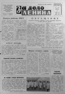 ОРГАН СЕ ВЕ РНОГО РАЙКОМА КПСС И РАЙОННОГО СОВЕТА НАРОДНЫХ ДЕПУТАТОВ НОВ ОСИБ ИР СКОЙ ОБЛАСТИ Выходит по вторникам, четвергам и с уб б о т ам. Пролетарии всех стран, соединяйтесь! Л С У Ш Газета основана 20 июля 1935 года № 79 (5835 ) С Р Е Д А 3 И Ю Л Я 1985 года Цена 3 коп. Пленум райкома КПСС Состоялся V I I I пленум р ай к ом а КПСС Н а него были приглашены се к р ета р и пар ти йных организаций , председате ли се ль ских Советов, руководители предприятий, организаций, к о л хозов С д о к л а д о м «Об ито гах р а боты ап рельского (1985 г ) П л е нума Ц К КПСС и з а д а ч и р а й онной партийной организации по за в ерш ению один н адца той пятилетки и подгото вке к XXVII съ е з д у КПСС» выступила пер вый се крета рь рай кома партии В Т. Боровская. В об суждении д о к л а д а приняли уч астие Г. Е Аленский — с е к р ета р ь п ар тбю р о к о л х о з а имени М Горького, О П. Южанина — з а в е д ую щ а я Алексеевской молочнотов арной ф е р мой ко л х о з а «П ам я ть Ленина», Г. Г. Зырянов — у п р а в л я ю щий райсельхозт ехникой. В Е. Капориков — се кретарь п а р т бюро к о л х о з а «Борьба з а мир», Г И. Кормачева — п р е д с е д а те ль р айплана . Н. А. Ипатьев — п р е д с е д а т е л ь к о л х о з а « Путь к к о м м у н и з м у » , В. А Шаурко — механик колхоза имени XXII с ъ е з д а КПСС, В. Л . Дер- гачева — секретарь исполкома Останинск ого селвского С оьета, В А. Симбирцев — прокурор района П о дан ном у вопросу п р и н я то соответствующее п о стан о в л ение. Пленум принял постан овление со зв ать очередную XXVII рай онную партийную конференцию 2 н о яб р я 1985 года У т в е р ж д е на следующая повестка дня: 1. Отчет о работе районного комитета КПСС. 2 Отчет о раб оте ревизионной комиссии райкома КПСС 3 Выборы рай он ного к ом итет а КПСС 4. Выборы ревизионной к о миссии 5. Выборы делегатов на XXII областную) партийную конференцию АГРЕГАТ ЗАПУЩЕН К н а ч а л у з аготовки к орм ов мы п о д го та вл и в а ем не только технику . что выедет п а луга кол х о з а имени К. М ар к са В первую очередь необходимо бы ло зап у с т и т ь в действие ат регат по приготовлению в и т а м и н ной муки. Он у ж е прошел в прошлом году испытание, а нынче его вновь осмотрели, о т р е монтировали И йот у ж е около недели АВМ д ействует. Пока н а г р у з к а небольша я : о д но в р еменно п роизводится регу л и р о в ка узлов. Н а п е р ер а бо тк у сейчас г.дуг сеяные т р а в ы Первые центнеры качественного к о рм а уж е отправлены на ск лад. За т ем , когда поднимутся естественные травы , нач нется их с к аш и в а ние Обеспечивает раб о ту агр е г а т а М. С. Тихонов. Машинистом на АВМ — Семен М ам ак о ь . Он хор ошо зн ает агре гат , р а б отает добросовестно. В СМЕРТЕВ, . з ав едующий мастер ской Народный контроль рассмотрел Н а очередном з ас ед ан ии р а й онного ком ите та нар одного к о н тр о л я были рас смотр ены воп росы, ка сающ ие ся раб оты р яд а предприятий Северного и к о л хозов района. Так , вновь рас смотрены ж а лобы к о л х о з о в «З а в е ты И л ь ича» и «Б о р ь ба з а мир» на несвоевременную п риемку и о т к а з от приема м о л о к а го л о в ным м а с л о з а в о дом . в р е з у л ь т а те чего только эти д в а х о з я й ств а понесли зн ачительные убытки к а к в денежном отн ош ении. т а к и в зачетном в есе п р о изведенного м о л о к а . Бы ли д а л е е ра ссмотрены резу л ь таты п роверки фи нанс ово кассовой д еяте льности ки рп ич ного з а в о д а и м а с л о з а в о д а П роверяющие о б на р уж и ли серьезные недостатки в н