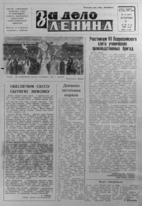 ОРГАН С Е В Е Р Н О Г О РАНКОМА КПСС И Р АЙОННОГ О СОВЕТА Н А РО Д НЫ Х Д ЕПУ ТА ТОВ НО В ОС И Б И РС КО Й ОБЛАСТИ Выходит по вторникам, четвергам и с уб б о т ам . Пролетарии всех стран, соединяйтесь^ Газета основана 20 июля 18 35 года № 82 (5 8 3 8 ) ВТОРНИК 9 и ю л я 1985 года Цена 3 коп. Плакат «За антиимпериалистическую солидарность, мир и дружйу! Издательство «Плакат» ОБЕСПЕЧИМ СКО ТУ С Ы Т Н УЮ ЗИМОВК У Особое внимание наша партия и правительство у д е ляют увеличению производства продукции животноводства. А это в основном зависит от прочной кормовой базы. В этом году весна была затяжной, дождливой Июнь также стоял ненастный. Посев зерновых и кормовых культур провести своевременно не оказалось возможным, и в большинстве хозяйств посев овса, рапса и проса на корм будет продолжаться д о 15 июля. Многие хозяйства для улучшения качества силосных посеяли смеси подсолнечника, кукурузы и сои. Колхозы «Память Ленина», «Восход», имени Максима Горького ведут у ход за кормовыми и зерновыми культурами. Ставится задача: во всех хозяйствах провести б о ронование силосных по всходам на всей площади. Этим агрономическим приемом можно уничтожить сорняки, уск орить рост и развитие силосных культур и повысить уро жайность до 50 центнеров с гектара В настоящее время нет важнее задачи как создание благоприятных условий для растений с целью получения гарантированного урожая . Большинство колхозов запустили в работу АВМ Самым ценным кормом по качеству является витаминно - травяная мука и гранулы Организованно приступили к за г о товке этого вида корма колхозы «VII съезд Советов», имени XXII съ езда КПСС, «Заветы Ильича». Медленно развертывается работа по приготовлению витаминно-травяной муки и гранул в колхозах «Новая жизнь», имени Максима Горького, имени Карла Маркса, В некоторых хозяйствах осталась прошлогодняя солома, которую необходимо сохранить на корм скоту. Старую солому целесообразно подвести к месту закладки силоса с тем, чтобы добавлять ее во время силосования и тем самым улучшить качество силоса. уменьшив влажность массы и сохранив питательные вещества. В этом году большинство сенокосов находится под водой, поэтому техникой заготавливать сено навряд ли придется. Надо будет косить и стоговать его вручную И ссылок на то, что машины на переувлажненных участках не идут, в хозяйствах быть не должно В тех же колхозах , где совсем нельзя заготавливать сено, придется выезжать в другие районы, и там прессовать сено, солому. Надо помнить постоянно, что поголовье скота нам никто не даст права сокращать, его надо будет любым способом обеспечить кормами. Во всех хозяйствах необходимо мобилизовать все население на заготовку кормов, довести определенные задания , разработать меры морального и материального поощрения, обеспечить выполнение плана по заготовке всех видов кормов. Всем организациям и предприятиям райцентра не обходимо заготовить и сдать подшефному колхозу на к а ж дого работника по три центнера сена. Это задание будет строго контролироваться, и его выполнение обязательно. Обстановка очень сложная. Требования к руководителям и специалистам колхозов, организаций и предприятий будут предъявляться в соответствии с установкой партии и правительства по выполнению плановых показателей А. ЗАЙЦЕВ , главный агроном се лъ х о зу п р а в ле н и я . Дневник заготовк