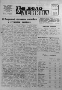 ОРГАН СЕВЕ Р НОГ О РАЙКОМА КПСС И РАЙОННОГО СОВЕТА НА Р ОДНЫХ Д ЕПУТАТОВ НОВ ОСИБ ИР СКОЙ ОБЛАСТИ Выходит по вторникам, четвергам и с убботам. Пролетарии всех стран, соединяйтесь! Газета основана 20 июля 1935 года № 94 (5850) В Т О Р Н И К 6 АВГУСТА 1985 г о д а Цена 3 коп. XII Всемирный фестиваль молодёжи и студентов завершен Москва. (ТАСС). Восемь дней жила советская столица праздником со звонким именем — фестиваль. Восемь дней следил мир з а всем, что происходило на этом грандиозном празднике, — его дискуссиями и встречами, митингами и манифестациями. Миру было важно это знать. Ведь в Москве собрались те, 0Ь ь.> олицетворяет его з а в трашний день, век грядущий. И форум юных подарил человечеству заря д бодрости и оптимизма. Он стал волнующей демонстрацией солидарности молодого поколения, его решимости бороться з а социальную справедливость и подлинную свободу, з а мир и дружбу между народами. И вот переверн ута последняя страница в фестиваль ном календаре . 3 августа Лужники прощались с фестивалем. Вновь, как и в день открытия фестиваля, были пер еполнены трибуны Центрального стадиона имени В. И. Ленина. В центральной ложе стадиона — товарищи В. И. Воротников, В. В. Гришин, Е. К. Лигачев, Н. И. Р ы ж ков, В. М. Чебриков, Э. А. Шеварднадзе, П. Н. Демичев, В. В. Кузнецов, Б. Н. Пономарев, С. Л. Соколов, Л. Н. Зайков, В. П. Никонов, К. В. Русаков. Собравшиеся встретили их продолжительными аплодисментами. В ложах и на трибунах — руководители всемирных и национальных молодежных организаций, члены международного и советского подготовительных комитетов ф е ^ тиваля, зарубежные д ел е г а ции. 21 час. Над стадионом р а з носится песнь фанфар: «Внимание! Слушайте все!». Секретарь - координатор постоянной комиссии \ международного подготовительного комитета Жан - Клод Кеннеди Сообщил, что проведенный делегатами форума откровенный диалог позволил обменяться мнениями и опытом, изыскать новые возможности для совместных действий молодежи, все это получило отражение в обращении к молодежи и студентам мира. В документе, который огласил представитель героического Никарагуа , генеральный координатор Национального исполкома Союза сандинис- ской молодежи имени 19 июля Карлос Каррион Крус, содержится призыв к молодым людям всех стран без различия их политических, философских и религиозных убеждений сдел ать все для того, чтобы остановить силы 'милитаризма и агрессии, объединенными усилиями предотвратить катастрофу, положить конец гонке ядерных и обычных вооружений на з е м ле и не допуститй ее р а з в я з ы вания в космическом пространстве, добиться всеобщего запрещения и ликвидации ядерного и других видов оружия массового уничтожения. Уникально широкий по своему составу - XII Всемирный фестиваль молодежи и студентов продемонстрировал общее стремление молодых людей во всем мире, представляющих различные политические взгл яды, развивать контакты; и обмены и выступать за совместные действия в защиту мира. Рукоплескание,- прокатившееся по стадиону, — словно коллективная подпись, скр е пившая манифест молодежи планеты. Торжественно разносится над Лужниками перезвон Кремлевских курантов. В нем слышен голос истории, частицей которой отныне станет и всемирная встреча молодежи и студентов в Москве. Ее эмблема — пятицветная ромашка с белоснежным голубем в сердцевине — возникает на худо