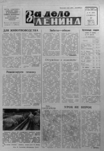 ^ «ЗА Д Е Л О ЛЕ НИНА » У/7?727/77>777/77ГУ;'/У’' ' »Ns 99 ( 5 8 О О ) Д ел о первейшей важности А п р е л ь ск и й ( 1 9 8 5 г. ) П лен ум ЦК КПСС с ф о р м у л и р о вал концепцию у с к о р е н и я социально - эк оно ми ческого развития страны на б а з е научно - т е хн и ч е с кого пр о гр ес са . З а д у м ы в а я сь н а д . такими понятиями, как новое качество наш его развити я и / страт еги чески важные направления , с т р ук т ур н ая п е р е с т р о й к а пр ои зв о д ств а и п е р е х о д на ин тенсивные р ельсы , эф ф ек ти вны е ф о р мы упр ав лени я , б о л е е пол н о е р еш е н и е социальных п р о бл ем , о п р е д ел ен н ы х на П л е н у м е , прикидываешь на свой район. В е д ь и Северный район — частица нашей страны. И все то, о чем говорилось на П лен у м е , на июньском с о в е щании Ц ен тр аль н о го Комитета КПСС в пол ной м е р е к а с а е т с я и нас. Говоря о п е р е с т р о й к е п р о и з в о д с тв а применит ельно к нам, в п е р в у ю оч ер ед ь , им е е т с я в в и д у ж ив отн овод ство и пол ев о д ст во . Они для района являются о п р е д е л я ющими, м о ж н о ск азать , ч т о при нимаются н е к о т о рые меры. Д л я д а л ь н ей ш е го р а з в и т и я ж и в о тн ов о д ст ва в е д е т с я у к р еп л ен и е кормовой базы, решаются вопросы корм опригот овл е- ния. Это , в некот орой с т е п ен и , д а е т п ол ож ит ел ьны е р е з у л ь т а ты , но не настольк о , чтобы м о ж н о было ск азать , что в о зм ож н о с ти исчерпаны все. С р а вн ит ел ьн о б ы с т р у ю о т д а ч у , о тм еч ал о сь на П л е н у м е , м ож н о получить, е с л и привести в дей с т в и е о р гани зац ион но - э к ономи ч ес к и е и соц иальные р е зе р в ы , и, в перв ую о ч ер ед ь , активизировать ч ел ов ече ск и й фак тор , доби ться того, чтобы каж ды й на св о ем м е с те р а б о т ал д о б р о с о в е с т н о и с полной отдачей. Одной и з ф о р м активиза ции этог о фак т ор а , как у ж е у б е д и л и с ь , явл я ется в н е д р е ние пр о гр е с си в н ы х форм ор ган и зац и и т р у д а , в ч а с т ности. бр и г а д н о г о п о д р я да. В этом направлении в р а й о н е мн огое с д е л ан о . У с п еш н о р аботаю т зв ен ья с кол лективной оплатой т р у д а в ж ив о тн ово д с тв е к о л х о з о в «П амять Л е н и н а » , имени М. Горького. Н е о д нократно отм ечались з в е нья В. А. Ш а у р к о на выращивании з е р н о в ы х из к о л х о з а имени X X I I с ъ е з - Х о т я т обедать в Ичкале Не .м ож е т чел овек , пр и выкший с м о л о д у т р у ди ть с я не п ок л а д ая рук, д о л г о о т дыхать выйдя на пенсию или о тк а за ть в п ом ощи кол л ек т и в у , г д е век отработал . Вот так сл у ч и л о сь и с Ан ной Ст епановной Мамако- вой, н еко г д а п е р е д о в о й д о яркой, ныне п енсион еркой . Попросили е е готовить о беды дл я м е х ан и за т ор о в , прибывших сю д а на п ери од з а г о товки кормов. Она с о г л а с и л а сь , хотя зд о р о в ь е пош алив а ет и ст оять у горячей Плиты е й нелегко. К р а с н о речивым св ид етель ств ом того, как вкусно она го т о вив, стал о т к а з б ер г у л ь с - ких ш о ф ер о в е з д и т ь дом ой о б ед а т ь . Они хотят с т о л о ваться в Ичкале « у тети А н и» . , Т. Л УП Е КО . да КПСС, В. А . Коржова на выращивании силосных из кол х о за «VII с ъ е з д Советов». Новое всегда тр еб у е т . с е р ь е зн о г о изучения, опр ед е л е н и е роли и места о р ганизаторов и конкретных исполнителей. Об этом шла речь на бюро районного комитета партии, где был р а ссм отрен вопрос о р або те безнар ядны х звеньев на выращивании силосных и з е рн о вы х культур в колх о з е «VII с ъ е з д Советов». Отмечал ось , что ра б о т ая в сл о