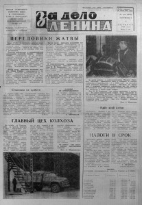 Пролетарии всех стран, соединяйтесь^ ОРГАН СЕВЕ Р НОГ О РАЙКОМА КПСС И РАЙОННОГО СОВЕТА НАР ОДНЫХ ДЕПУТАТОВ НОВ ОСИБ ИР С КОЙ ОБЛАСТИ Выходит по в т о р н и к а м , четвергам и с убботам. Газета основана 20 и ю л я 1935 г о д а № 119 (5875) П Я Т Н И Ц А ' 4 о к т я б р я . ! 9 85 г о д а Цена 3 коп. П Е Р Е Д О В И К И Ж А Т В Ы Совет РА ПО и президиум рай кома проф- •союза работников сельского хозяйства р а с смотрели итоги социалистического соревнования колхозов, звеньев на уборке у р о жая по состоянию на 30 сен тября 1985 года и постановили: Признать победителем в социалистическом соревновании коллектив колхоза «П амять Ленина» (председатель М. В. Лукашов, секретарь парткома Я. Д. Дьячук, председател ь сельсовета И. А. Гриц, председатель Профкома В. М. Пасько, главный а г роном В. М. Шрейдер), убравший 96 ,2 процента к уборочной площади всех зер новых, при урожайности 16,4 центнера с гектара; вспахавший 4 4 , 9 процента зяби к плану. Второе место присудить коллективу колхоза «Наша Родина» (председатель Г. Н. Хрущев, секретарь парторганизации Н. А. Пианов, председатель сельсовета И. А. Гриц, председатель профкома О. В. Р е з ниченко, главный агроном С. В.. Туровец), убравшему 86,1 процента к уборочной площади всех зерновых, при урожайности 17 центнеров с гектара; вспахавшему 40 - процентов зяби. Третье место присудить коллективу' к о л оса нм. К. М аркса (председатель М. Е. Голубцов, секр е тар ь парторганизации Г. Д. Молоков, председатель сельсовета Г. Г. Шуршев, председатель профкома И. И. Сидорова, главный агроном Т. Т. Гнутов), у бравшему 99 процентов уборочной площади всех зерновых, при урожайности 13,1 центнера с гектара; вспахавшему 20 процентов зяби. Коллективы колхозов, зан явших кл а с сные места, занести на районную Доску попета. В социалистическом соревновании среди звеньев первенство присудить коллективу звена Ф. В. Пещерского из колхоза «Память Ленина», намолотившему 1 3 350 центнеров зерна, при выработке на каждого члена звон? 2 6 7 0 центнеров. Среди звеньев на уборке силосных куль Tvp первенство присудить коллективу звена Н. И Цыплакова из колхоза им. Калинина, убравшему 6 0 0 гектаров и заложившему 0 3 2 5 0 центнеров зеленой массы. Выработка на один силосный комбайн составила 4 1 6 2 5 центнеров. С т ы к о в к а н а о р б и т а 2 ок тября 1985 года осуществлена стыковка спутника «Космос-1686» с орбитальным пилотируемым комплексом «Салют-7» — «Союз Т-14». Спутник пристыкован к станции со стороны ее переходного о т сека. Программой полета пилотируемого комплекса предусмотрены испытания оборудования, агрегатов и элементов конструкции спутника, дальнейшая отработка методов управления сложными орбитальными комплексами больших габаритов и масс, а т а к ж е проведение научных исследований и экспериментов. Спутник «Космос-1686» доставил на станцию оборудование, аппаратуру, различные грузы, необходимые для обеспечения дальнейшего функционирования пилотируемого комплекса. * (ТАСС) Р А Б О Т Ы НЕ П РЕ К РАЩ АЮ Т С Я В трудных погодных у с л о виях наши механизаторы з а готавливали корма для животноводства. В нашей бригаде звено Николая Александровича Петрова застоговало 12192 це нтнера сена, что " п,гги на двести центнеров больше плана. Запасен силос,' и готовлено более шестисот ттрнтнеров тр авяны х гранул. Продолжается в колхозе уборка зерновых, вспашка зяби, скирдование соломы. Г. Б Е Р Е Ж Н А Я ГЛАВНЫЙ ЦЕХ К О Л Х О З А 
