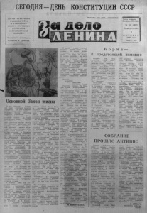СЕГОДНЯ-ДЕНЬ КОНСТИТУЦИИ СССР О Р Г А Н С Е В Е Р Н О Г О Р А Й К О М А К П С С И Р А Й О Н Н О Г О С О В Е Т А Н А Р О Д Н Ы Х Д Е П У Т А Т О В Н О В О С И Б И Р С К О Й О Б Л А С Т И В ы х о д и т по в т о р н и к а м , ч е т в е р г а м и с у б б о т а м . Пролетарии всех стран,__соединяйтесь! Газета основана 20 ию ля 19 35 го д а № 121 (5 8 7 7 ) Понедельник 7 О К Т Я Б Р Я 1985 г о д а Цена 3 коп. Основной Закон жизни У нас праздник... Советские люди отмечают восьмую годо вщ ину со дня принятия новой Конституции СССР — Основного Закон а общества развитого социализма. Минуло восемь лет. И мы уверенно говорим: да, новая Конституция живет, р або та ет, успешно помогая движ е нию советского народа вперед. По - боевому, энергично д ей ствуют все звенья политической системы нашего общества, функции которых вп ервые с такой полнотой и четкостью очерчены в Основном Законе. Огромная политическ а я и организационная работа р азвернута Коммунистической партией, являющейся руководящей и направляющей силой нашего общества, я д ром его политической си стемы, государственных и общественных организаций. Во всей своей политической, организаторской и воспитательной работе КПСС неизменно исходит из необходимости всестороннего развертывания социалистической демократии. Ее расширение и углубление составляют магистральное направление р а з в и т а я политической системы общества зрелого социализма. Советские люди все активнее используют представленные им Основным Законом социал ьно - экономические, политические и личные права и свободы. Возьмем провозглашенное ею право граждан участвовать в управлении государственными и общественными делами. В Феврале 1985 года состоялись выборы в местные Советы и Верховный Совет РС Ф С Р , в результате которых состав органов власти пополнился новыми д епутатами. В Верховный Совет Р С Ф С Р избран а доярка кол хоза имени М. Горького 3. К. Чернова. В областном Совете наш район представляют два депутата: В. Т. Б оров ск а я — первый секретарь райкома КПСС и Г. И. Иванова — техник осеменатор колхоза имени Карла Маркса, депутатами районного и сельских Советов избрано 3 5 5 человек, здесь Представлены все категории т р у д я щихся, осуществлена п р е ем ственность, подчеркнуто р а в ноправие женщин. Из общего числа депутатов женщин 185 человек, колхозников— 182, рабочих— 70, ч л е нов комсомола избрано 72, членов КПСС— 137. Из числа депутатов Советами создано 48 постоянных комиссий. Комиссии активно участвуют в подготовке вопросов на сессии Советов, н а заседания исполкомов, проводят пров ерки; осуществл яют контроль з а исполнением собственных решений и решений вышестоящих организаций. Депутаты получили много н а к а зов, в которых выражена з а бота людей труда о делах государства, общественных интересах, нуждах своих сел. Приняты к исполнению н а к а зы, данные В. Т. Боровской и Г. И. Ивановой. Депутатами областного Совета будет оказан а помощь в строительстве нового Дома ку льтуры на 5 0 0 мест в сел е Северном. Срок исполнения наказа — 1985 88 годы. На начало выделено 3 0 0 тысяч рублей, строител ьства в 1985 году Будут выделены дополнительные средства на строительство участковых больниц в районе. Районным ц сельскими Советами принято к исполнению на 19 созыв 21 5 н а к а зов, из них уже исполнено 54. В р е з у л ь т а те исполнения наказов будут открыты новые учреждения культуры, здравоохранения, прос 