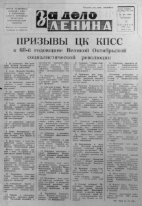 ОРГАН СЕВЕ РН О ГО РАИКОМЛ КПСС И РАЙОННОГО СОВЕТА НАРОДНЫХ ДЕПУТАТОВ Н ОВОСИ БИ РС КО Й ОБЛАСТИ Выходит по вторникам, четвергам и с у б б о т ам . Пролетарии всех стра н, соединяйтесь! Г а з е т а основана 20 июля 1935 г о д а .1Vo 125 (5881) Ч Е Т В Е Р Г 1 7 О К г я Б Р Я 1985 года Цена 3 коп. ПРИЗЫВЫ ЦК КПСС к 68-к годовщине Великой Октябрьской I социалистической революции 1. Д а зд р а в с т в у е т 68-я годов щина Великой Октябрьской с о циалистической революции! 2. Слава Великому Октябрю, открывшему новую эп о х у в истории человечества — эп о х у п ер ех о д а от капитализма к с о циализму и коммунизму! 3. Д а зд р а в с т в у е т марксизм- ленинизм — вечно ж ив о е ре волюционное интернационалыф ное учение! 4. Д а зд р а в с т в у е т К оммунистическая партия Советского Союза — руководящая и направляющая сила советского общества! производство пер ед ов ой опыт, достижения науки и техники! Всемерно д о б и в а й т есь интенсификации экономики, повышайте производительность т р у да! 14. Инженеры и техники, и зо б р ета тели и р а ц и о н а л и з а торы! Ум ножайте свой вклад в ускорение научно - технического прогресса! 15. Советские ученые! Вы находитесь на передовой линии борьбы з а ускор ен и е научно- технического прогресса! Страна ж д е т от вас новых научно- технических р а з р а б о т о к высокой эффективности! 5. Слава великому советско му народу — строителю коммунизма , стойкому и п о с л е д о вательному бо р ц у з а мир! 6. Д а зд р а в с т в у е т неруши мый сою з рабочего класса, кол х о зн ого крестьянства и н а р о д ной интеллигенции! Д а зд р а в с т в у е т нерастор- ое интернациональное един- и братская д р у ж б а наро7 жи ст дов СССР! 8. Слава большевикам - л е нинцам, ветеранам партии, героям Октября, всем борцам з а п о б е д у социализма! 9. Пусть живет в веках б е с примерный подвиг советского н арод а , о д е р ж а в ш е г о п о б е д у в Великой Отечественной войне! Вечная сл а в а героям, павшим в боя х з а с в о б о д у и независимость нашей Родины! 10. Грудящиеся Советского Союза! Встретим XXVII с ъ е з д КПСС новыми трудовыми свершениями, высокими д о с т и жениями во всенародном с о циалистическом соревновании! Будем р аботать у д а р н о , по- стахановски! 11 Трудящиеся Советского Союза! Выполним план 1985 года, успешно завершим о ди н надцатую пятилетку! 12. Коммунисты! Будьте в а в а н г а р д е в сен ародного д в и жения з а ускор ен и е социально- экономического развития стра ны! 13. Рабочие и колхозники, специалисты н ародн ого х о з я й ства! Настойчиво внедряйте в 16. Машиностроители! З а вами - решающ ее слово в т е х ническом п ер ев оор уж ени и н а родного хо зяй ства ! Быстрее с о з д а в а й т е вы сокопроизводи тельные машины и о б о р у д о в а ние! 17. Работники топливно-энергетического комплекса! Увеличивайте добычу нефти, г а за , угля, производство электричес кой и тепловой энергии! Активно боритесь з а выполнение Энергетической программы! 18. Строители и м о н т аж н и ки! Повышайте эффективность строительства! Стройте экономично и д о б ротно, на современной техни ческой основе! С давай те п ус ковые объекты с высоким к а чеством и в срок! 19. Работники транспорта и связи! Д о б и в а й т е с ь б е с п е р е бойной перевозки грузов, высокой культуры о б служ ив а н и я аселения! 5 20. Труженики с ел а , всего агропромышленного комплекса! Настойчиво выполняйте Продовольственную программу, у в е личивайте производство продукции зе м л