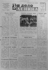 ОРГАН С Е В Е Р НОГ О РАЙКОМА КПСС И Р АЙОННОГ О СОВЕТА НА Р О Д НЫХ Д Е ПУТАТ ОВ Н О В ОС ИБ И Р С К О Й ОБЛАСТИ Пролетарии всех стран, соединяйтесь! / ■ « I Выходит но вторникам, ч е т в е р г а м и с уббот ам. Перед выездом в лесосеки План заготовки ле с а на предстоящий год коллективу Северного леспромхоза предусмотрен такой же. как и на 1985 — 66 тысяч кубометров. Объем работ большой и сейчас все подчинено основной зад ач е — выезду в лесосеки. Заканчивается ремонт техники, которая будет использована на вывозке деловой древесины с верхнего склада на нижний. Подготовкой дороги на Першу и Ем ел ьджу (протяженнос ть ее составляет около 1 6 0 ' километров) з а няты водители вездеходов L, М. Н. Иваницкий и С. И. ' Крапивин. Заключены до- г о ю р а с хозяйствами, обес- печиг,ающ ими леспромхоз бригадами лесозаготовителей. Обычно на делянах работает около 3 0 0 челочек. Заканчивается 1985 год. По предварительным подсчетам, мы можем ск а зать, что с доведенным заданием мы справимся. План по выпуску валовой продукции 3 миллиона- 9 04 тысячи рублей, выполнен па 3 миллиона 8 2 4 ты ся чи. Несколько отстаем с выполнением плана по реализации продукции. До конца года необходимо дополучить еще 2 20 тысяч рублей. Успешно справляетс я с заданием коллектив рабочих пилоцеха. Выпущено 30 тысяч кубометров пиломатериалов, что составл яе т 125 процентов к годовому плану. Образцы труда показывает ст арейший р а м щ и к Б. Г. Рыль- скин. В леспромхозе трудятся и его сыновья А ле к сандр и Сергей. Два года, после службы в армии, р а ботает рамщиком Виктор Евграфов. На его счету в этом году более шести тысяч кубометров пиломатериала. С уважением мы называем женщин. з ан я тых на сортировке пиломатериала. Это — Н. * II. Карпачева, Л. И. Лузанен- ко Р. К. Степанова, Текущая неделя в леспромхозе объявлена удар ной в честь предстоящего XXVII съезда КПСС. Ее р езультаты зависят от каждого члена нашего коллектива. П. ДИГИНА, экономист. В ЧИСЛЕ ЛУЧШИХ Машину Николая Сергеевича Медведева из «Транссельхозтехники» можно встретить на дорогах района. но чаще всего идет его З И Л - 5 5 4 в город за столь необходимыми району грузами. Приходилось ему работать и в хозяйствах. Осенью в составе водительских звеньев трудился он на уборке урожая, з а к л а д ке силосных. И всюду о нем отзываются к ак о надежном товарище, добросовестном водителе. За десять месяцев перевез Николай Сергеевич 2 3 0 0 тонн народнохозяйственных грузов, опередив многих шоферов <Тран ссельхозтехники». Э. МАРКОВА. К о л хо зны й шофёр На Доске почета колхоза имени XXII съ е з д а КПСС — имена знатных людей хозяйства, своим трудом добившихся славы и уважения односельчан. Среди них и Виктор А ле к сандрович Кейль, водитель автомашины ГА З -53 . Его хорошо знают в колхозе как человека . который о т лично разбирается в тех нике, и. что самое г л а в ное, любит ее. Поэтому его можно часто • увидеть около а в т о м а ш и н ы , даже в нерабочее время. 'у водителя есть одно твердое правило — чтобы техника шла без аварий, за ней нужен уход. В. А. Кейль относится к машине как хороший заботливый хозяин. И она испра- чо служит. шофер доставляет на ней грузы из города, по бригадам колхоза. Односельчане избрали В. А. Кейля депутатом к сельский Совет. И он своим трудом подтверждает высокое звание народного избранника. Н. ТЕРЕХИН РАЦИОНАЛИЗ АТОРЫ Рационализа тором может стать только тот человек, ко
