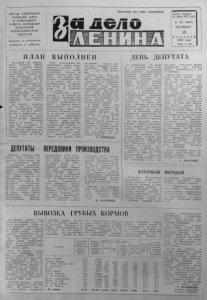 ОР ГАН С Е В Е Р Н О Г О Р АЙКОМА КПСС И Р АЙОННОГ О СОВЕТА Н А Р О Д НЫХ Д Е ПУ Т А Т ОВ НО В О С И Б И Р С К О Й ОБЛАСТИ Выходит по вторникам, четвергам и с у б б о т а м. Пролетарии всех стран, соединяйтесь! Газета основана 20 июля 1935 года J4i 151 (59 0 7 ) Ч Е Т В Е Р Г 19 Д Е К А Б Р Я 1 9 8 5 г о д а Цена 3 коп. В Ы П О Л Н Е Н И Л А Н Последний год одиннадцатой пятилетки приближае тся к финишу. Живот новоды района напряженно работают над успешным завершением планов продажи государству молока и мяса. В числе тех, кто досрочно сп равился с з а данием — животноводы колхо за «Память Ленина». К середине декабря они отправили на маслозавод 12730 центнеров молока, выполнив план ца 101 ,3 процента. 8 9 процентов продукции сдано пе рвьш сортом. На фермах хозяйства уже не один год действует коллективный метод работы. Он дает преимущества в организации груда, а увеличении производства молока. Например, звено Т. Г. Мазуриной надоило от коровы с начала года в среднем по 2 2 3 6 килограммов молока. Дружно работают мастера машинного доения и скотники звена М. Е. Пахомовой. ДЕПУТАТЫНедавно состоялся р а й онный День депутата, и радостно было видеть на нем избранников народа — передовиков .сельскохозяйственного производства, доярок , скотников, т р ак т о ристов, комбайнеров. Приятно было и слышать о них добрые слова из уст выступающих. Так, например, руководитель Че- баковской депутатской группы, учительница Витимской начальной школы Ю. М. Антипина н а зы в а ла имена доярки Галины Филипповны Б ер еж ной и механизатора Николая Александровича Петрова. Опыт, накопленный жи вотноводами одного звена, при дается гласности, р а с пространяется . в других коллективах, поэтому на фермах колхоза нет отстающих. Все трудятся напряженно и стабильно. Почти на равных идут в социалистическом соревновании звен ья Н. Ф. Колм аковой, Г. Ф. Осиповой, Е. К. Галки. У большинства доярок колхоза — з а плечами годы работы на ферме. Они не оставят без внимания молодого животновода, помогут в трудную минуту. В заимовыручка и сл аж е н ность служат одним из основных сл ага емых в борьбе за высокие пока затели. Коллектив животноводов колхоза продолжает сверхплановую сдачу молока. Второе направление животноводческой отрасли — мясное. На этом участке производства т акж е ""досрочно, к середине декабря, завершен о годовое задание по продаже мяса р а с с к а з ы в а л а о их трудовых успехах. Они во зг л а в ляли звенья , работающие н а единый наряд . Механизаторы сумели и в сложных условиях нынешнего года перевыполнить план заготовки сена, а звено Г. Ф. Б ережной зан яло второе место в кол хозе по надоям молока. Высоких показателей в труде добиваются д епутаты, работающие в других сферах производства. Так, например, на сто с лишним процентов выполнило п л а ны Верх - Красноярское почтовое отделение, которым руководит депутат государству. Колхоз должен был отправить на м я сокомбинат 158 0 центнеров, а сдал 1590 центнеров. Сделать это было нелегко , особенно в нынешних сложных погодных условиях, но на вы р ащ и в а нии молодняка в хозяйст ве зан яты люди, душой преданные своему делу, поэтому летом они сделали все. чтобы молодняк был поставлен на зимовку кр еп кий, что га рантирует неплохие привесы при соответствующем рационе. В общем успехе есть Доля труда каждого ж и вотновода хозяйства. Выращивают молодняк' А И Римм ер . Ф. А. Щ ер б а ков. И. А. Га