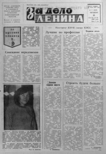 Газета основана 20 июля 1935 года 7 (5 9 1 9 ) ЧЕТВЕРГ Я Н В А Р Я 1986 г о д а Цена 3 коп ОР ГАН С Е В Е Р Н О Г О Р АЙКОМА КПСС И Р А ЙО ННО Г О СОВЕТА Н А Р О Д НЫХ Д Е ПУ Т А Т ОВ Н О В О С И Б И Р С К О Й ОБЛАСТИ Выходит по вторникам, четвергам и с у б б о т ам. Совещание Во вторник 14 я н в ар я состоялось совещание передовиков предприятий местной промышленности, сферы обслуживания, кол хозов, предприятий, входящих в состав РАНО. С докладом выступил председатель совета р ай онного агропромышленного объединения А. М. Ч у р кин. в котором он дал ан ализ производственной деятельности предприятий и колхозов в 1985 году, вы ск а зал ряд существенных претензий к руководителям колхозов и предприятий , обслуживающих их, определил' задачи РАНО на первый год двенадцатой пятилетки. На совещании выстуПЕРЕХОДЯ1ЦИИ КРАСНЫЙ ВЫМПЕЛ ГАЗЕТЫ «ЗА ДЕЛО ЛЕНИНА» З А ВЫСОКИЕ ПО КАЗАТЕЛИ В ВЫРА ЩИВАНИИ молодня КА ПРИСУЖДЕН МАРИИ ЕЛИСЕЕВНЕ СТАР КОВОИ, ТЕЛЯТНИЦЕ КОЛХОЗА ИМЕНИ КАР ЛА МАРКСА, ДОБИВШЕЙСЯ В ДЕКАБРЕ СРЕДНЕСУТОЧНОГО ПРИ РОСТА ПО 6 9 3 ГРАММА НА КАЖДУЮ ГО ЛОВУ. передови ков пил главный зоотехник колхоза «Путь к коммунизму» А. М. Болдырев, шофер «Транссель'хозтех ники» 11. И. Циплаков, директор Северного м а с лозавода А. М. Глухов, с ек р е та р ь парторганизации колхоза имени М. Горького Г. Е. Аленский, начальник страхового у ч а с т к а РУС а 3. Н. Поветки- на, механик второй -бригады колхоза имени XXII съ е з д а КПСС А. Г. Щ ер баков. Были приняты социалистические о б яза те ль ства на 198 6 год. Для участников сове щани я артисты Новосибирской государственной филармонии дгёш концерт. Качество, быстрота, культура — эти принципы в соответствии с Комплексной программой производства товаров народного потребления и развития сферы услуг на 1 9 8 6 — 2 0 0 0 годы стали основными в работе швейников. И еще одну задачу поставил перед собой коллектив ателье — создать максимум удобств для заказчика. Для этой цели была сделана открытая витрина с образцами тканей, поставлены к^-о.<а, столик с журналами мод, оборудована примерочная. В ближайшее время закройный цех разместится на первом этаже. 15 лет работает Валентина Михайловна Язовская (на <1я*мке) в швейном производстве. Сейчас она заведует це- ж «т . Коммунист, честный и отзывчивый товарищ, в коллективе пользуется заслуженным авторитетом. Швейный цех ия; пода в год выполняет план. Фото И. Любимова. Навстречу XXVII съ е з д у КПСС = . Лучшие по Закончен год 1985. На совещании передовиков производства звучали слова признательности в а д рес тружеников района, завершивших его у сп еш но, добившихся высоких показателей. И одним из первых было названо имя Алексея Федоровича Щ ер бакова, ш офера «Тран ссельхозтехники» . Среди водителей района А. Ф. Щербакову присуждено первенство и присвоено звание «Лучший по профессии». Годовой план по грузообороту передовой шофер выполнил на 151,2 процента. Он награжден Почетной г р ам о той рай ком а КПСС, исполкома рай совета, райко ма профсоюза работников сельского хозяйства и райкома ВЛКСМ. Почетное звание « Л у ч ший по профессии» по пра ву за сл уж и л и м ех ан и за тор колхоза имени Максима Горького Александр Александрович , Легачев, выполнивший годовой план профессии иа 189 процентов. Имя А. А. Легачева занесено на районную Доску почета. Труд опытного механизатора отмечен Почет ной грамотой райкома партии, исполкома райсовета, райкома про