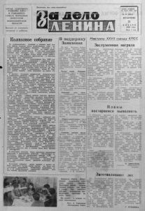 Г а зета основана 20 июля 1935 г о д а № 9 (5 9 2 1 ) ВТОРНИК Я Н В А Р Я 1986 года Ц ен а 3 коп ОРГАН СЕВЕРНОГО РАЙКОМА К П СС ' И РАЙОННОГО СОВЕТА НАРОДНЫХ ДЕПУТАТОВ НО ВО СИ БИ РСКО Й ОБЛАСТИ Выходит по вторникам, четвергам и субботам. Пролетарии всех стран, соединяйтесь! д е л и Н Т Т Н Колхозное собрание По устан овившей ся традиции в зимнюю пору кол хозы района подводят итоги хозяйственного года, намечают планы дальнейшего развития. Отчетное и отчетно - выборное собрание — одно из самых волн у ющих событий в жизни артели. В этот день колхозники особенно я р к о ощущают силу своего коллективного р а з у : а и вели, в цифрах отчета видят плоды совместного труда в общественном производстве, в наметках очерчивают день завтрашний. Не очень удачным и плодотворным был 198 5 год. Не на всех собраниях колхозники с гордостью отметят свой вклад в общерайонный хлебный карав ай. Меньше, чем в прошлые годы, получило государство от работников животноводства молока и мяса. И все же в этих неблагоприятных условиях такие колхозы, к ак «Пам ять Ленина» , «Путь к коммунизму» , имени М. Горького сумели поднять свою экономику на новую ступеньку. В проекте Основных направлений экономического и социального разви ти я страны на двенадцатую пятилетку вновь у к а зы в а е т с я , что у скорение темпов р а з вития сельского хозяйства я в л я е т с я важнейшей политической и общегосударственной задачей. П артия з а ботится о том, чтобы подвести под сел ьскохо зяйствен ное производство более мощную материально-техническую базу . Долг з ем л ед ел ьцев ■— раз умно , по-хозяйс- кн р асп оряди ться землей, удобрениями, машинами и. трудовыми ресурсами, приложить максимум усилий к устранению недостатков в р азвитии колхозного производства, обеспечить безусловное выполнение заданий первого года пятилетки. Как и раньше, главной заботой сельских тружеников должно быть дальнейшее ра зви ти е животноводства, не оставляя, конечно, без внимания вопросы производства зерна и кормов. Следует неукоснительно улучшать качество продукции. Особого внимания з а служивают вопросы улучшен ия экономической р аботы, совершенствования организации и оплаты труда, снижения себестоимости продукции, повышения рента бельности всех отраслей, обеспечения неуклонного рос та производительности труда. Правлениям колхозов нужно подумать о возрождении таких отраслей , как свиноводство, овцеводство, коневодство, птицеводство, пчеловодство, рыбоводство. Подготовка и проведение отчетно - выборной к ам пании — наиболее подходящее вр ем я д л я широкого с бсуждения и квалифицированного решения этих и других жизненно важных вопросов, мобилизации внутренних р е зервов роста колхозной экономики. Важно вовл еч ь в подготовительную работу иаиболь шее число колхозников. З а с л у ж и в а е т внимания опыт колхозов, где практикуют предв арительное обсуждение отчетов правлений на бригадных собраниях, проводят вечера вопросов и ответов, вывешивают в кл убах и других общественных местах диаг раммы и таблицы, показывающие развитие х о зя йств а з а ряд лет . Все это позволит колхозникам предварительно ознакомить ся с итогами года, пора змы слить над ними, тщ а те ль но подготовиться к выступлению или подать деловое предложение. Необходимо учесть уроки прошлой отчетно - выборной кампании , когда в ряде колхозов неудовлетворитель