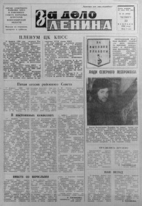 ОРГАН С Е В Е Р НО Г О РАЙКОМА КПСС И РАЙОННОГО СОВЕТА НА РО Д НЫХ Д Е ПУ ТА ТОВ Н О В О С ИБ И РС КО Й ОБЛАСТИ Выходит по вторникам, четвергам и с уб б о т ам . Пролетарии всех стран, соединяйтесь! Газета основана 20 июля 1935 года № 22 (5 9 3 4 ) Ч Е Т В Е Р Г 20 Ф Е В Р А Л Я 1986 года Цена 3 коп. ПЛЕНУМ 18 февраля 1986 года состоялся Пле пум Центрального Комитета Коммунистической партии Советского Союза. Пленум обсудил следующие вопросы: 1. О политическом докладе Центрального Комитета КПСС XXVII съ езду Коммунистической партии Советского Союза. 2. Об основных итогах общепартийного и общенародного обсуждения проекта но вой редакции Программы КПСС и внесении его на рассмотрение XXVII съезда КПСС. 3. Об итогах обсуждения изменений в Уставе КПСС и внесении проекта измененного Устава партии на рассмотрение XXVII съезда КПСС. 4. О докладе XXVII съезду КПСС об Основных направлениях экономического и социального развития СССР на 198 6 — 1990 годы и на период до 2 0 0 0 года. 5. Об итогах всенародного обсуждения проекта «Основные направления экономического и социального развития СССР на 1 9 8 6 — 1 9 9 0 годы и на период до 2 0 0 0 года» и внесении этого проекта на расЦК КПСС смотрение XXVII съезда КПСС. По этим вопросам заслушаны доклады товарищей Горбачева М. С. и Рыжкова Н. И. Пленум одобрил представленные доклады, проекты новой редакции Программы КПСС, измененного Устава партии и Основных направлений и принял решение внести эти документы на рассмотрение предстоящего XXVII съезда Коммуниста ческой партии Советского Союза. На Пленуме рассмотрены организационные вопросы. Пленум избрал т. Ельцина Б. Н. кандидатом в члены Политбюро ЦК КПСС и освободил его от обязанностей секретаря ЦК КПСС в связи с переходом на работу в Московский городской комитет партии. Пленум освободил т. Гришина В. В. от обязанностей члена Политбюро ЦК КПСС в связи с уходом на пенсию. Пленум освободил т. Русакова К. В. от обязанностей секретаря ЦК КПСС в связи с уходом на пенсию по состоянию здоровья. (ТАСС) П ятая сессия районного Совета 17 ф е в р а л я 1986 года сост оялась пятая сессия Северного районного Совета народных депутатов девятнад цатого созыва. Сессия р а с смотрела вопрос: «О мерах по \в еличению ' ресурсов сель (■.нехозяйственных продуктов и улучшению снабжения населения района продовольственными товарами». С докладом по данному вопросе выступил начальник уп р а вл е ния сельского хозяйства, депутат А. М. Чуркин. С содокладом выступил член постоянной комиссии по сельскому хозяйству и охране природы, депутат И. И. За- камский. В прениях по обсуждению докладов выступили: Ф. Л. Кудряшов — ‘ председатель колхоза «Борьба за мир», Н. А. С тепанова- - главный бухгалтер колхоза имени М. Горького, А. Г. Щербаков — механик колхоз а имени XXII съ езд а КПСС, А М. Глухов — директор Северного маслозавода, А. Ф. Осипова заведующая ф е р мой колхоза «Память Лепина», А. А. Гражданки н -- главный инженер « Тр ан ссельхозтехники», В. В. Юнаков — пр едседатель правде ния райпо, И. К. Огаркова - диспетчер райсельхозтех- нпкн. По обсуждаемому вопросу принято соответствующее ре шенне. В постоянных комиссиях 17 ф е вр а л я состоялись очередные заседания комиссий, на которых р а ссм о тр ены плановые вопросы хозяйственной д еятельности предприятий и организаций, исполкомов сельских Советов народных депутатов. Планово - бюджетная комиссия ра ссмотрела воп