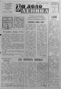 Газета основана 2 0 ‘ июля 1935 года № 3 2 ( 5 9 4 4 ) С У Б Б О Т А 15 О Р Г А Н С Е В Е Р Н О Г О Р А Й К О М А К П С С И Р А Й О Н Н О Г О С О В Е Т А Н А Р О Д Н Ы Х Д Е П У Т А Т О В Н О В О С И Б И Р С К О Й О Б Л А С Т И Выходят по вторникам, четвергам и субботам . ПЕРЕХОДЯЩИЙ КРАС I НЫИ ВЫМПЕЛ ГАЗЕТЫ « З А ДЕЛО ЛЕНИНА» 3A S ВЫСОКИЕ ПОКАЗАТЕЛИ В ВЫРАЩИВАНИИ! МОЛОДНЯКА ПРИСУЖДЕН ТЕЛЯТНИЦЕ К О Л - ; ХОЗА «ПАМЯТЬ ЛЕНИ- < НА» МАРИИ МИХАИ- \ ЛОВНЕ ФРОЛОВОЙ, ДОБИВШЕЙСЯ В ФЕВРА-5 ЛЕ СРЕДНЕСУТОЧНОГО i ПРИРОСТА ПО 8 9 4 ГРАМ ; МА НА КАЖДУЮ ГОЛО | В полёте—«Сою з Т-15» ч ск е о ск м В ог С с о о о о ю п т з р в е о ет ст с о т р в с а у и н щ и ст е в с а т с вл п е р 1 н 3 ог з р м а а а п м р у м т с о а к й к 1 о 9 и с 8 с м 6 сл и е ч г д о е о с д к в а о а г н о ия в ко к С р о о а с в б м е л и т я « С о ю з Т 1 5 » , мандира корабл п я илот д и в р а у ж е д м ы ого Ге э р к о и я п аж Со ем вет в ско с г о о ста С в о е ю з к а о , летчика - космонавта С С С Р полковника Кизима Л е о н и да Д ен и сов ич а кого С о ю з а , летчика - и ко б см ор о т н и а н вт ж а ен С ер С а С Р Геро С я о л С о о в в ь е е т в с а В л адим ир а А л ек се евича . ' \ Программой полета предусматривается стыковка к ве о д р е а н б н л о я й « С о н ю а з о Т ко - 1 л 5 о » з , емн с у н ю ауч о н р о б й иту стан 2 ц 0 ие ф й ев « р М а и л р я » , 19 в 8 ы 6 г в м о а е д н н а н т , ы ов х . и на п у р С ч о т н в ы о е к д о - е в н т к и е а е хн э и к к о ч и с е п м с а к и ж и ч х е е м ск и и с н с х а ле а д е п е о п ва б а н р о и р ат т й у ов з и а н п э а л к м а с е н п ч и е е р р н и о а па 15 м ар т а . f По данным вые системы кора т б е л л я емет « р С и о ч ю ес з ко Т й -15 и » нфо фрм ун ац кц и и и о , ни бо р р уюто т нормально. С ам очувстви е космонавтов Л е о н и да Кизима и Владим ир а С оловье ва хорошее. ( Т А С С ) 16 м а р т а — Д е н ь работников ж и лищ н о -комм ун ал ь н ого х о зя й с т в а и бы тового о б с л у ж и в а н ия населения УВЕЛИЧИТЬ СФЕРУ УСЛУГ Д ен ь р аботников жилищ но - к о м м у н а л ь н о г о х о з я й с т в а и бытового о б с л у ж и в а н и я н а с ел ен и я у с т а н о в лен У к а з о м П рези д и ум а Верховного Сове та С С СР в я н в а р е 1 9 7 7 года и о т м е ч а е т с я еж е го д н о в т р е т ь е в о с к р е с е н ь е м а р та . Неплохими тр у д о в ы м и п о д а р к ам и в с трети л и р а ботники с л у ж б ы бы т а XXVII. с ъ е з д КПСС. З а 2 7 у д а р н ы х н е д е л ь , п о с в я щенных с ъ е з д у , многие наши работники добились з а м е ч а т е л ь н ы х у с п ех о в Свои см ен ны е нормы постоянно пер евыпол н ял и Л. И. К у р б а т о в а , Т. В. Сбитпева, Е. И. Щ е р б а к о в а , К. А. Архипова, В. К. Кайгородова . Заел,у ж н в аю т с а м ы х до бры х слов Л. Г. Прокофьева, И. И. Б е р ш а д с к а я , Г. И. Лика - р о в с к а я . Почти вс е они н а г р а ж д е н ы Почетными гра м отам и о б л б ы т у п р а в л е н я я или райи спол ком а . От че ткой и ор гани зо ванной р аботы о тр асл ей с л у ж б ы бы т а во многом з а в и с и т решение с о ц и а л ь но - э коном ических з а да ч района. В с е ли д е л а е т с я д л я этого нами? Нет, не в с е . Мы о к а з ы в а е м населению в с е г о с е м н а д ц а т ь видов у с л у г . З а прош ЛЫЙ год п л а н ы были в ы полнены тол ько по ремоч т у и пошиву обуви, ре м он ту о д е ж д ы , мебели и к в а р т и р . С п р авили сь с з а д а н и я м и п а р и к м а х е р с к а я и п ун к т п р о к а т а . Хо рошо^ ср аботали к о м п л е к с ные приемные пун к ты ь Ч е б а к а х , Новотроицке, Фе д о р о в к г , Средненчинске. Неплохо начат нынешний год. В целом объем ре али з ации бы т о вы х у с л у г з а д в а м е с я ц а выпол иен на 1 0 1 , 4 процента Стоящие п ер ед тнми з а д а ч и —о
