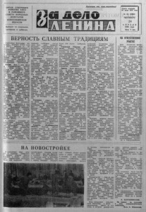 ОРГАН С Е В Е Р НОГ О РАЙКОМА КПСС И РАЙОННОГ О СОВЕТА НАРОДНЫХ ДЕПУТАТОВ НО ВОСИБ И Р СКО Й ОБЛАСТИ В ы х о д и т п о в т о р н и к а м , ч е т в е р г а м и с у б б о т а м . Пролетарии всех стран, соединяйтесь! Газета основана 20 июля 1935 года № 5 0 (5 9 6 2 ) ЧЕТВЕРГ 2 4 А П Р Е Л Я 1986 года Цена 3 коп. ВЕРНОСТЬ СЛАВНЫМ ТРАДИЦИЯМ Стремление безусловно вы полнить решения XXVII съ е з да КПСС. работать но - новому, более организованно и продуктивно, делом доказали трудящиеся страны в день ком;иудиетического субботника, посвященного 116-Я годов щнне со дня рождения В. И. Ленина. Рабочий день 19 апреля помог изы скать новые р е зер вы дальнейшей ин тенсификации производства. Москва. Е сть в депо Моек ва - Сор тировочная локомотив, мощь которого не и з меришь в лошадиных силах. Паровоз ОВ-7024 — совр е менник Октябрьской револю ций еж и л в далекий п а м я т ный день первого субботника, который В. И. Ленин назвал' Великим почином. По традиции гудок этого л о к о мотива возвестил о на чале субботника. В счет коммунистического субботника в де по Москва - Сортировочная проведены сотни гру зовы х и пассажирских поездов, отремонтировано 11 локомотивов. В фонд субботншса п е речислены тысячи рублей!. Машинисты повели э с т аф е т ные поезда на родину В. И. Ленина, в Ульяновск, на ударные стройки пятилетки. Хорошо поработали в этст день швеи объединения « Р а дуга». Выполнены напряжен ные о б яза тельства , выпущено на шесть ты с я ч рублей сверхплановой продукции отличного качества. Недавно «Радуга» перешла на выпуск новых моделей к весечне- летнему сезону. В сложных условиях р е конструкции трудят с я стан костроители объединения « Ь р а с ный пролетарий». Форсируя освоение новых мощностей, ■они стремились 19 ап р ел я достичь . наивысшей производительности труда. Огромный путь от л еген д арных «Днпов» До роботов и станков, оснащенных электроникой, прошел сл авный коллектив. По традиции субботник всегда з д е с ь был днем трудовых рекордов, показывающих в о з р астающие возможности пред приятия. В этот день выпущено продукции больше, чем положено по норме, изготовл ены десятки станков с ЧПУ, роботов. Ленинград . К азахс танская целина примет первый э к з а мен у «Кировца» новой мс дификации, который в дзнь субботника ленинградцы т ор жественно вручили знатной т р ак тористк е страны Н. Гсл лерт . З а именной машиной она п ри ехала из совхоза име ни Амангельды Целиноградской области. Р о с т о в - на - Дону. Важ ным рубежом в борьбе за высоки й урожай ст ал день ударного т руда д л я т р у ж е ников одного из крупнейших на Дону колхозов — имени Ленина Зерн о гр ад ско го района. На последних г ек тар а х пашни сеялочные агр е гаты уложили в почву семена ку куру зы . Все механизиров анные подрядные зв ен ья выпол нилн по полторы — две нор мы. Ульяновск. А лы е г в о з д и ки легли к подножию мону мента вождю Октябрьской революции на волжском берегу — этим це ремониалом з е м л я к и Владимира Ильича Ленина по традиции о т к р ы ли коммунистический суббот ник. Ульяновцы ознаменовали 19 а п р е л я наивысшей пронз водительностью труда. Почти 1 00 легковых автомобилей- вездеходов и 5 0 0 моторов к ним выпустили труженики объединения «Автоуаз» . Тольятти (Куйбышевская область). Никогда прежде стройки области не ар и ним а ли столько добровольных по мощников, как в этот день. По примеру одной из бригад В А З а ускорить возведени