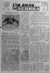 ОРГАН СЕВЕРНОГО РАЙКОМА КПСС И РАЙОННОГО СОВЕТА НАРОДНЫХ ДЕПУТАТОВ НО ВОСИБИ РСКОЙ ОБЛАСТИ Выходит по вторникам, четвергам и субботам. Пролетарии в с е х ст ран , соедин яйте сь! Газета основана 20 июля 1935 года № 54 (5966) СУББОТА 3 М А Я 1986 года Цена 3 коп. 5 МАЯ- ДЕНЬ ПЕЧАТИ В. И. Л ени н з а чтением газеты «Правда» Р и с у н о к х у д о ж н и к а П. Васи льева . Фотохроника ТАСС ВСЕГДА В МАССАХ Едва ли не с дет ства знаком к а ж д о м у снимок — Б л а димир Ильич Л ени н з а рабочим ст о л о м . П е р е д ним — р а с крытый н ом ер «Прав ды » . Как част о м о ж н о встретить на ст ран иц а х ленинских томов такого р о д а записи: «Правда» с о о б щ и л а . . . . , в г а з е т а х «И з в е с т и я » и «П рав да» была на дн я х з а м е т к а . . . М н ож ест во г а з е т той поры хранят ег о харак терыые пометки и подчеркивания.' В ла д и м и р Ильич был в д о х н о в и т ел ем и с о з д а т е л е м партийной печати, пламенным е е п у б лицистом . С б о ев ой ленинской «И скры » в е д е т свою биографии совет ская пр ес са . В ер н а я ленинским тради ци ям , наша печать выступает б о е вым пропагандистом , агитатором и ор гани зат ором масс. В ц ент ре ее внимания — вопросы практической р еализац ии р е шений X XV I I с ъ е з д а КПСС , кор ен ны е вопросы ин т енсифика ции. пер е стр ой к и , эк ономики , р ационального использования тр у д а , у л учш ен ия качества пр одукции, экономии материалы нщх р е с у р с о в . О з а б о т е В. И. Л ен и н а , Комм уни сти ческой партии по ст рои т ел ь ств у печати, ул учш ен и я е е д ея т ель н о с ти с в и д е т ель ств ую т многочи сл ен ные д ок ум ен ты . Важным ор и ен ти ром дл я нас стали пос тан овл ен ие ЦК КПСС «О д альнейш ем улучш ен ии д ея т ель но с ти районных и гор о д ск и х г а з е т » , р е шение X XV I I с ъ е з д а партии. Р а й о н н а я га з е т а — в а ж н о е з в е н о в сов е т ск ой печати , не зам енимы й . источник информа цни о м естн ой ж изни . Основные уси ли я р ед ак ци я к он цент ри ру е т на освещении д ея т ел ь н о с т и тр удовы х коллективов, раскрытии с о д е р ж а н и я ор гани за т орской и и д ей н о - воспитательной работы пе р в и ч ных парторганизаций, с о д е й с т в у е т у к р еп л ен и ю организован ности, порядк а и дисциплины. В за г ол ов к а х стали постоянны слова — инте нсификация, п е ре стр ой ка , АП К . Выше стала тр ебов атель ность читателей к публикациям . Они ж д у т от нас гл у б оки х и и н т ере сны х мат ериал ов, см елы х в постанов ке п р о бл ем , ярких по м ас т ер с т в у . Наша га з е т а « З а д е л о Л ен и н а » в своей ра б о те широко опи рается на бол ьш ую армию активистов, что оказывает п ол ож и т ел ьн о е влияние г а п р ои зв о д ств ен ны е д е л а т р у д о вых коллективов, на всю о бщ е ств ен ную ж и зн ь района. К аж ды й рабочий д е н ь в редак ци и начинается с р а з б о р а почты. И в осн овном эт о письма в г а з е т у , г д е читатель д е л и т ся новост ью, ставит вопр ос , спорит, откликается на вы ст уп л ен и е в" г а з е т е , п р е д л а г а е т т е м у . С р е д и и х авторов мы ча ст о видим Г. Е. А л ен ск о г о , А . М. Чуркина, В . Я. К о с с , А . II. З а й ц е в а , А . В. Колотилина. Н. А . Н алим ову , Н . И Гон чаренко. Часты выст упления в г а з е т е ответственных р а ботников райкома партии, рай и сп ол к ом а , с е к р е т а р е й п е р вичных партийных ор ганизаций , р у к ов о ди т ел ей предприятий и кол х о зов . Ключев ой вопрос д л я нас с е г о д н я —- повысить эф фектив ность и дей с т в е н н о с ть публикаций. Ни одн о выступление, опу оли ко в ан