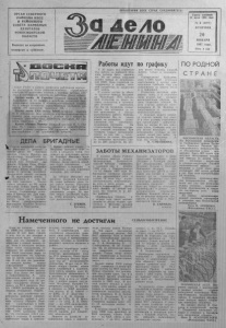 ОРГАН С Е ВЕ Р НОГ О РАЙКОМА КПСС И РАЙОННОГ О СОВЕТА НА Р ОДНЫХ Д Е П УТ АЮ В НОВ ОСИБ ИР С КОЙ ОБЛАСТИ Выходит по вторникам, четвергам и с у б б о т ам. ПРОЛЕТАРИИ ВСЕХ СТРАН, СОЕДИНЯЙТЕСЬ! Газета основана 20 ирля 1935 года № » ( 6077) В Т О Р Н И К 2 0 Я НВ А Р Я 1987 года. Цена 3 коп Л Л А Л Л Л Л Л Л / \ А А Л А Л А А Л А Л Л / ^ \ Л А Л / \ Л Л А Л А Л А Л А А Л Л Л Л Л А Л Л Л А Л Л Л Л Л Л Л Л Л Л Л Л А Л А Л Л Л Совет РАПО и райком профсоюза работников агропро- ма рассмотрели итоги социалистического соревнования колхозов по подготовке техники к полевым работам 1987 года и постановили занести на районную Доску почета: Колхоз имени М. Горького (главный инженер Н. И. Лещинский). К 15 ноября в хозяйстве полностью о т р е монтирована посевная и почвообрабатывающая техника. На 1 я н в аря готовность зерноуборочных комбайнов составила 100 процентов, тр ак т о р о в—94 . Колхоз имени XXII съ е з д а КПСС (главный инвкенёр И. Т. Алейников). Всю посевную и почвообрабатывающую технику здесь подготовили к 1 декабря. На 1 января г о товность зерноуборочных комбайнов составила 62 процента, т р а к т о р о в . — 97 , Колхоз «Память Ленина» (главный инженер Н. А. Гер- лиц). На 1 января готовность посевной и почвообрабатывающей техники составила 100 процентов, зерноуборочных комбайнов -- 80, тр ак т о р о в—91 процент, < 8 $ y \ A / \ A A A A A A A A A A A A A /V V \ A A /V V \ /\ A /V \A / V \A / V \A y \A A A A A /N /\ A A A A A /V V ' y V \A / \/ V ' y V V \ A A /\ A / ДЕЛА БРИГАДНЫЕ Совсем маленькой с т ал а на- а Михеевка — деревня в четыре двора. Но бригадой колхоза «З а в е ты Ильича» мы по-прежнему продолжаем оставаться . Здесь находится дойный гурт. Работают две доярки: Зубкова Нина Митрофановна и Зубкова Людмила Егоровна. Корма вывезены к ферме и качества неплохого. Ежедневный рацион составля- • ыг 20 килограммов силоса, 2 ^ ‘комбикормов, 2 — сена. Надои еще невелики. Растел только начался : из 66 коров отелились только шесть. Массовый растел ждем в феврале — марте. Специального телят - ника в бригаде нет. Дл я новорожденных тел ят наделали к л е т о к здесь же в коровнике. После двадцатидневного выпаивания цельным молоком их увозят в Новотроицк. Кроме дойного стада в Михеевке находится гурт нетелей в пятьдесят голов. Ухаживают за животными скотники Тимофей Иванович К апитонов и Леонид Петрович Гришин. После растела живо!- ные будут отправлены для дальнейшего содержания в Новотроицк, а сюда перегоним молодняк для откорма. Да, сегодня Михеевка еще я в л я е т с я колхозной бригадой. Но скоро работать здесь будет совсем некому. Р а з ъ е з ж а ются люди, исчезает деревня. А жал ь. Так ие здесь выпасы,, сейокооные угодья. Не х в а тает только хозяйского подхода, чтобы возродить здесь бы лую деятельность, • С. З У Б К О В , бригадир. Работы идут К 20 м арта все строитель ные работы на районной больнице должны быть з а к о н ч е ны. На это сейчас нацелены усилия бригад из м ежколхозной ПМК. Пока строители у к ладываются в график, который разработан на предпусковой период. В полном составе на объекте трудится бригада Владимира Чернобаева. Этот небольшой коллектив из шести ч е ловек пользуется в организации большим уважением. Где бы ни трудились специалисты, они оставляют з а собой качественно и быстро выполненную работу. Бригада комплексная. Все ее члены имеют по несколько специальностей: они плиточники, каменщики, плотники. На строительстве бригада о тделывает плиткой помещения. Три человека кл адут м