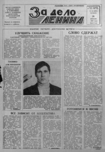 ОРГАН СЕВЕРНОГО РАЙКОМА КПСС И РАЙОННОГО СОВЕТА НАРОДНЫХ ДЕПУТАТОВ . НОВОСИБИРСКОЙ ОБЛАСТИ ДСЛО Г а з е т а о с н о в а н а 2 0 и ю л я 1 9 3 5 г о д а № 1 3 ( 6 0 8 1 ) Ч Е Т В Е Р Г 2 9 ЯНВАРЯ 1987 года. Ц е н а 3 к о п 1 Выходит по вторникам, четвергам и субботам. 1 1 i m s ЮБИЛЕЮ ОКТЯБРЯ - ДО С Т О Й Н УЮ ВСТРЕЧУ У Л У Ч Ш И Т Ь С Н А Б Ж Е Н И Е СОЦИАЛИСТИЧЕСКИЕ ОБЯЗАТЕЛЬСТВА РАБОТНИКОВ СЕВЕРНОГО ХЛЕБОКОМБИНАТА НА 1987 ГОД Перед работниками хлебокомбината стоит зад ач а — претворять в жизнь пос тановление ЦК КПСС и Совета Министров СССР «О дальнейшем развитии и у л у ч шении деятельности потребительской кооперации». Есть и своя программа по улучшению снабжения н а с е ления продуктами питания. Включившись в соревнование по достойной встрече 70 -л е т и я Великого Октября, работники хлебокомбината приняли следующие социалистические обязательства. Т е х н и к а д л я к о л х о з о в Приток техники на село не уменьшается . С каждым годом земледелец получает все более мощные машины, т р а к тора, комбайны. И очень важно использовать эту технику по назначению, чтобы не стояла она без действия на машинных дворах, а д а в а л а полную отдачу. Торговый отдел райсельхозтехники с т р е мится к тому, чтобы все з а я в ки колхозов были полностью удовлетворены. В прошлом году, например, район получил два тр актор а К-700 и два —К -701 . В свое р асп оряжение их приняли механизаторы колхозов имени К. Маркса, имени М. Горького, « Б о р ь ба за мир». З а год торговый отдел р е а лизовал колхозам 22 т р а к т о ра ДТ-75 и пять — леспромхозу. Колесных тракторов продано тринадцать, д е в я т и тонных тележек к тракторам К -700 — десять, двенадцатитонных — шесть. Силосоуборочных комбайнов разных марок было получено семь. Идет поступление техники в наступившем году. В январе в колхозы «Зав еты Ильича» и «Новая жизнь» отправлены трактора МТЗ-80 , пришли семь тяж е лы х дисковых борон. С. СЕМЕНОВА. Обеспечить выполнение плана по производству и р е ализации продукции к 30 д е кабря 1987 года. Произвести сверхплановой продукции на две тысячи рублей. Выпечь и продать 75 тонн кон дитерских изделий, 3 5 0 тонн —булочных. Реализова ть 15 ты сяч декалитров б е з а л к о гольных напитков. Повысить качество колбасы, у в е л и чить выработку кулинарных изделий, добиться экономии муки, продолжать д альнейшее развитие материальной базы, внедрять Црогрессивные формы организации труда. З а счет внедрения новой технологии производства снизить себестоимость выпускаемой продукции на 0 ,2 процента, не допускать перерасхода топлива и электроэнергии. Постоянно совершенствовать воспитательную работу в коллективе, повышать к в а лификацию мастеров, заботиться об условиях труда и быта работников. Обязательства обсуждены и приняты на общем собрании коллектива. L ш ш ш тш Владимир Иванович Макаров — передовой скотник колхоза «Новая жизнь». Недавно его принимали кандидатом в члены партии. Хозяйство это в районе одно из первых стало применять у себя чековую форму контроля. Здесь намерены по-серь- езному решать основную проблему — перевод экономики колхоза на полный хозяйственный расчет. Владимир Иванович считает, что хозяйство может выйти в передовые, если будет внедрен хозрасчет, если контроль за работой будет рублем. Но прежде всего нужно укрепить кормовую базу, улучшив сенокосы и пастбища. Тогда животноводство действительно станет рентабельным