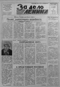 ОРГАН С Е В Е РН О Г О РАЙКОМА КПСС И РАЙО ННО ГО СОВЕТА НА РО ДНЫ Х ДЕПУТАТОВ Н О В О СИ Б И РС КО Й О Б Л А С Т И Выходит-п о вторникам, четвергам и с у б б о т а м . Газета основана 20 июля 1935 года № 15 ( 6 0 8 3 ) ВТОРНИК 3 ФЕ В Р АЛЯ 1987 года . Цена 3 $оп ---------------- Ю б и л ею О к т я б р я —д о с т о й н ую в с т р е ч у ------------ -------- Полнее удовлетворять потребности СОЦИАЛИСТИЧЕСКИЕ ОБЯЗАТЕЛЬСТВА РАБОТНИКОВ СЕВЕРНОЙ ПОТРЕБИТЕЛЬСКОЙ КООПЕРАЦИИ НА 1987 ГОД Стремясь практическими делами ответить иа р е ш е ния XXVII съ е з д а КПСС, на призыв партии сдел ать 1987 год годом ударного^ труда, коллектив районной потребительской кооперации ак тивно включился в соревнование по достойной встрече 7 0 -л е т и я Великого Октября и принял следующие социалистические обязательства. Обеспечить досрочное вы полнение плана розничного товарооборота. Значительно улучшить работу предприятий общественного питания, повысить качество приготовляемой пищи, ув еличить вы работку и продажу н а с е л е нию кулинарных, кондитерских, сдобных булочных и з делий и безалкогольных н а питков. Особое внимание уделить обслуживанию тружеников сельского хозяйства, зан ятых на полевых работах и в животноводстве. На 10 тысяч рублей сверх плана продать с ельхозпродуктов, закупленных у н а с е ления. Обеспечить магазины товарами широкого и устойчивого ассортимента. Применять такие активные ф о р мы торговли, как выставки- продажи и ярмарки, з а счет чего получить дополнительно 3 0 ты сяч рублей. Довести продаж у товаров методом самообслуживания до 80 процентов. Улучшить "приемку товаров от поставщиков, не допускать в торговлю проникновения товаров низкого качества и не пользующихся у населения спросом. Заключить договоры с граждан ами на закупку излишков сельхозпродуктов, дикорастущих плодов, ягод грибов, лекарственного и технического сырья. Годовой план по автоп арку по всем технико-экономическим пок а за тел ям выполнить к 30 д ек абр я . П еревезти дополнительно 36 тонн грузов. Добиться экономии горючесмазочных м атериалов против установленных норм. Перевыполнить план прибыли в торговле, заготовке, промышленности и транспорте. Обеспечить дальнейше е развитие материально-технической базы потребкооперации. Ввести в действие универсам в райцентре , построить крытую площадку дэтя, хранения мотоциклов, в е л о сипедов и другой техники, поступающей для продажи; двухквартирный дом. Добиваться дальнейшего усиления воздействия хозяйственного механизма на повышение эффективности и качества работы. Постоянно совершенствовать идейно - политическую и культурно - воспитательную работу в коллективе. Подготовить индивидуально- практическим обучением 14 -продавцов, поваров и кондитеров. Направ ить в институт, техникум и училище 9 человек. За всеми молодыми специалистами закрепить наставников. Обязательства обсуждены ц приняты на собрании актива работников кооперации и профсоюза. Петр Александрович Кыш- тымов вырос в Больших Куликах. Здесь сейчас центральная усадьба колхоза «Наша Родина». Прочно обосновался парень на земле, где родился. Петр Александрович стал хорошим механизатором, ведь крестьянская работа требует не только знания техники, но и хозяйского отношения к делу. Петра Александровича сейчас, в период зимовки, благодарят животноводы. Летом он на колесном тракторе скирдовал солому, метал сено. Скирд