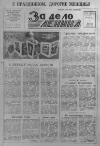 С П РА ЗД Н И К О М , ДОРОГИЕ Ж ЕНЩ ИЫ ! ОРГАН СЕ ВЕ РН О ГО РАЙКОМА КПСС И РАЙОННОГО СОВЕТА Н А РО ДНЫ Х ДЕ П У ТА Т О В Н О В О С И Б И РС К О Й ОБЛАСТИ Выходит по вторникам, четвергам и с у б б о т ам . Пролетарии всех стран, соединяйтесь! а дело Газета основана 20 июля 1935 года № 29 (6091) СУББОТА 7 М А Р Т А 1987 г о д а Цена 3 кон. Плакат художник а С. Рае в а И з д а н л ы т в о „Плакат Б ПЕРВЫХ РЯДАХ БОРЦОВ Международный ж ен с к и й день 8 Марта — один и з с а мых све тлых всенародных Праздников, ко торый ' П Р И Х О Д И Т к н ам вместе с весной, с обновлением ж и в о творных сил при роды. В нын еш нем году он отм ечается в у сл ови ях в с е н арод ной подготовки к з н а м е н а тельной д ате в ж и з н и советского на р о д а—70-летию Великого Октября. Прошел год после —работы XXVII съ езд а КПСС. В его р еш е н и я х были определены г л а вны е руб ежи политического, социально - э к о н о м и ч е с кого и духовного р а з в и т и я советского ’общества, н а м е чена обширная программа у скор ен ия нашего мирного строительства И сей час мы с в ам и я в л я е м с я ж и в ы м и свидетелями того, к а к по всем н а п р а в л е н и я м -идет, поистине революционная волна преобра зований, н а п р а в л е н н а я на то, чтобы обеспечить дальнейши й р а сцвет Социалистической Родины, ул учш ен ие жизн и т руд ящ и х с я . И н а ск о л ьк о эти р еш е н и я ( эли п р еобра зовани я станут реальнос тью зави сит от н а пряженного труда всего н а - подл, каждого ч ел о в ек а и в немалой с т е п е н и ог пас, дорогие ж енщ и ны , от в аш ей иниц иативы , эне- pi ии, творческих усилий. В свое вр ем я А. М. Горький сказал: «Надо хорошо понять и помнить, что без ж ен щ и н ы невозможно осущ ествление социализма» . Возьмем любую и з отраслей народного Хозяйства и станет ясно, что ж ен щ и н ы предс та влены в ней достойно. К ол л ек тивы животноводов у нас в районе большей частью жен ские , а вносят они зна чи те ль ны й в к л а д в ра зви ти е экономики х о з я йств. Мы часто среди, п е р е довиков, н а зы в а ем имен а Г. Д. Йимаевой—т ел ят н и цы к о л хо за «ВосхЪд», Е. Ф. Сло- бодчиковой — доярки к о л хо за имени К алинина , Н. А. К алим ов ой—д о яр к и колхоза «Путь к коммунизму». Много т руд а в дело восп и т ан и я и обучения подрастающего п околен ия вносят ж е н щ и н ы - у ч и т е л я . В про шедшем году з а у сп ехи в труде Г. В. Мокроусова, у ч и т ел ь н и ц а малокомплектной! ш колы в д. Веселой, н а г р а ж д е н а орденом Трудовой Сл авы II I степени. 3. П. Сазонова, уч и т ел ь Северной средней школы, н а г р а ж д е н а медалью «За трудовую доблесть». Слова благод арности в этот день мы а д р е суем В. И. ' Ларионовой— библиотекарю детской библиотеки, Г. А. Заруби н ой— воспитателю детского сада Mel, Л. А. Ю хлиной—бух галтеру ДРСУча, Л. С. Зубко —мастеру цельномолочной продукции . маслозавода, И,. С. |Бобровой—рабочей хлебоприемного п у н к т а , В. И. Петуховой—з а м е с т и телю заведующего ап текой, О. С. Уховой—сотруднику р ед ак ц и и и сотням другим, неутомимым ' т р у ж е н и ц а м . i , Ж е н щ и н а—великое слово. •В ней чистота девушки, самоотверженность подруги, подвиг матери. С особой теплотой мы обращ а ем с я сегодня к ж е н щ и на м-матерям(. З а в т р а ш н и й день нашей Родины стан ет таким , к а к и м и - в ы р а с ту т дети. Воспитывайте своих сыновей и дочерей с о з н а тельными, честными , трудолюбивыми г р а ж д а н а м и соци алистической Отчизны. Сердечное спасибо вам за неутомимый, благородный материн