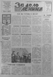 ОРГАН СЕВЕРНОГО РАЙКОМА КПСС И РАЙОННОГО СОВЕТА НАРОДНЫХ ДЕПУТАТОВ НОВОСИБИРСКОЙ ОБЛАСТИ Выходит по вторникам, четвергам и субботам. ПРОЛЕТАРИИ ВСЕХ СТРАН, СОЕДИНЯЙТЕСЬ! Газета основана 2 0 июля 193 5 года № 3 3 ( 6 1 0 1 ) В Т О Р Н И К 17 М А Р Т А 1987 года. Цена 3 коп. — К А К ВЫ Г О Т О В Ы К В Е С О ИИ Е П Р И В Е С Ы ПЕРЕХОДЯЩИЙ ВЫ М ПЕЛ ГАЗЕТЫ « З А ДЕЛО ЛЕНИНА » ЗА ДОСТИЖЕНИЕ ВЫСОКОГО ПРИ РО СТА МОЛОДНЯКА ПРИСУЖДЕН БОРТ , 'ЕВИЧ ЕЛЕНЕ ВАС И Л Ь ЕВНЕ, ТЕЛЯТНИЦЕ КОЛХ О З А ИМЕНИ М. Г О Р Ь КОГО, ОБЕСПЕЧИВШЕЙ В ФЕВРАЛЕ СРЕДНЕСУТОЧНЫЙ ПРИРОСТ КАЖДОЙ ГОЛОВЫ МОЛОДНЯКА ПО 9 1 0 ГРАММОВ . Н А М Е Т И Л И Р У Б Е Ж На 1987 год у животново- ^ д о - в района большие и напряженные планы. Они наметили себе рубеж — получить от коровы по 2 2 3 7 килограммов молока. Это средняя цифра плана. Но некоторые хозяйс тва имеют реальные во зм ож ности подняться на б олее высок ую ступень. Например, животноводы колхоза «Наша Р о дина» планируют надоить от коровы в нынешнем году по 2901 килограмму молока. Это самый высокий показатель. С начала года процент выполнения составил 9 ,6 . В колхозе «П уть к коммунизму» от коровы должны получить по 2 4 4 3 килограмма молока. За два месяца намеченное выполнено на 9,1 процента. Самый высокий надой от коровы, с начала года в к олх о зе « В о с х о д » — 2 8 2 килограмма. К годов ому заданию это составляет 12,3 процента. Волее дв ух со т килограммов молока получили от коровы дбярки шести колхозов района. А вот на фермах к олх о за «З а в еты Ильича» средний надой от коровы с начала г о да не достигает и девяноста килограммов. До выхода техники в поле и начала весенних работ на них остается немного времени, каких-то полтора месяца. Провести посевную кампанию в оптимальные сроки, с вы с о ким качеством — вот главная задача механизаторов, специалистов колхозов, бригадиров, звеньевых, всех, кто будет занят на весеннем севе яро вых культур. Многое, если не все, будет зависеть от г о т о в ности техники к страде. ИменВольшие планы предстоит выполнить в текущем году отряду строителей района. Они строят объекты производственного, социально.куль- чуриого назначения, жилье. Вез их вклада невозможно развитие района. В январе- феврале они освоили капиПроизводствениое управление бытового обслуживания населения план по объему реализации бытовых услу г населению выполнило за два прошедших месяца- на 1 0 3 ,4 процента. Старт успешный, и э то обязывает коллектив о р ганизации закрепить достигнутое, чтобы в будущем успех отдельных передовиков предприятия стал результатом работы всех участков. Лидером социалистического соревнования является бригада л е сор у бов, в которой трудятся б р а тья Кайгородовы, Михаил и Василий. Но три десятка лет но поэтому комитет народного контроля с 20 марта по 10 ап реля 1987 года проводит масс о вую проверку готовности колхозов района к весенне- полевым работам. Организация проверок- возлагается на председателей групп народного контроля. В ходе проверки надо уделить внимание на готовность трак торов, прицепного инвентаря, загрузчиков семян. Следует обратить внимание на о б е сп е ченность семенами и их качетальных вложений 192 тыся чи рублей, из них на строи тельстве Коб-Кордопск >й школы — 154. Строительно-монтажных работ выполнено на 146 тысяч рублей. " На многих объектах трудится коллектив Северной МПМК. Строители этой орга- — таков их рабочий стаж на' предприятинй. Михаи