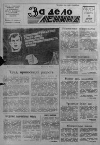 Пролетарки всех стран, соединяйтесь! д е л о Г а з е т а осн ован а 2 0 ию л я 1 9 3 5 года № 47 (6 1 1 5) С У Б Б О Т А 18 АПРЕЛЯ 1 9 8 7 г о д а Ц ен а 3 нов . ОРГАН СЕВЕР НОГО РАЙКОМА КПСС И РАЙОННОГО СОВЕТА НАРОДНЫХ ДЕПУТАТОВ НОВОСИБ ИР СКОЙ ОБЛАСТИ Выходит по вторникам, четвергам и субботам И зд а т е ль с т в о «П лак ат» , П л а к а т х у д о ж н и к а И. Коминарца, Труд, приносящий радость G8 лет о тд ел яю т нас от дней, когда коммунисты и сочувствующие подрайона Московско - К а з а н ской дороги посчитали, что «коммунисты нс д о лж ны щ а д и т ь свое здоро.вье и жизнь д л я з а в о е ваний революции — р а б о т у п р о и з в о д и т ь бесплатно» , когда з а с у б б о т у 10 мая 1919 года было «в общем выпущено 4 п аровоза» , 16 вагонов ^гружено и н аг р у ж е н о 9300 пудов». П а р о д н а з в а л патриотический почин ж е л е з н о д о р ож н и к о в коммунистическими с убботниками . О их значении В. И. Ленин писал в с т а т ь е «В ели кий почин»: «Коммунистические субботники» имен" но потому имеют громадное историческое з н а ч е ние, что п о казы в аю т нам созн ате льны й и д о б р о вольный почин рабочих в р азви тии п р о и зв о д и тельности т р у д а , в пер еходе к новой трудоврй дисциплине, в тв орче ств е социалистических условий х о зяй ств а и жизни». Лен инские коммунистические субботники стали сл авной традицией с о в е т с к о г о н а р о д а . В них принимают у ч а с т и е миллионы рабочих, колхозников, - выходит на с убботник инте ллигенция, р а б о т а ю т рядом со взрослыми студенты, школьники. Р а с т е т а в т о р и т е т ленинских с у б б о т ников. Так , если в 1969 году в субботнике приняло у частие 115 миллионов человек, которые произв ели продукции на 600 миллионов рублей, и было перечислено в фонд пяти летки более 125 миллионов рублей, то в минувшем, 1986 году, в «кра сной субботе» приняло участи е у ж е 159 миллионов человек, продукции произведен о на 1375 миллионов рублей, а перечислено 200 миллионов рублей. П л о д о тво р н о т р у д я т с я в дни Л енинс ких с у б б о т ников и рабочие , колхозники нашего рай она. Около шести тысяч чел овек вышли на праздник т р у д а □ 1986 году. Многие из участн и ков с у б б о т ника пришли на свои рабочие места, за нимались привычным делом . Но всюду отмечалось: люди р аб о тал и с огоньком. вдохновенно, с более высокой п роизвод ит ельн остью т р у д а . Так , рабочими кирпичногр з а в о д а было выпущено 15 тысяч ш ту к кирпича, что зн ачительно больше дневной нормы. Х лебоком бинат в ы д а л 10 тонн хлеба, это превысило сменную выпечку. Более ' тысячи ку б ом е тр о в деловой древесины и 220 кубометров п и л ом а т е р и а л о в было получено в' этот день. Б е з ма ло го 11 тысяч рублей было отчислено в фонд д в е н а д ц а т о й пятилетки . Эти цифры и ф а к ты красноречиво говорят о сознате льности н а р о д а , о его стремлении принести Родине к а к м ож но больше пользы своим тр удом. С егодня тр у д ящ и е с я Северного, сел и дерев ень р ай о н а вышли на стр о ящ ую ся б о ль н и цу, на тр а с с у ведущую в Куйбышев , встали у станк о в и о б о р у д о в ан и я п р е д пр и я ти й , они споим бескорыстным трудом отмечают 117-ю годовщину со дня р о ж д ен и я великого в о ж д я п р о л е т а р и а т а В л ад им и р а Ильича Л ен и на , к о т о рый учил пас: «Коммунизм начин ае тся там , где п р о я в л я е т с я с а м о о т в е р ж е н н а я , п р ео д о ле в ающ ая т яж е л ы й т р у д , з а б о т а р я д о в ы х раб очих об увеличении производительности труда. .. ». ПРЕДСТОИТ НАПРЯ