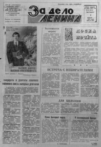 ОРГАН С ЕВ ЕР НОГО РАПКОМА КПСС И РАЙОННОГО СОВЕТА НАРОДНЫХ ДЕПУТАТОВ НО ВО СИ БИ РСКО Й ОБЛАСТИ Выход h i по вторникам, четвергам и субботам Пролетарии всех стран, соединяйтесь! ! Газета основана 20 июля 1935 года № 66 (6134) ЧЕТВЕРГ ИЮНЯ 1987 год а Цена 3 коп. Щ Ь №№. 1$ Плакат художника Г. Шуршина. Издательство «Плакат» КАНДИДАТЫ В ДЕПУТАТЫ СЕВЕРНОГО РАЙОННОГО СОВЕТА НАРОДНЫХ ДЕПУТАТОВ В соответствии со статьей 38 Закона Российской Советской Федеративной Социалистической Республики «О вы. борах в местные Советы народных депутатов РСФСР» окружными избирательными комиссиями зарегистрированы следующие кандидаты в депутаты Северного районного Совета народных депутатов: ЛЯМКИНА Елена А л ек сан д ровна, 1960 года р о ж д е н и я , к а н д и д а т в ч л е н ы КП СС , з а - в е д у ю щ а я Северной р а й о н н о й а п т е к о й — по и з б и р а т е л ь н о м у о к р у г у № 1; ВАСИЛЬЕВА Наталья Ивановна, 1956 года р о ж д е н и я , -б е с п а р т и й н а я , б у х г а л т е р С е ве р н о г о м е ж х о з я й с т в е н н о г о л е с х о з а — по и з б и р а т е л ь н о м у о к р у г у № 2; ЯКИМОВА Валентина Аверьяновна, 1945 года р о ж д е н и я , б е с п а р т и й н а я , н а ч а л ь н и к ПТО МПМК « С е в е р н а я » — по и з б и р а т е л ь н о м у о к р у г у № 3; КОСС Валентина Яковлевна, 1949 года р о ж д е н и я , ч л е н КПСС, з а м е с т и т е л ь п р е д с е д а т е л я р а й и с п о л к о м а , п р е д с е д а т е л ь п л а н о в о й к о м и с с и и р а й и с п о л к о м а — по и з б и р а т е л ь н о м у о к р у г у № 4; ГРАКОВА Анна В а с и л ь е в н а 1959 года р о ж д е н и я , ч л е н КПСС, п е р в ы й с е к р е т а р ь С е в е р н о г о р а й к ’ом а ВЛКСМ — по и з б и р а т е л ь н о м у о к р у г у № 5; ЛИТВЯКОВ Николай Михайлович, 1948 года р о ж д е н и я , ч л е н КПСС , п р е д с е д а т е л ь С е в ер н о г о с е л ь с к о г о С о в е т а _ по и з б и р а т е л ь н о м у о к р у г у № 6; ФЕДОРОВА Галина Д е н и совна, 1941 г од а р о ж д е н и я , ч л е н КПСС , з а в е д у ю щ а я С е в е р н ы м р а й о н н ы м о тд е л о м народно го обра зования — по и з б и р а т е л ь н о м у о к р у г у № 7; СИМБИРЦЕВ Владимир А л е к с а н д р о в и ч , 1948 года рождения, член КПСС, п р о к у р о р С ев ерного р а й о н а — по и з о и р а т е л ь н о м у о к р у г у № 8; ЗАРУБИНА Н ад еж да Т е р е н т ь е в н а , 1937 г од а р о ж д е н и я , ч л е н КПСС, у п р а в л я ю щая Северным отделением Госб а н к а — по и з б и р а т е л ь н о м у о к р у г у № 9; СОЛОВЬЕВ Геннадий С е р ге евич, 1948 года р о ж д е н и я , ч л е н КПСС, и н ж е н е р р айонно го у з л а с в я з и — по и з б и р а т е л ь н о м у о к р у г у № 10; МАКАРОВА Наталья А н дреевна, 1957 года р о ж д е н и я , ч л е н КПСС , з а в е д у ю щ а я о р г и н с т р у к т о р с к и м о тд ел ом р а й и с п о л к о м а — по и з б и р а т е л ь н о м у о к р у г у № 11; КОСТИНА Галина Дмитриевна, 1951 года р о ж д е н и я , б е с п а р т и й н а я , с т а рш и й в о с п и т а т е л ь детского с а д а № 1 — по и з б и р а т е л ь н о м у о к р у г у № 12; МАРЧЕНКО Эльза Ивановна, 1953 года р о ж д е н и я , б е с п а р т и й н а я , с т а р ш и й э к о н о м и с т «СеверноеагропроьД гранса» — по и з б и р а т е л ь н о м у о к р у г у № 13; ВИНОГРАДОВА Нина В л а димировна, 1947 года р о ж д е н и я , ч л е н КПСС, с е к р е т а р ь и с п о л к о м а — по и з б и р а т е л ь н ом у о к р у г у № 14; ;ЭРВОЛЬДЕР Алексей В л а д и м и р о в и ч , 1951 года р о ж д е ния, беспартийный, тракторист (Оконч. на стр. 2) Баллотируется впервые С в о и м и п р е д с т а в и т е л я м и в о р г а н ы н а р о д н о й в л а с т и в к о л л е к т и в а х н а з ы в а ю т людей ' э н е р г и ч н ы х , х о р о ш и х п 