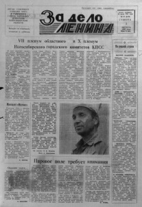 О Р Г А Н С Е В Е Р Н О Г О Р А Й К О М А К П С С И Р А Й О Н Н О Г О С О В Е Т А Н А Р О Д Н Ы Х Д Е П У Т А Т О В Н О В О С И Б И Р С К О Й О Б Л А С Т И Пролетарии всех стран, соединяйтесь! Выходит по вторникам, четвергам и субботам. л е л о ян яяяяк аввя - т ? Г а з е т а о с н о в а н а 20 и ю л я 1935 г о д а №> 91 (6159) С У Б Б О Т А 1 А В Г У С Т А 1987 года Цена 3 к о п . V I I пленум областного и X племум Норосибирского городского комитетов К П С С о По родной стране 28 и ю л я с о с т о я л с я с о в м е с т н ы й п л е н у м о б л а с т н о г о и Н о - в о с и б и р к о г о г о р о д с к о г о к о м и т е т о в К П С С . Н а р а с с м о т р е н и е п л е н у м а в ы н е с е н в о п р о с « О з а д а ч а х о б л а с т н о й и Н о в о с и б и р с к о й г о р о д с к о й п а р т и й н ы х о р г а н и з а ц и й п о к о р е н н о й п е р е с т р о й к е у п р а в л е н и я э к о н о м и к о й , в ы т е к а ю щ и х и з р е ш е н и й и ю н ь с к о г о (1 9 8 7 г . ) П л е н у м а Ц К К П С С » . С д о к л а д о м на п л е н у м е в ы с т у п и л п е р в ы й с е к р е т а р ь Н о в о с и б и р с к о г о о б к о м а К П С С А . П. Ф и л а т о в . У ч а с т н и к а м п л е н у м а б ы л а п р е д о с т а в л е н а ( в о з м о ж н о с т ь о з н а к о м и т ь с я с о б з о р о м п и с е м т р у д я щ и х с я , п о с т у п и в ш и х в о б к о м п а р т и и в 19 87 г о д у . В п о с т а н о в л е н и и , п р и н я т о м на п л е н у м е п о о б с у ж д е н н о м у в о п р о с у , ц е л и к о м и п о л н о с т ь ю о д о б р е н ы р е ш е н и я и ю н ь с к о г о ( 1 9 8 7 г . ) П л е н у м а Ц К К П С С . П л е н у м о б я з а л п а р т и й н ы е о р г а н и з а ц и и , С о в е т ы н а р о д н ы х д е п у т а т о в , п р о ф с о ю з н ы е , к о м с о м о л ь с к и е , х о з я й с т в е н н ы е о р г а н ы , в с е р у к о в о - м у п р о и з в о д с т в у м о л о к а . П. ПЕТРОВ. О к а з ан о у с л у г Р а й о н н о е п р о и з в о д с т в е н н о е у п р а в л е н и е б ы т о в о г о о б с л у ж и в а н и я н а с е л е н и я П р е д л а г а е т ж и т е л я м р а й о н а р я д у с л у г , к о т о р ы е с п о с о б с т в у ю т б о л е е п о л н о м у у д о в л е т в о р е н и ю п о т р е б н о с т е й л ю д е й . В п е р в о м п о л у г о д и и к о л л е к т и в Р П У с п р а в и л с я с п л а н о м р е а л и з а ц и и б ы т о в ы х у с л у г н а 109,7 п р о ц е н т а . П о с р а в н е н и ю с п р о ш л ы м г о д о м э т о т п о к а з а т е л ь у в е л и ч и л с я на 13 ,9 п р о ц е н т а . Р П У и з ы с к и в а е т н о в ы е ф о р м ы о б с л у ж и в а н и я . Н а о д н о г о ж и т е л я в п е р в о м п о л у г о д и и о к а з а н о в с р е д н е м у с л у г на ? р у б л е й 3 8 к о п е е к . 3 . И В А Н О В А . д я щ и е к а д р ы о б л а с т и б е з о т л а г а т е л ь н о п р и с т у п и т ь к в ы п о л н е н и ю в ы д в и н у т ы х П л е н у м о м Ц К К П С С п р а к т и ч е с к и х з а д а ч , п о д к р е п и т ь и х ц е л е н а п р а в л е н н о й о р г а н и з а т о р с к о й , п о л и т и ч е с к о й , и д е й н о - в о с п и т а т е л ь н о й р а б о т о й в к а ж д о м т р у д о в о м к о л л е к т и в е , н а в с е х у р о в н я х у п р а в л е н и я ; о б е с п е ч и т ь п о д г о т о в к у к о л л е к т и в о в п р е д п р и я т и й и о р г а н и з а ц и й к п е р е х о д у на н о в ы е у с л о в и я х о з я й с т в о в а н и я , о п е р а т и в н о у с т р а н я т ь н е д о с т а т к и , н а с т о й ч и в о в н е д р я т ь п е р е д о в о й о п ы т . П л е н у м с ч и т а е т г л а в н о й з а д а ч е й р а б о т ы в н о в ы х у с л о в и ях п о в с е м е с т н о е в н е д р е н и е п р и н ц и п о в х о з я й с т в е н н о г о р а с ч е т а , p a м o ф и н a н c и p o lв a н и t ^ и с а м о о к у п а е м о с т и , у с к о р е н и я п р о ц е с с а о б н о в л е н и я п р о д у к ц и и , п о в ы ш е н и е о т д а ч и п р о и з в о д с т в е н н ы х ф о н д о в , с о б л ю д е н и е с т р о ж а й ш е г о р е ж и м а э к о н о м и и в с е