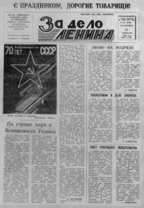 С П РА ЗД Н И К О М , ДОРОГИЕ ТОВАРИЩ И! ОР ГАН СЕ В Е Р НОГ О Р АЙКОМА КПСС И Р АЙОННОГ О СОВЕТА НА Р ОД НЫХ ДЕ ПУТ АТ ОВ НОВ ОС ИБ ИР С К ОЙ О Б Л А С Т И В ы х о д и т но в т о р н и к а м , ч е т в е р г а м и с у б б о т а м . Пролетарии всех стран, соединяйтесь! а дело Газета основана 20 июля 1935 года № 22 (6246) ВТОРНИК 23 Ф Е В Р А Л Я 1988 года Цена 3 коп. Плакат художника А. Кондурова. Издательство «Плакат». На страже мира и безопасности Родины 70 лет Советские Вооруженные Силы с честью и- достоинством несут свои, овеянные славой побед, боевые знамена,* '( Р ож д ени е и становление новой армии и флота, вся их героическая, боевая история не р а зры вн о с вязан а с д еятельностью В. И. Ленина. Коммунистической партии, Советского государства. 70-лбтняя история Страны Советов полностью подтвердила правоту и жизненность ленинских «указаний. Как 1и предвидел Владимир Ильич, на долю первого в мире социалистического государства выпали суровые испытания. В огне жесточайших сраж ений К р асн ая Армия и Флот наголову разгромили многоч исленные банды белогвардейцев и интервентов. Социализм выи грал решающую схватку в битве с империализмом , н а нес ем у крупнейшее военное и политическое поражение. Война против Советского Союза, р а з в я з ан н а я германским фашизмом 2 2 июня 1941 года, была подготовлена всей международной империалистической реакцией. В докладе «Октябрь и перестройка: революция прод о л ж а е т с я » М. С. Горбачев подчеркнул: « Н а в я з а н н а я нам агр е с си я была беспощадным э к з ам ен о м на жизненность социалистического ' строя , i н а крепость многонационального Советского государства, на си лу патриотического духа советских людей и этот э к зам ен огнем и мечом был нами выдержан». Пройдя через тяж е лы е испытания, ц е ной неимоверных т яжелы х н героических усилий, многочис л е н н ы х ж е р т в и потерь. Советский Союз одержал великую Победу. Историческая победа над германским фашизмом и японским милитаризмом — это общее завоевание всех, кто с р а ж а л с я п р о т и в ' агрессоров. Но основную тяжесть борьбы вынесли советский народ и его Вооруженные Силы. Победа Советского Союза в Великой Отечественной войне глубоко закономерна. Это победа самого передового социалистического общественного строя, доказавш его свое неоспоримое превосходство 4 в экономической и социально- политической сфере, в идео логии и морали, непосредственно в военной области. Наша победа была обусл овл ена прочным союзом р а бочего класса , колхозного к р е стьян ства и народной интеллигенции, дружбой советских народов. Сегодня мы с благодарностью н а зы в а ем участников боевых действий на полях сраж ений Великой Отечественной войны наших з е м л я ков супругов Макаревских, Тарабаровых , Жигуновых, Кангородовых, Г. К. Сазонову, М. Д. Коверенко. В. А. Коваленко, П. И. Быковскую, Е. Е. Б у лд аков у , Е. Г. Фролову, П. И. Коваленко, И. Е. Дергачева, И. С. Молокоза, П. А. Доленчука , Л. А. Гл у щенко,. Г, С. Авдонина, И. Г. Егорова, Г. В. Ивонина, М. Д. Квакушонка , В. С. Са- вкина, Н. С. Сивакова, В. А. Свистунова, А. И. Шушакова, Н. М. Юдина, Г. С. Окунева и многих других, кто в грозные годы был на переднем к р а е , и тех, кто не щ ад я сил и здоровья, т рудился в тылу, руковод ствуясь .призывом: «Все д л я фронта вре д л я п о б е ды!». Они и з мирное время внесли и вн осят достойный вкл ад в д ело коммунистического ст роительства, военно- патриотич