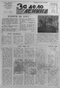 ОР ГАН С Е В Е Р НО Г О РАЙК ОМА КПСС И Р АЙОННОГ О СОВЕТА НА Р О ДНЫХ Д ЕПУ ТА ТОВ НО В ОС И БИ Р С КО Й ОБЛАСТИ ■ ■ I Выходит по вторникам, четвергам и с у б б о т а м . I I. Пролетарии всех стран, соединяйтесь! дело ■в&ш яяаашш ш кш екж ш амш т Газета о сно в ан а 20 мюля .1935 го д а № 23 $6247) С Р Е Д А 24 Ф Е В Р А Л Я 1988 года Цена 3 коп. ПЛЕНУМ 1-7 18 февраля 1988 г о д а состоялся о чере дной Пленум Це нтральног о Комитета К niCC. Пленум ра с с мо т ре л вопрос «О х о д е перестройки сре дней и высшей школы и з а д а ч а х партии по е е о с уще с т влению». С д о к л а д о м по э т о му вопросу выступил член Политбюро, с екре тарь ЦК КПСС Е. К. Лигачев. 18 февраля с большой речью на Пл е нуме выступил Генеральный с ек р е т а р е ЦК КПСС М. С. Горбачев. Пленум принял по о б с у ж д а в ш е м у о ! вопросу р а з в е р н у т о е постановление , к о торое б у д е т опу б лико ва но в печати. Пленум принял по выступлению т. ГоЦК КПСС рбачева М. С. п о ^ а н о в л е н и е , которое бу д е т о пу б лико в а но в печати. На Пленуме рас смотрены о р г а н и з а ц и онные вопросы. Пленум из б р а л т. Маслюкова Ю. Д . ка ндидатом в члены По л ит бюр о ЦК КПСС. Пленум из брал с екре таря ЦК КПСС т. Раз умовского' Г. П. к а н ди д а т ом в члены Политбюро ЦК КПСС. Пленум и з б ра л с ек р е т а р е м ЦК КПСС т. Ба кла но ва О. Д . Пленум о с во б о д и л т. Ельцина Б. Н. от о б я з а нн о с т е й к а н д и д а т а в члены Политбюро ЦК КПСС. ( ТАСС ) х о з я й с т в а у в е л и ч а т с д а ч у скота на мясо. Да и в р е мени на это достаточно. Сверхплановую продаж у ведут кол хо зы имени К али нина, имени М, Горького и «Путь к коммунизму». Б оле е чем наполовину сп р авились с зад ан ием колхозы «П ам ят ь Ленина», « З а в е ты Ильича», « Б ор ьб а за мир» и имени К. Маркса. Есть надежда в том, что район успешно справится с. квар т ал ь ны м планом по з а готовке мяса. ЕСТЬ Колхозы района в первом к в а р т а л е должны продать государству 3 3 0 0 центнеров мяса. Уже сейчас его закуплено почти 1 900 центнеров, то есть план выполнен более чем на половину. В прошлом году на эту же дату мяса сдано всего лишь 6 8 0 центнеров. Б ольш е всего этой жи вотноводческой продукции I НАДЕЖДА j п о к и л л и о а и м е - ни М. Горького — 4 0 4 центнера . Чуть меньше сдал колхоз «Путь к .коммунизму». Пока мало прод али ' мяса к о л х о зы «Наша Родина» — 25 центнеров, «Новая жизн ь» — 16 центнеров, «VII с ъ е з д Советов» — 34 центнера. Нет сомнений, что эти Алексей Владимирович Э рвольдер (на снимке) в системе сельхозтехники работает более ч е ты р ех лет . С выдел ением торгового отдела в самостоятельную ор ганизацию, «Агропром- снаб», Алексей Владимирович р або тает здесь трактористом. Р а б о т а сложная. Н а т р ак тор е Т -1 5 0 ему приходится т р а н спортировать с железнодорожной станции г. Б ар аб и н ск а крупногабаритную сельскохозяйственную технику в район. Помимо основной работы А. В. Эрвольдер совмещает о б я занности заведующего хозяйством и ку р и р у е т в е д ущ е е с я строительство. Объекты н уж н ы е предприятию. Это — жилье , склад материальных ценностей, административный корпус. На вопрос: «Что он з а ч еловек?» , ответили коротко, но ем|ко: ч<Добросовестный, пр едельн о внимател ьный. Если получил задание, то п ров ер ять его выполнение не н у ж но». 1 Фото К. Антонова. ВНИМАНИЕ: ЗИМОВКА СКОТА Животноводы кол хо за имени Максима Горького обязались в зимний период надоить от фуражной коровы по 120 0 килограммов молока, добиться среднесуто