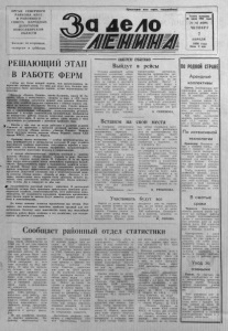 ОРГАН СЕ ВЕРНОГО РАЙКОМА КПСС И РАЙОННОГО СОВЕТА НАРОДНЫХ ДЕПУТАТОВ НОВОСИБИР СКОЙ ОБЛАСТИ Выходит по вторникам, четвергам и субботам. Пролетарии всех стран, соединяйтесь! Газета основана 20 июля 193$ года № 42 {6266) Ч Е Т В Е Р Г 7 А ПР ЕЛ Я 1988 года Цена 3 коп. РЕШАЮЩИЙ ЭТАП В РАБОТЕ ФЕРМ Сейчас нет более важной задачи, чем организованное завершение зимовки скота. Ус.гчвия для этого есть Больше прошлогоднего было заготовлено кормов, лучше подготовлены помещения. Колхозы «Память Ленина», имени Калинина, имени М Горького, «Путь к коммунизму», «Борьба за мир» и «VII съезд Советов» успешно завершили первый этап зимовки. Животноводы этих хозяйств досрочно справились с планом первого ква ртала по продаже государству молока и мяса. Умелое использование внутренних резервов, рациональная подготовка кормов к скармливанию, соблюдение технологических режимов, внимание к нуждам животноводов положительно сказываются на показателях работы отрасли, позволяют заметно увеличить закупки продукции. В целом по району сдача молока и мяса увеличилась по сравнению с зимовкой прошлого года. I Вместе с тем, еще не везде работают с должной отдачей. Снизили по сравнению с прошлой зимовкой закупки мяса и молока колхозы «Новая жизнь», «Заветы Ильича». Меньше стали получать молока колхозы «Наша Родина», имени XXII съезда КПСС!, имени К. Маркса. Причины такого положения — слабая организаторская работа руководителей и специалистов колхозов. В ряде хозяйств нарушаются графики кормления, допускаются перебои в водоснабжении, случаются поломки механизмов, неудовлетворительно налажена подготовка фуража к скармливанию. С низкой обеспеченностью кормами вступили в зимовку колхозы «Восход», «Новая жизнь», «Борьба за мир». Закупает силос со стороны колхоз имени М. Горького. В то же время свои корма используются плохо, имеющиеся кормоцеха бездействуют. Продуктивность коров в большинстве хозяйств остается низкой. Между тем, самое простое смешивание различных кормов повышает эффективность их использования до десяти процентов. Допустили упущения еще в подготовительный период колхозы «Новая жизнь», «Борьба за мир», «Восход», в которых значительная часть кормов была заложена низкого качества, сено заготовлено вообще неклассное. Плохо используется солома. Да и скирдуют ее абы как. + Заканчивается массовый растел животных. К расплодной кампании должно быть приковано пристальное внимание руководителей хозяйств, зооветспециалистов, всех работников животноводства. От сохранности молодняка, правильно организованного раздоя коров во многом будут зависеть годовые итоги работы в животноводстве. До конца зимовки остается практически два месяца. Этот период, как показывает практика, наиболее трудный для животноводов. Поэтому надо повсеместно взять под неослабный контроль работу ферм, особенно в тех хозяйствах, где складываются трудности с' кормами. — НАВСТРЕЧУ СУББОТНИКУ - - - - В ы й д у т в р е й с ы Условия нынешней -весны позволяют коллективу «Апро- промтранса» регулярно выводить технику н а линию. Дорога до города в проезжем ■состоянии, и это водители в полной мере используют для того, чтобы создавать запас строительных материалов, р а зл и ч ны х товаров народного потребления на период дождей. В р ей сы ежедневно выходит до 4 0 автомашин. И в д ень коммунистического субботни