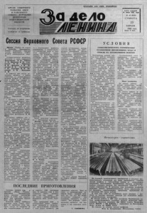 ОРГАН С Е ВЕ РН О Г О РАЙКОМА КПСС И РАЙО ННО ГО СОВЕТА НА РО ДНЫ Х Д ЕПУ ТА ТОВ Н О В О СИ Б И РС КО Й ОБЛАСТИ В ы х о д и т по вторникам, четвергам и суббо там . Пролетарии всех стран, соединяйтесь! Газета основана 20 июля 1935 года № 49 (6273) СУББОТА 23 А П Р Е Л Я 1988 г о д а Цена 3 коп. Сессия Верховного Совета РСФСР Москва. (ТАСС). 19 ап р ел я в Б о л ьш е м К рем левском дворце о т кры л а с ь седьмая сессия Верховного Совета РСФСР одиннадцатого созыва. Аплодисментами в с тр етили д епу таты и гости товарищей Воротникова В. И . , Зайкова Л. Н., Никонова В. П . , Слю- нькова Н. Н. , Чебрикова В. М. , Яковлева А . Н. , Д е - мичева П. Н. , Разумовского Г. П . , Талызина Н. В . , Б и рюкову А. П. , Лукьянова А. И. В повестку дня сессии в к лю чены вопросы о работе советских и хо зя йс тв ен ны х органов РСФСР по обеспечению к 2000 году к аж дой семьи отдельной к варти рой или ин диви ду альным домом, о совершенствовании у п р а в л е ни я народным хозяйством РСФСР, о проекте З а к о н а РСФСР о народном обсуждении в а ж н ы х вопросов государственной ж изн и , об у т в ерж д е н и и Указов П р е зи ди ум а Верховного Совета РСФСР. С докладом о работе советск и х и х о з я й с т в ен ны х ор га нов РСФСР по обеспечению к 2000 году к аж д о й семьи отдельной к варти рой или и н д и ви ду ал ьны м домом в соответствии с р еш ен и ям и XXVII с ъ е з д а КПСС вы ступ ил з а м е ститель Председателя Совета Министров республики О. И. Лобов. Докл адч ик сообщил, что с н а ч а л а п я т и л е т к и в Российской Федерации введено ж и л ь я н а 11 миллионов к в а д р а т н ы х метров больше з а планированного. В прошлом году ввод ж и л ь я достиг м а к симального уровня з а все годы и составил 72 миллиона к в а д р а т н ы х метров. Но в целом ж и л и щ н а я проблема остается еще к р а й не острой. В республике на учете д л я ул у чш е н и я ж и л и щ н ы х условий состоит 8,8 миллиона семей. З н а ч и т е л ь ное количество г р аж д а н прож и в а е т в в е т х и х домах, с выш е 6 миллионов человек — в общежитиях . В р еш ен ии с о ц и ал ь ны х проблем н а подведомственн ы х (территориях^ пр еж д е всего жилищн ой проблемы, возросл а роль Советов н а р о д н ы х Депутатов. сказе?г далее докладчик . Советы на местах долж ны скоордин и ров а т ь д ействия многочислен н ы х предприятий и организ а ц и и р а з л и ч н ы х министерств и ведомств в этом н а пра влении. В на стоящ ее в р е м я в ав тономных республик а х , к р а я х и областях з а в е р шено составление программ по решению ж и л ищ н о й проблемы. Исходя и з основных н а п р а в л ен и й от|эномического и еоциальнного разви ти я , р азр або таны и осуществляются к онкр е тны е меры по к а ж дому предприятию, городу, району. На основании поступ и вш и х с мест материалов составлен проект республи - к ан ск сГ ' прог раммы обеспеч е н и я прак^гичёски к аж д о й с е м ь и отдельной квартирой, и ли и н диви ду а ал ьны м домом. При этом уч те ны не только потребности регионов в ж и лье, но и определены основные источники ф и н ан с и р о в а ния,. исполнители. К 2000 году необходимо построить 19,4 миллиона к в ар т и р и домов усадебного типа. Особенно з н а ч и те л ь ны й рост объема работы н а м е ч а ется у сел ь ски х строитель н ы х организаций. Программой предусмотрено решение ж и лищ н ой проблемы на сел е у ж е к 1995 году. Дл я этого надо ежегодно строить не по 11 домов и к в а р т и р в расчете на одно хозяйство, к а к это дел ается, а гораздо больше. Много в н им ани я в докл а де 