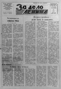 ОР ГАН СЕ В Е Р НОГ О ; Р АЙКОМА КПСС И Р АЙОННОГ О СОВЕТА НА Р ОД НЫХ Д Е ПУТАТ ОВ НОВ ОСИБ ИР С КОЙ ОБЛАСТИ Выходит по вторникам, ч о в е р г а м и субботам. Га зета основана 20 и ю л я 193$ го д а № 59 (6283) ВТОРНИК 17 МАЯ 1988 года Цена 3 коп. П е р е с т р о й к а — дело всех и каждого Четырнадцатая конференция РКП(б) 27 — 29 апреля 1925 г. Успешное осуществление разработанной В. И. Лениным новой экономической политики вело к быстрому х о з г /Ь т в е н н р м у в о з р о ж д е нию Советской страны. Н ародное хо зяйство при бли жалось по многим й о к а з а - телям к довоенному уровню. У крепились органы Советской власти, выросл а партия, главным образом за счет передовых, наиболее созн ательных рабочих. Менялось и международное положение СССР. Иностранные государства н а ч и нали устан а вли в а т ь с Советским Союзом нормальны е политические и экономические отношения. В этих новых условиях, когда на очередь дня в ы двинулись зад ачи соц иали стической реконструкции народного хозяйства, претворения в жи зн ь лени нского п л ан а построения социал и зм а в СССР, в аж н ейш ее 'значен ие приобрел вопрос о п е р сп ек т и в ах ■социалис-' тического строительства. Определение путей к социализму стало основным пунктом повестки д н я XIV конференции РКП(б). р н а состоялась в Москве. На ней присутствовали 178 д е легатов с р ешающим и 392 — с совещательным голосом. Повестка дня: 1) парти й- 17> о р г а н и за ц и о н н ы е вопросы; 2) о кооперации; 3) о сельскохозяйственном налоге; 4) о металлопромышленности; 5) о расширенном пленуме ИККИ; 6) о революционной законности. По первому вопросу была п р и н я т а р езолюция «О п а р тийном строительстве», ко тор ая предусматривала необходимость усиления ру ководства массовыми орган и з ац и ям и трудящ и х с я к а к в городе, так и в деревне, укр еп ление коммунистических ф р а к ц и й в Советах, профсою зах , кооперативных органах, увеличение п а р ти й ного я д р а в комсомоле. Большое внимание у д е л я лось партийной работе на селе. В резолюции «О кооперации» к онф е р енц ия определила конкретные пути р а з ви ти я всех видов ко операции: сельскохозяйственной, кредитной, промысловой и потребительской. К онф ер енц ия п р и н я л а резолюцию «О едином с ел ь скохозяйственном налоге», .предусматривающую у л у ч шение системы прямого обл о ж е н и я кр естьян, с н и ж е ние налогов для бедняков и увеличение его д л я к у л а ц к о - з а ж и т о ч н ы х слоев. В ажн ейш им решением конференции было у т в е р ж дение тезисов ЦК о з а д а ч а х Коминте рна и РКП(б). В тезис ах подчеркивалось ленинское положение о том, что в Советском Союзе есть все необходимое д л я построения социализма. Р еш е н и я четырнадцатом конференции РКП (б) о возможности построения социализм а в СССР стали п а р тийным законом для к а ж дого ч лена партии. Они нанесли сокруш ител ьный удар всем маловерам и к а пи тулянтам , вдохновили з а рубежных коммунистов, р а бочие массы во всем мире на поддержку Советского Союза, на борьбу против империализма. Живем мы сегодня в сл ож ное и интересное время. Определены стратегические и т а к т и ч е с к и е н а п р а в л е н и я перестройки, принято множество постановлений п а р т и и и п р а ви т ел ь с т в а , н о р м ативных документов. Н а ч а лся второй этап, к а к его н а зы в аю т — этап п р а к ти ч е ск и х действий. Перестройка з а т р о ну л а интересы миллионов людей. Вот тут -то и началось: к аж ды й 