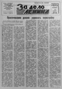 2 VCGZZZCCCSZZZZSC^^ « З А Д Е Л О Л Е Н И Н А » u rz z z io c z rz x z rT T ja z c c c ^ JVs ] 34 (6358) iu нииири 1эоо ю д а . Практическими делами укреплять перестройку (Продолжение. Нач на 1-й стр) Промышленными пр едприятиями района не обеспечен прирост объемов пр оизводства промышленной продукции, а также ее реализиции. План трех лет двенадцатой пятилетки выполнен л ес хо зом , л ес п р о м х о з ом , м еж хоз яйс тв ен ным л есхозом . Н а этих предприятиях в ся дополнительная к план у продукция будет получена за счет роста производительности труда . План выполняется по всем основным видам. У л у ч ш и л в теку щем году работу кирпичный завод (Л яхнович М . П . ) . И м ре ализовано продукции свер х плана на 14 тыс. рублей . О д нако в работе промышленных предприятий есть еще много недостатков. В текущем году снизили свои показатели к у ро вню прошлого года л е спромхоз и межхозяйственный л е с х о з . В л еспромхоз е пониз и л а сь пр оизводительность т руда до 9 4 , 7 процента , а среднемесячная заработная плата возросла на 11,4 пр оцента. Большинство руководителей, секретарей партийных организаций не поняли жизненную необходимост ь перехода на интенсивный п уть развития в новых экономических у с л о виях хозяйствования. Неудовлетворительно с р а ботали предприятия торговли. Пл ан товарооборота 1987 года выполнен на 9 5 , 5 процента, а текущего года на 9 7 , 8 процента . И м е ю т с я недостатки в работе предприятий общественного питания, постоянная нехватка кадров, недостаточный ассортимент изделий, низкое качество приготовления блюд и о б сл уж и в а ния посетителей. Правлению райпо необходимо внедрять новые формы торговли, у л у ч шать к у л ь т у р у об служи вания , укомплектовывать все торговые точки квалифицированными кадрами, больше уделять внимания об служи ванию м а лочисленных сел. Ст а б и л ь н о выполнило план оказания у с л у г населению районное производственное у п р а в ление бытового обслуживания. Однако у сл у г и выполняются только по 8 — 9 видам из 18. М н ого нареканий от населения на работу фотоателье, ремонт бытовой техники, ча со в, обуви и т. д. Не оказывают помощи партийные организации, руководители колхозов в подборе кадров для комплексно -приемных п у н ктов, в ремонте помещений, обеспечении топливом. Д в ен адц ат ая пятилетка была объявлена пятилеткой строительства ж и лья и объектов со цк ул ьтбы та . Районный комитет партии направлял внимание партийных ор ганизаций, со ве тски х и хозяй ствен ных органов на увеличение объемов капитального строит ел ьства , со кращение сроков и улучш ение качества. З а годы двенадцатой пятилетки введены в эксплуатацию : взлетно -посадочная по лоса и централ ьная районная больница, уни в ер сам и п р оф т ех училище в С е в е р н о м , школа на 192 у ч ащ и х с я в с. Коб. К о рд он , у час тк ов ая больница и детский сад в В е р х -К р а с н о яр ке, детсад и Д о м к у л ь т у ры в с. О с та ии н к а , школа в с. У д ар ни к и 80 д в ух к в ар т и р ных ж и лы х домов. В районе ежегодно осваивается на новое строительст во около 5 млн . рубл ей , но план по освоению капитальных вложений не выполняется . В большинстве колхозов не со зд аны строительные бригады. Неуд овл етвори тел ьно осва иваю тся капитальные вложения и несвоевременно вводятся жилые дома в э к с п л у атацию . А к т и в н о ведут строительство ж и лья л е спромх оз , а г р о п р ом х им и я , Д Р С У ч , колхоз « П а м я т ь Ленина» . О д н 
