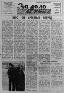 О РГАН С Е В Е Р Н О Г О Р АЙ К ОМ А КПСС И Р А Й О Н Н О Г О СОВЕТА Н А РО Д Н Ы Х Д Е П У Т А Т О В Н О В О С И Б И Р С К О Й ОБЛАСТИ В ы х о д и т по в т о р н и к ам , ч е т в е р г а м и с у б б с т а м . Газета о с н о в а н а 20 и ю л я 1935 г о д а № 139 (6 3 6 3 ) СУББОТА 1 9 Н О Я Б РЯ 1988 г о д а Цена 3 коп. КУРС- НА АРЕНДНЫЙ ПОДРЯД Новые формы организации труда в сельском хозяйстве, зародившись уже в ходе перестройки агропрома, быстро доказали свою высокую э ф фективность, зарекомендовали себя как действенный инструмент совершенствования производственных отношений на селе, способный вернуть з ем ле настоящего полноправного хозяина. Новые формы не с р а зу прижились у нас. Как известно, первый коллектив интенсивного труда (КИТ) был со здан лишь в прошлом году в колхозе «Восход». По окончании сельскохозяйствен ного года здесь подвели итоги, которые показали, что р е з у л ь т а ты работы КИТа по всем пар ам етр ам превосходят среднеколхозные. На Ш базе этого хозяйства провели семинар с руководителями и специалистами колхозов. И вот уже к весне этого года почти во всех хо зяйствах были организованы КИТы. В некоторых хозяйствах пошли и дальше — начали вн едрять и коллективный подряд. Об этом и шел разговор на рабочем совещании КИТов и подрядных звеньев. Н а него были т акж е приглашены председатели и специалисты колхозов, председатели с ел ь ских Советов, с екр е тари партийных организаций, руководители обслуживающих предприятий РАПО. Совещание о т к ры л первый с е к р е т а р ь райкома партии А. В. Федулов. В своей вступительной речи он подчеркнул, что интерес к арендному подряду в • * селах области растет. И надо смелее вн едрять эту передовую форму и в нашем р ай оне. Аренда в ы р аж а е т экономические отношения, когда арендатор берет в длительное пользование з а определенную плату у колхоза в аренду или землю, или скот, или технику с целью з н а чительного увеличения производства продукции, повышения ее качества, эф ф ек ти в ного использования основных средств и ресурсов. Д ал е е А. В. Федулов сообщил, что нашей области, а значит и всем районам на 1989 год увеличены планы производства и продажи государству сельхозпродукц ии. И зад ан ия эти мы сможем выполнить прим еня я лишь передовые формы организации труда. П р ед сед ател ь РАПО Г. Г. Зы р я н о в подвел итоги работы полеводов и животноводов. Подробно дал ан ализ работы КИТов по во зделыванию з е р новых и силосных культур. Сравнил их работу с подрядными звеньями. Р а с с к а з а л об итогах работы колхозов. И, конечно же, ратовал з а перестройку производственных отношений на селе, о переходе на новые формы оплаты т р у да и т. д. На данном совещании присутствовал М. Ю. Лангер — пр едседатель колхоза «К р а с н а я з в е з д а » , пр едседатель сов ета РАПО Кыштовского р ай она. Его выступление было прослушан о с большим инте- ресом^ Дело в том, что этот колхоз полностью перешел на арендный подряд. И потому пс^ле выступления, и в перер ы в а х совещания нашему гостю зад а в а ло с ь множество вопросов. Надо отметить, что это совещание действительно было рабочим, деловым. Люди с а ми поднимались на трибуну и р а с с к а зы в а л и о своей р а боте, о трудовом коллективе, выносили предложения, вы с к а зы в а ли замечания. Например, предс едатель ко л х о зу « З а в е т ы Ильича» М. Е. Оку- нев так и з а я в и л , что пока они не перейдут, пусть даже отдельными производств