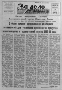 ОРГАН СЕВЕРНОГО РАЙКОМА КПСС И РАЙОННОГО СОВЕТА НАРОДНЫХ ДЕПУТАТОВ НОВОСИБИ РСКОЙ ОБЛАСТИ Выходит по вторникам, четвергам и суббстам. Пролетарий всех стран, соединяйтесь! д е л о Газета основана 20 июля 1935 года № 142 (6 3 6 6 ) С У Б Б О Т А 26 НОЯБРЯ 1988 года Цена 3 коп. Письмо Центрального Комитета Коммунистической партии Советского Союза коммунистам, т р уж е н и к ам ф ерм , всем работникам О более агропромышленного комплекса страны полном использовании имеющихся возможностей для увеличения производства продуктов животноводства в осенне-зимний период 1988-89 года У важаемы е товарищи! Успех перестройки наш л народ во многом с вязывае т » с решением продовольственного вопроса. Общество остро нуждается в том, чтобы ра- ботинки агропромышленного комплекса в ближайшее вр е мя дали больше продуктов питания и лучшего качества. Продвижение в этом направлении есть. В период, прошедший после майского ( 1 9 8 2 г.) Пленума ЦК КПСС, душевое потребление мяс а и мясопродуктов повысилось на 6 килограммов, молока и молочных продуктов — на 48 килограммов, яиц — более чем на 20 штук при еж е годном росте населения с т р а ны на 2 , 6 млн. человек. В настоящее время, исходя из установок XXVII съ е зд а КПСС и XIX Всесоюзной па р тийной конференции, определены ключевые направления ■вг работы в области сельского хозяйства и связан ных с ним отраслей. В их числе внедрение новых методов хозяйствования, освоение интенсивных технологий, социальное переустройство деревни, создание современной индустрии переработки, хранения и сбыта сельскохозяйственной продукции. Практическое осуществление намеченных планов позволит увеличить продовольственные ресурсы страны, улучшить питание населения. Предстоящий в на чале 1989 года Пленум ЦК КПСС в комплексе рассмотри т основные вопросы аграрной политики. Сегодня речь идет о наших неотложных заботах. Продовольственное снабжение во многих районах страны остает с я одной из самых острых проблем. В ряде регионов производство молока и мяса растет медленно, а кое-где даже снижается . Это относится в первую очередь к Таджикистану, Калмыкии, Башкирии, Красноярскому краю, Псковской, Калининградской , Днепропетровской, Николаевской и некоторым другим областям. На Украине, в К азахстане, Северной Осетии, Архангельской , Омской, Сахалинской областях, ряде других мест немало хозяйств уже сейчас, в осенние месяца, снизили производство молока и привесы животных, допустили необоснованное сокращение поголовья скота. Н апряж ен ная обстановка сложилас ь с обеспечением животноводства кормами. Из- з а сильной засухи в Поволжье, на Урале, в Западной Сибири и Казахстане, а т ак же в ре зул ь т а те серьезных упущений в кормопроизводстве, нарушения технологий во многих хозяйствах страны меньше прошлогоднего заго товлено сена, сенажа, силоса. Дело усугубляется и тем, что не удалось получить необходимого количества зерн офу ража . Потребуется значи тельно больше усилий, чтобы не допустить снижения продуктивности животноводства, произвести больше, чем в предыдущий период, мяса, молока и яиц. В этих услови ях Ц ентраль ный Комитет партии счел необходимым обратиться к коммунистам, труженикам ферм, всем работникам агропромышленного комплекса страны с призывом максимально ис пользовать все р е з е р в ы и возможности для н а р ащ ив ания производства животноводч