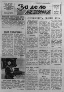 ОРГАН С Е ВЕ РН О ГО РАЙКОМА КПСС И РАЙОННОГО СОВЕТА НА РО ДНЫ Х ДЕПУТАТОВ Н О В О СИ Б И РС КО Й ОБЛАСТИ Выходит по вторникам, четвергам и с у б б с т а м . Проле тарий все» отдан, соединяйтесь! а де/ю Газета основана 20 июля 1935 года № 147 (6 3 7 1 ) ЧЕТВЕРГ 8 Д Е К А Б Р Я 1 9 8 8 г о д а Цена 3 коп. ОБРАЗОВАНИЕ ИЗБИРАТЕЛЬНЫХ ОКРУГОВ ПО ВЫБОРАМ НАРОДНЫХ ДЕПУТАТОВ СССР Центральная и збирательная комиссия по выборам народных деп утатов СССР своими постановлениями от 6 д е к а б р я о б р а з о в а л а избирательные округа по выборам народных д е п утатов СССР. В соответствии со статьями 15 и 16 З а к о н а СССР «О выборах народных д е п утатов СССР» о бра зов аны 750 территориальных избирательных округов, в соответствии со статьями 15 и 17 этого З а к о н а — 750 национально-территориальных избирательных округов. (Т А С С ) СТАНУТ ТРЁХТЫСЯЧНИЦАМИ В последние годы животноводы района как-то постоянно снижали показатели, и лишь воспоминания о ставались от тех времен, когда доярки получали от коровы по три тысячи и более к и л о граммов молока. Часто на зы вали имена бывших передовиков, но достичь прежних результатов не могли. Но нынче положение стало меняться к лучшему на многих ф ерм ах района. Кормов заготовлено больше, а значит и продукции прибавилось. Об этом говорят и итоги одиннадцати месяцев работы ж и вотноводов. Наметились кандидатуры доярок, которые выйдут на трехтысячный рубеж. Первыми «ласточками» должны стать Т. Г. М азурина из колхоза «П амять Ленина» и Л. Ф. Тихонова из колхоза «Путь к коммунизму». Т ам а р а Григорьевна уже надоила от коровы по 2 9 2 8 килограммов молока, а з а прошедший месяц надой в ее группе составил 171 килограмм. Нетрудно подсчитать, что декабрь принесет Т. Г. Мазуриной ожидаемую победу, рожденную в ” честном Добросовестном , 'труде. Лидия Филипповна работает на Кордоновской ферме, которая длительное время занимает первые места в социалистическом соревновании животноводов колхоза «Путь к коммунизму». Поэтому неудивительно, что именно здесь появится нынче доярка , получившая от коровы по три тысячи килограммов молока. Д л я этого Л. Ф. Тихоновой в декабре необходимо надоить от коровы по 9 2 килограмма молока, что несомненно будет обеспечено, так как в ноябре она получила по 111 килограммов. Р а с т у т надои и у Н. Б. Б а лахоновой, В. С. Подскребы- шевой, П. М. Ковган, О. Е. Коржовой. И поэтому есть надежда, что в будущем году число трехтысячниц в н а шем районе значительно пополнится. С. СЕМЕНОВА. Валентина Григорьевна Прокофьева трудится в швейном цехе Дома быта. Здесь ее рабочее место, которое не меняет она уже в течение многих лет. Валентина Григорьевна квали фицированныи специалист своего дела, она мастер-закройщш легкого платья, член бригады Н. Н. Бершадской. Е. Прокофьева постоянно совершенствует свои профес- сиональные знания, очень ответственно и добросовестно от носится к выполнению каждого заказа, основное внимание — на качество изделий. А их бывает немало, особенно в пред праздничные недели. И все заказы бригада старается испот нить в срок. Во многом это зависит и от коммуниста В Г Прокофьевой (на снимке). Фото С. Федорова. СПЕЦИАЛИСТЫ СВОЕГО ДЕЛА Трудовые будни изо дня в день выявляют передовиков колхозного производства, людей, для которых среднерайонные показатели — не предел возможности. Если сегодня они получили привес или надой выше вчерашне