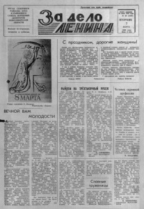 ОРГАН С Е ВЕ РН О Г О РАЙКОМА КПСС И РАЙО ННО ГО СОВЕТА Н А РО ДНЫ Х ДЕ П У ТА Т О В Н О В О СИ Б И РС КО Й ОБЛАСТИ Выходит по вторникам, четвергам и с у б б о т а м . Пролетарии всех стран, соединяйтесь! дело Газета основана 20 июля 1935 года № 2 9 (6 4 0 9 ) ВТОРНИК 7 МАРТА 1989 г о д а Цена 3 кон. f Плакат художника Э Килдеску. Издательство! «Плакат» В Е Ч Н О Й В А М М О Л О Д О С Т И щтлыи праздник приходит—к людям с весной — Международный женский день 8 Марта — праздник интернациональной солидар ности всех женщин планеты. З а истекшие годы м еж ду народной женское движение выросло в могучую силу, которая активно выступает в общей борьбе народов за мир, цр(отив угрозы термоя д е р н о й еЬйшТ Цель это г0 движения сегодня — объединить усилия женщин в борьбе з а правовое и ф ак тич еское равноправие, за полную ликвидацию их дискриминации. Великий Октябрь, партия Ленина впервые дали во зможность и реальные гарантии женщине ст ать хозяйкой собственной судьбы, полноправной участницей социально - экономических преобра зований, открыли широкий Доступ к образованию, науке, культуре, к управлению государством. Образовател ьный уровень советских женщин выше, чем у мужчин. Среди специалистов с высшим и средним спе циальным образованием их 60 процентов. В настоящее время свыше полумиллиона женщин руководят предприятиями, учреждениями, организациями. В народном хозяйстве женщины составляют половину всех работающих. В нашем районе женщины занимают ведущее место в народном образовании, здравоохранении. сфере обслуживания. В отр асл ях сельскохозяйственного производства, таких к ак животноводство, где высока дол я ручного труда, в основном, заняты женщины. Сегодня нель зя не назвать доярок Там ару Григорьевну Мазурину из колхоз а «П амять Ленина» и Лидию Филипповну Тихонову из колхоза «Путь к коммунизму», которые в 1988 году по надоям молока на ф у ражную корову перешагнули трехтысячный рубеж. Близки к этому' рубежу Н ат ал ья Борисовна Балахонова и Ольга Николаевна Шафико- ва. Первый арендный коллектив на животноводческой ферме возглавляет Ольга Ефимович Коржова — доярка колхоза «VII съ езд Советов». Эти примеры являются подтверждением слов А лек сея Максимовича Горького: «Надо хорошо понять и помнить, что без женщины не во зм ожна осуществление социализма». Женщина — великое слово. В ней чистота девушки, в ней самоотверженность подруги, в ней подвиг матери В 1988 году Указом Президиума Верховного Совета СС С Р от 15 ф е в р а л я Валентине Афанась евне Моисеевой присвоено звание Мать- героиня с вручением ордена «Мать героиня» . Орденом «М атеринская слава» II степени на гр ажд ена Надежда Елисеевна Долнер. М едалями «Медаль материнства» I степени — двое, II степени — одиннадцать. Социалиста ческое общество н ужд а ется в высокой культуре и пор я дочности человеческих взаи моотношений, в укреплении семьи. В решении этих вопросов роль женщины н е з а м е нима. Б е з женщины з а р я и веч ер жизни были бы беспомощны, а ее полдень — без радости. Вечной вам молодости, счастья! С праздником, доро ги е женщины! Завтра все прогрессивное человечество отмечает Международный женский день 8 Марта. Особенность праздника в этом году состоит в том, что от констатации повышения роли женщины в жизни страны наше обществ^ все больше переходит к пониманию и решению тех проблем, которые в тесной связи 