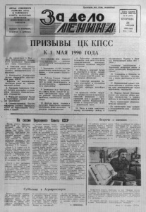 И— г а в и и м и I ■г » ! 1Г| i l i T i Газета основана 2 0 июля 1935 года № 49 (6 5 8 5 ) ВТОРНИК 2 4 АПРЕЛЯ 1990 года Цена 3 коп. ОРГАН СЕВЕРНОГО РАЙКОМА КПСС И РАЙОННОГО СОВЕТА НАРОДНЫХ ДЕПУТАТОВ НОВОСИБИРСКОЙ ОБЛАСТИ Выходит по вторникам, четвергам я субботам, i Пролетарии всех стран, соединяйтесь! ПРИЗЫВЫ ЦК КПСС К 1 МАЯ 1990 ГОДА 1. Д а здравствует 1 Мая — j День международной 'с олидарности трудящихся! Пролетарии всех стран, соединяйтесь! 2. Советские люди! Объединим усилия для созидания гуманного, демократического социализма! 3. Коммунисты! Конкретными делами утверждайте а в а н г а р д ную роль КПСС! Боритесь з а консолидацию партийных рядов иа принципиальной основе! 4. Граждане Советского Союза! Активно участвуйте в становлении правового социалистического государства! 5. Народные депутаты! Честно и ответственно служите интересам трудящихся! 6. Соотечественники! Окажем поддержку усилиям Президента СССР по нормализации обс та новки в стране! Консолидация всех здоровых перестроечных сил — гарантия необратимости демократических процессов! 7. Трудящиеся СССР! Ускорим радикальную экономическую реформу — залог нашего благосостояния! 8. Рабочие Страны Советов! Партия коммунистов рассчитывает на вашу сознательность и организованность, преданность делу перестройки! 9. Труженики села! Претворяйте в жизнь З акон о земле! От в а шего крестьянского труда з а в и сит решение продовольственной проблемы, благополучие каждой семьи! 10. Д еятели науки, техники и культуры! Перестройке жизненно необходимы ваши интеллект и духовное подвижничество! 11. Работники кооперативов! Умножайте свой вклад в развитие социалистической экономики, обеспечение населения товарами и услугами! 12. Юноши и девушки! Активно участвуйте в труде, о в л а д е вайте знаниями, учитесь у п р а в лять государством! В ваших руках будущее Отечества! 13. Советские женщины! Активно участвуйте в обновлении советского общества! Растите крепкую достойную смену! 14. Граждане СССР! Коренное преобразование и упрочнение советской федерации — магистральный путь к расцвету всех народов страны! Националистическим и сепаратистским силам — решительное «нет». 15. Честь и с ла в а советскому народу, отстоявшему свободу и независимость Родины в Великой Отечественной войне 1941 — 1945гг.! \ ч Сердечные поздравления с Первомаем ветеранам войны и труда, доблестным Вооруженным Силам! 16. Солидарны с борцами за социальный прогресс, дем о кр а тию и пра ва трудящихся во всем мире! 17. Первомайский привет коммунистическим и рабочим партиям, всем демократическим силам зарубежных государств! 18. Народы Земли! Умножим усилия для решения общих проблем человечества, в защите свободы и достоинства личности! Пусть торжествуют общечеловеческие ценности! Д а здравствуют мир, доверие и сотрудничество всех народов планеты! На сессии Верховного Совета СССР Москва . (ТАСС). Верховный Совет ССС Р ,на совместных за с е д ан и я х п а л а т 17 и 18 а п р е л я рас см а трив ал вопрос, который у ж е долгое в р ем я б у д о р а ж и т общ ес твенн ое мнение страны . О б с у ж д а л с я отчет созд анной решением первого С ъ е з д а народных д еп у т а т о в СССР комиссии по проверке м а т е р и а л о в , связ ан ны х с д е я тельностью следст венной г р у п пы П р о к у р а т у ры СССР , в о з г л а в л я е м о й Т X. Гдляном’. Имена Т, X. Гдляна и Н. В. 11вапова стали шцроко известны в период ра 