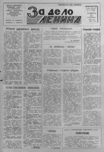 О Р Г А Н С Е В Е Р Н О Г О Р А Й К О М А К П С С И Р А Й О Н Н О Г О С О В Е Т А НАР ОДНЫХ , ' Д Е П У Т А Т О В Н О В О С И Б И Р С К О Й О Б Л А С Т И Выходит по вторникам, четверг ам и с убботам. 20 июля 1935 года Газета основана № 114 ( 6 6 5 0 ) С У Б Б О Т А 22 С Е Н Т Я Б Р Я 1 9 9 0 года Цена 3 коп. П р о л е т а р ии всех стран , соединяйтесь! л е л о Итоги ударных декад С В Е Р Х ГОСЗАКАЗА Колхоз имени М. Горького справился с планом с д а чи молока государству. С 13 сентября хозяйство приступило к сверхплановой продаже продукции. Поздравляю всех работников животноводства е досрочным выполнением г ос з а к а з а и благодарю их за честный и добросовестный труд. Н. Б У Г А Е В , председатель колхоза ЗА П О М О Щ Ь - З Е Р Н О Во время уборки урожая постоянно не х в а т а е т рабочих рук на сушилке. Зерно идет, его приходится постоянно лопатить, чтобы не согревалось, нагру жать машины. . . Короче г о в о ря, дел на сушилке предостаточно. И как хорошо, что на помощь всегда приходят пенсионеры. Вот и в эти дни на ви- тннской сушилке работали Елиз а в е т а Степановна Краснова, Елена Николаевна Орлова. Варвара Семеновна М а твеез а и Прасковья Сергеевна Антипина. Причем, их, по сути де- ла, и не просили — сами предложили свои услуги. Надо сказать , что правление колхоза «Восход» положительно оценило работу пенсионеров и решило поощрить в сех , кто помогал колхозу в дни хле бо уборки —- выдать по д ва центнера зерна бесплатно. С. ОРЛОВ . Районка — газета общая Прошли д ве ударные д е к а ды на уборке урожая. Совет РАПО н президиум райкома профсоюза работников АПК ‘рассмотрели итоги социалистического соревнования между коллективами колхозов и з в е н ь ев на уборке зерновых и силосных культур и постановили: Первенство присудить коллективу колхоза «Борьба за мир», закончившему y6opKV зерновых н силосных культур, полностью засыпавшему семена, вспахавшему 70 0 гектаров зяби — это 34 процента к плану. Коллектив этого хозяйства наградить Почетной грамотой п денежными премиями: председателя колхоза в размере 100 рублей, главного агронома и главного инженера по 80 рублей, глапного экономиста и глазного бух галтера по 50 рублей. Р асчет произвести из централизованного ф о н д а РАПО. Второе место присудить коллективу колхоза «ПамятьЛенина», убравшему зерновые и силосные культуры, интенсивно ведущему засыпку доброка явственных семян и вспашку зяби. Коллектив этого хозяйства наградить Почетной грамотой н денежными премиями: председателя колхоза в размере 80 рублей, главного агронома и главного инженера — по 60 рублей, глазно го экономиста и главного бухгалтера по 40 ру блей. Третье место присудить коллективу колхоза имени ЧХП съезда КПСС, выполнившему О том, как проходит убэркя в колхозе «Заветы Ильича», рассказы вает главный агроном хозяйства Владимир Дмитриевич Авласенко. — Владимир Дмитриевич, как вы относитесь к новым формам организации труда? — Аренда — это высокая организация труда, колхозная прибыль, дисциплина. Считаю, что арендные отношения з х о зяй ствах нужно укреплять и всячески поддерживать. — К такому убеждению вы пришли на основании собственного опыта? — Конечно. Раньше хромала дисциплина. Постоянно нужно было быть толкачом. Сейчас механизаторы трудятся на с о в ес ть , им не нужно подсказыв а т ь , напоминать, л. — Считаете, им тоже по душе пришлись арендные отношения? — У них появилась заинтересованн