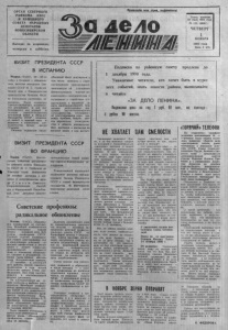 ОР ГАН С Е В Е Р НОГ О Р АЙК ОМА КПСС И РАЙОННОГ О СОВЕТА Н А Р О Д Н ЫХ Д Е ПУТАТ ОВ НО В О С И Б И Р С К О Й ОБЛАСТИ Выходит по вторникам, четвергам и с у б б о т а м. | Газета основана 20 июля 1935 года № 131 (6 6 6 7 ) ЧЕТВЕРГ 1 НОЯБ Р Я 1990 года Цена 3 коп. Пролетарии всех стран, соединяйтесь! дело ВИЗИТ ПРЕЗИДЕНТА СССР В И С П А Н ИЮ П одп и ск а на районн ую г а з е т у продлена д о 1 д е к а б р я 1 9 9 0 года. У в аж а емы е читатели, кто х о ч е т быть в курсе в с е х событий, знать новости района, выписывайте и читайте «ЗА ДЕЛО ЛЕНИНА». Подписная цена на год 1 руб. 80 коп., на полгода— 8 рубля 90 копеек. НЕ ХВАТАЕТ ВАМ СМЕЛОСТИ Мадрид. (ТАСС). 2 6 — 28 октября в Испании с официальным визитом находился П р е зидент СССР М. С. Горбатев Между ним и Председателем правительства Испании Фелипе Гонсалесом состоялись переговоры. Была подписана советско-испанская политическая д екларация . В ней подчеркивается. что первый в истории советско-испанских отношений визит в Испанию Президента СССР открывает новый и важный этап в развитии и укреплении сотрудничества между , двумя странами. Стороны подписали также Париж. (ТАСС). Центральным событием двухдневного рабочего визита Президента СССР М. С. Горбачева во Францию сталЬ пЬдписание 29 октября договора о согласии и сотрудничестве между С о ю з о м Советских Социалистических Республик и Французской Республикой. Этот документ придает Москва. (ТАСС). Образование независимой от государства Всеобщей конфедерации профессиональных союзов страны — основной итог XIX съ езд а ^ профсоюзов СССР. Главной задачей конфедерация ставит консолидацию сил и координацию действий советских профсоюзов в ре али зации и защите социально- экономических, духовных прав и интересов трудящ их ся , сказано в декларации, которую с ъ е з д принял абсолютным большинством голосоз. 27 октября , в последний день работы, форум советских профсоюзов в ходе острой дискуссии принял Устав конфедерации. При этом ра с с м а т рив ался и ал ьтернативный вариант документа. На альтернативной ж е основе состоялись выборы председ ател я Всеобщей конфедерации профессионал ьных союзов СССР и его замести теля . Председател ем союзного проф- центра подавляющим большинством голосов избран 3 П Щербаков, исполнявший до этого обязанности заместито- л я председателя упраздненного съездом ВЦСПС. Было принято положение о контрольно-ревизионной комиссии вновь образованного профцентра страны, состоя-1 лись ее выборы. объемный пакет документов, в том числе протокол о советско-испанских консультациях, меморандум об улучшении финансирования торгово эко- номическЬго сотрудничества и соглашение о содействии осуществлению и взаимной з а щите капиталовложений. Подписаны долгосрочная про грамма научно-технического сотрудничества, соглашения об урегулировании ряда правовых проблем, борьбе против наркотиков, сотрудничестве в области кинем атографии, протокол о контактах на военной линии и ряд других. принципиально новый х а р а к тер советско-французским отношениям. Торжественной церемонией подписания договора предшествовали беседы Президента ССС Р с главой французского государства Ф. Миттераном, переговоры дел егаций обеих сторон. Дел ег аты рассмотрели один из принципиальных документов форума — основные направления действий профессиональных союзов СССР из ближайший период и перспективу.